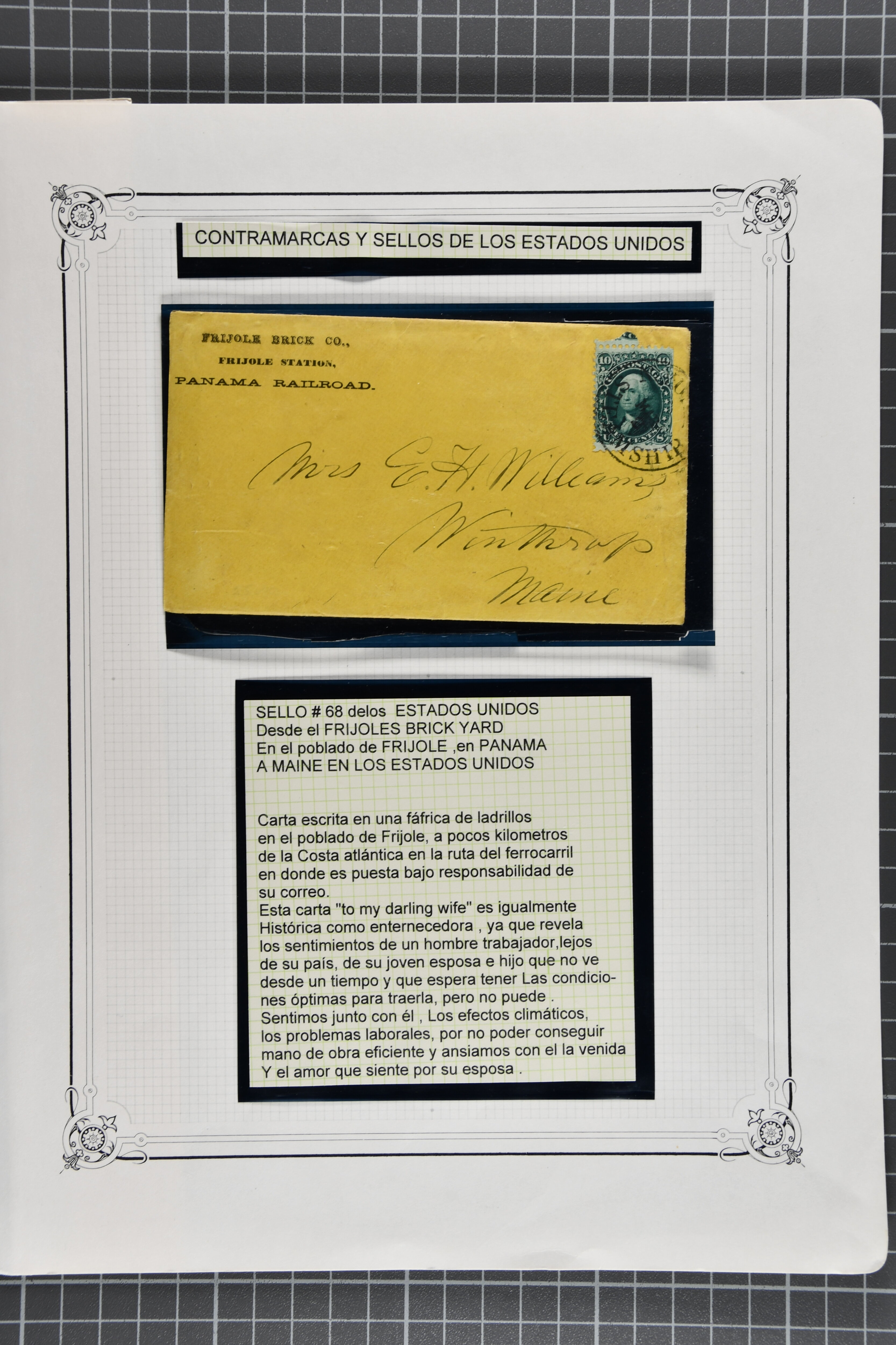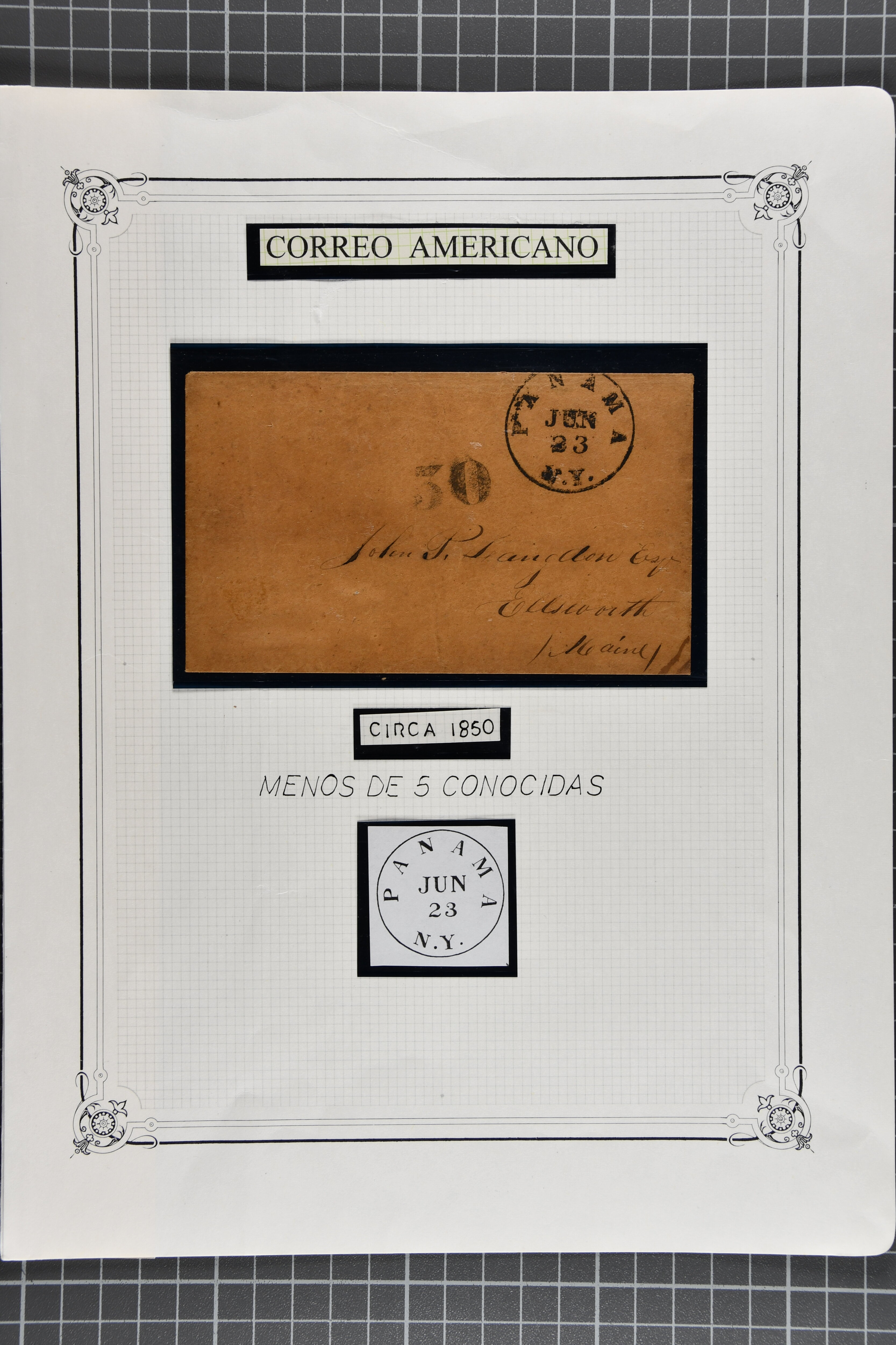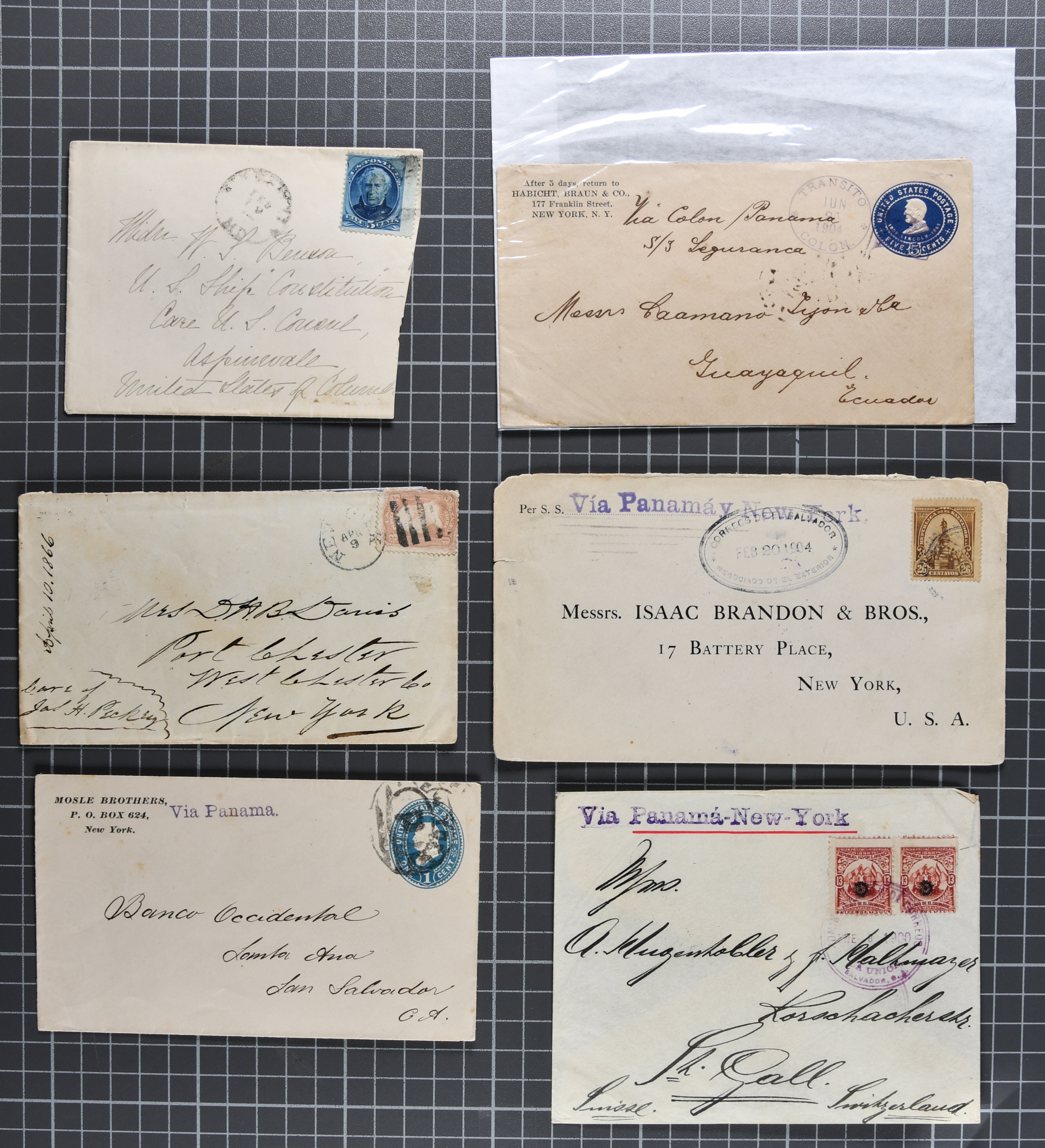 109 cover image1850/1904: Accumulation of 12 covers franked with USA postage used in Panama or mail sent via Panama forwarded to USA. Comprises 5 examples franked with US single frankings including two covers both franked with 1861-62 10 c. green, one of which contains an extensive letter from a man working in Frijole (Colon) writing back to his wife explaining the difficult circumstances for both labour and the climatic conditions. Also two USA postal stationery envelopes including a 5 c. blue sent from Colon to Ecuador and a 1 c. blue-green sent from New York to El Salvador via Panama. There is also an 1885 civil war stampless cover sent from Panama to San Francisco. Condition does vary although a scarce and interesting group. Ex the Brian Moorhouse estate. (Image 1) (Image 2) (Image 3) (Image 4) (Image 5) (Image 6)