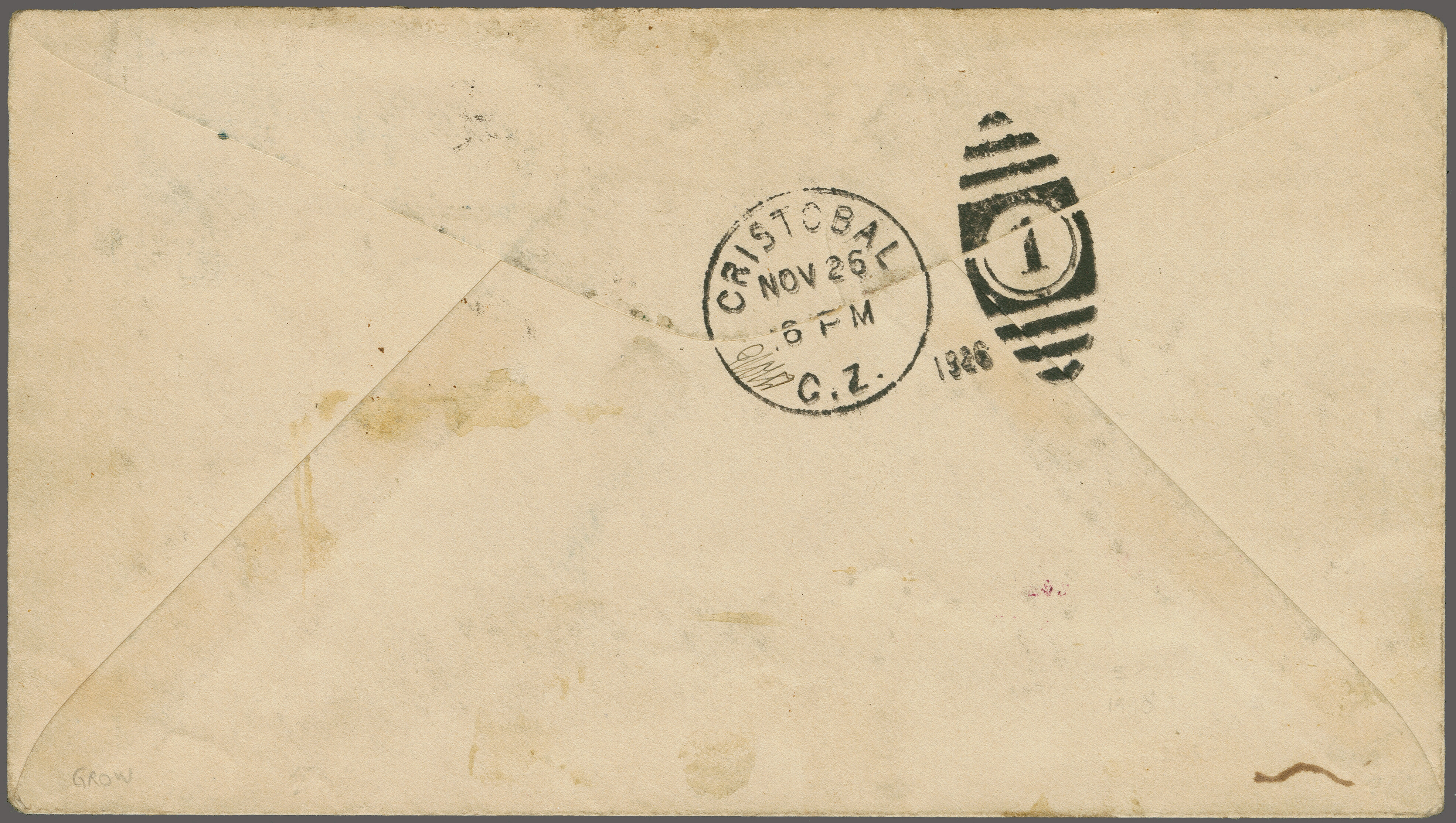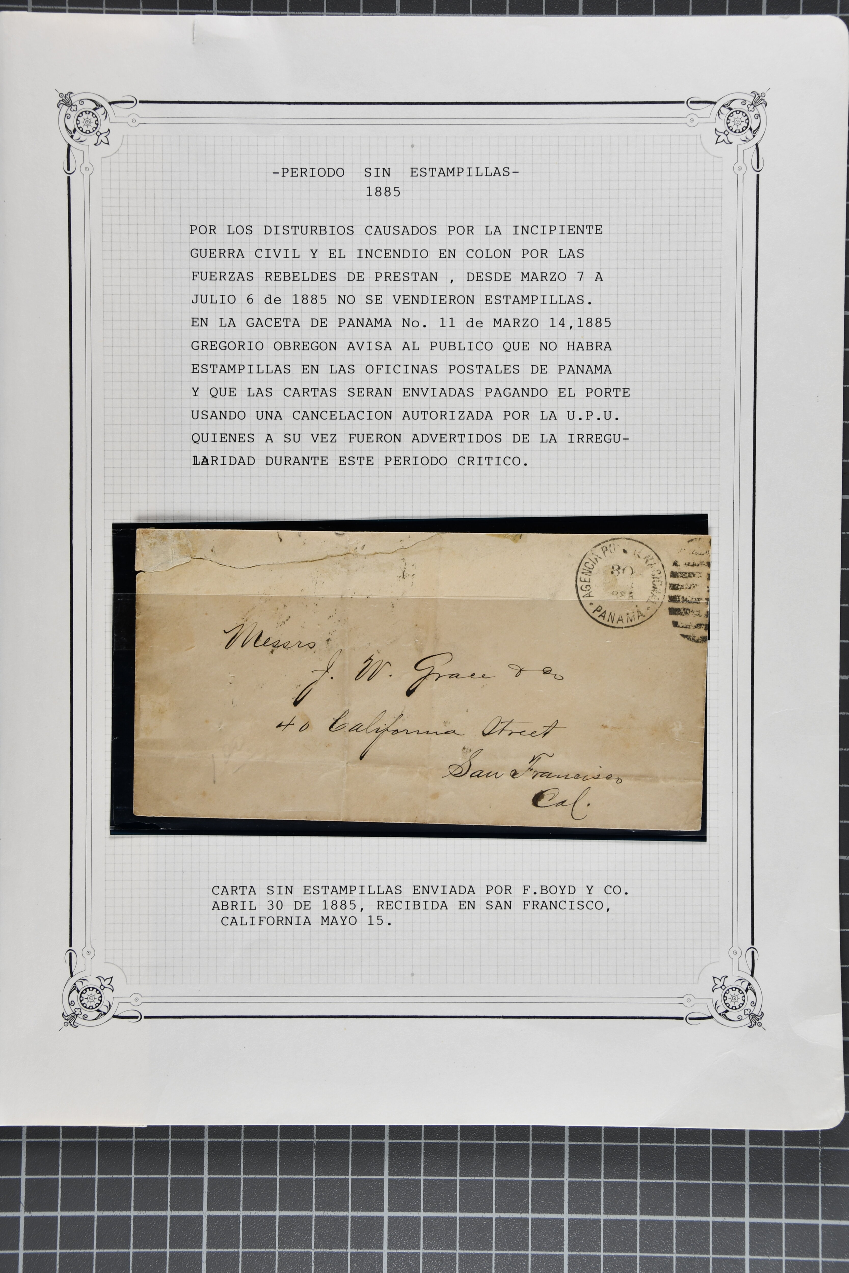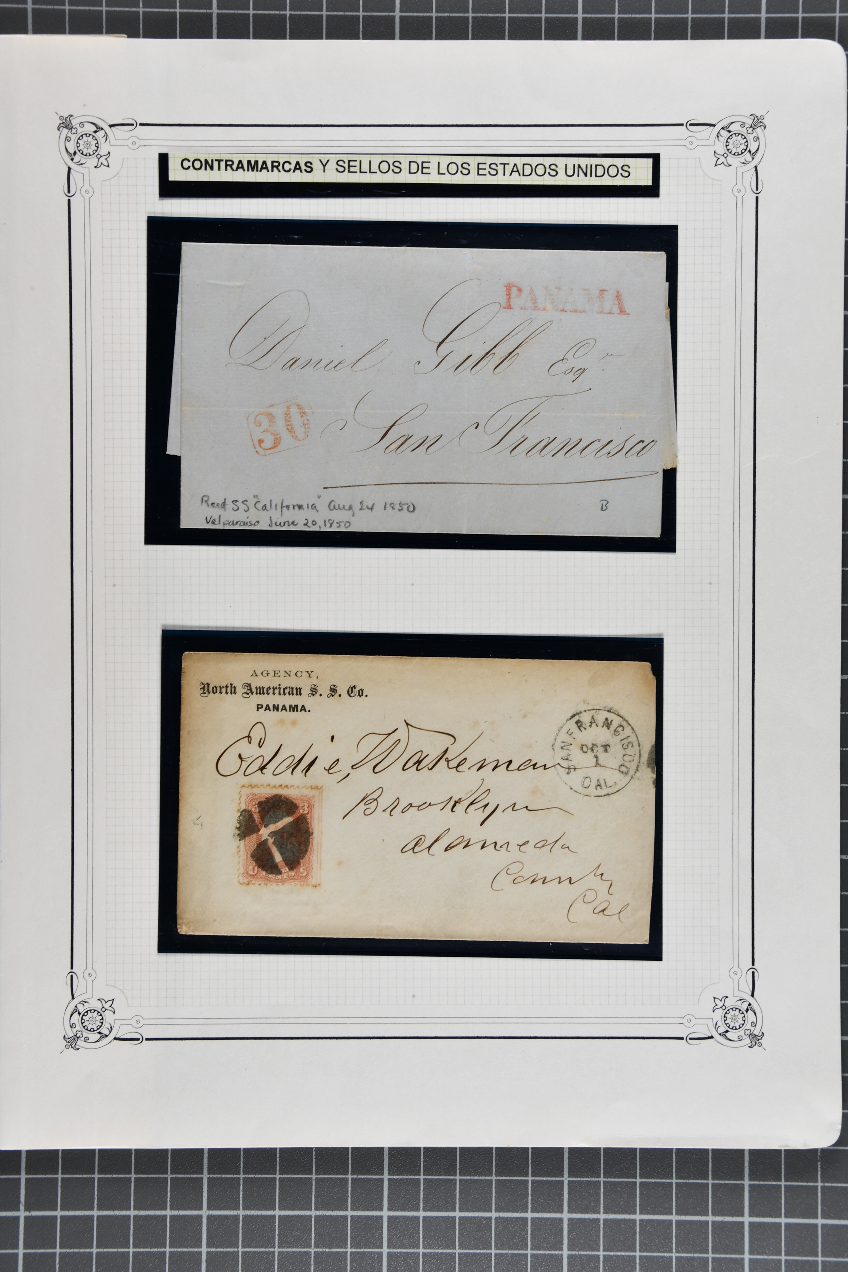 109 cover image1850/1904: Accumulation of 12 covers franked with USA postage used in Panama or mail sent via Panama forwarded to USA. Comprises 5 examples franked with US single frankings including two covers both franked with 1861-62 10 c. green, one of which contains an extensive letter from a man working in Frijole (Colon) writing back to his wife explaining the difficult circumstances for both labour and the climatic conditions. Also two USA postal stationery envelopes including a 5 c. blue sent from Colon to Ecuador and a 1 c. blue-green sent from New York to El Salvador via Panama. There is also an 1885 civil war stampless cover sent from Panama to San Francisco. Condition does vary although a scarce and interesting group. Ex the Brian Moorhouse estate. (Image 1) (Image 2) (Image 3) (Image 4) (Image 5) (Image 6)
