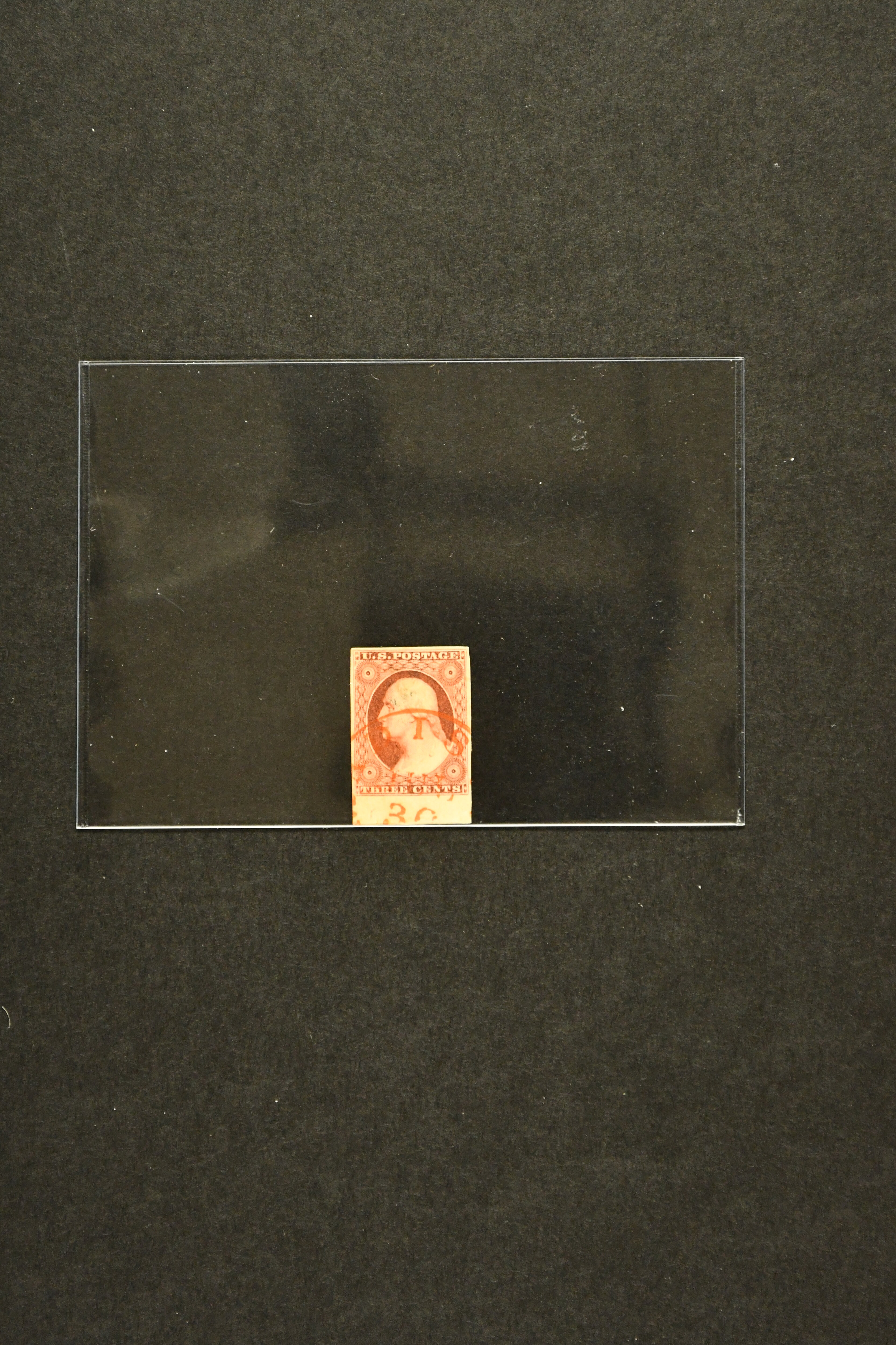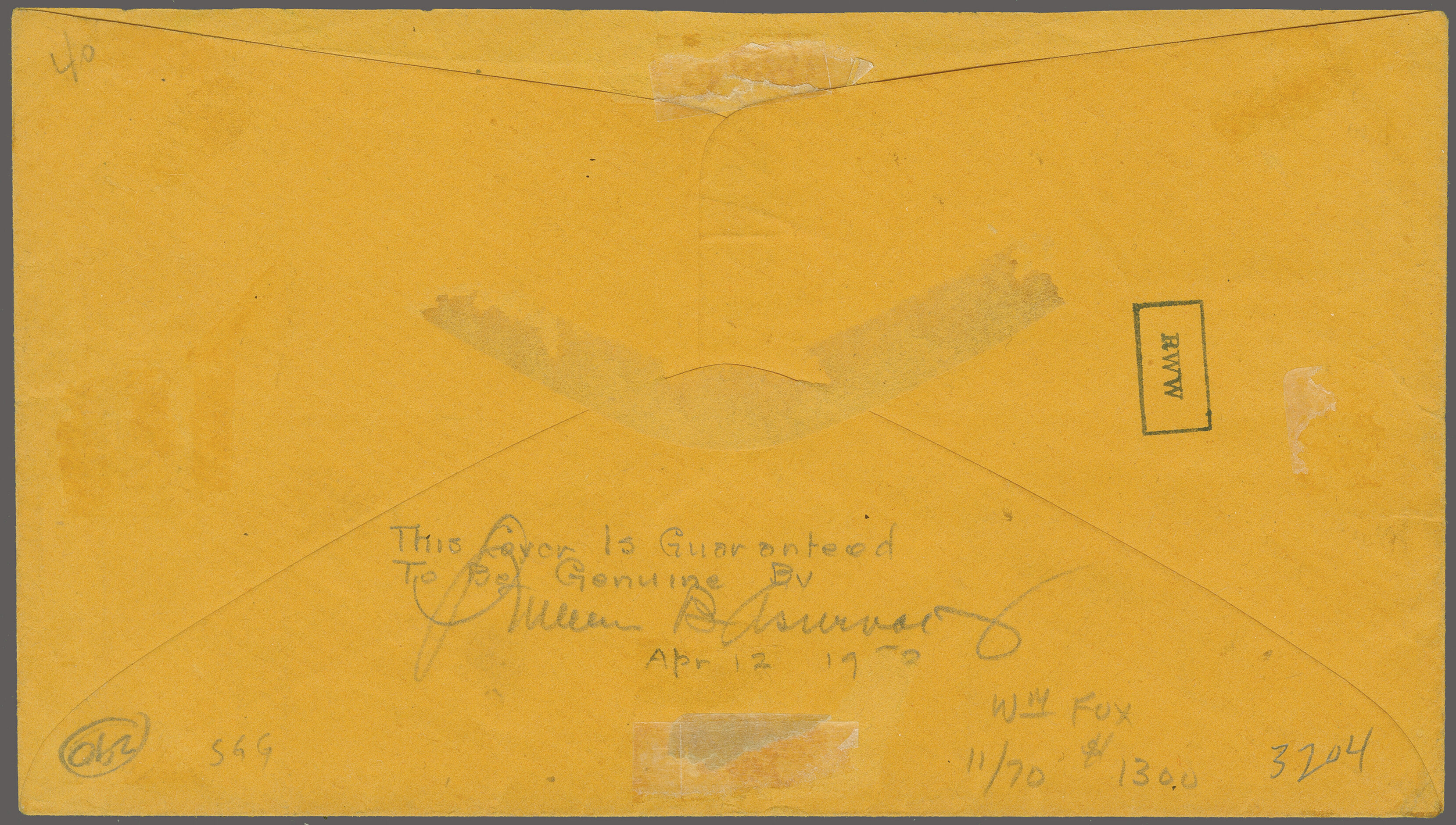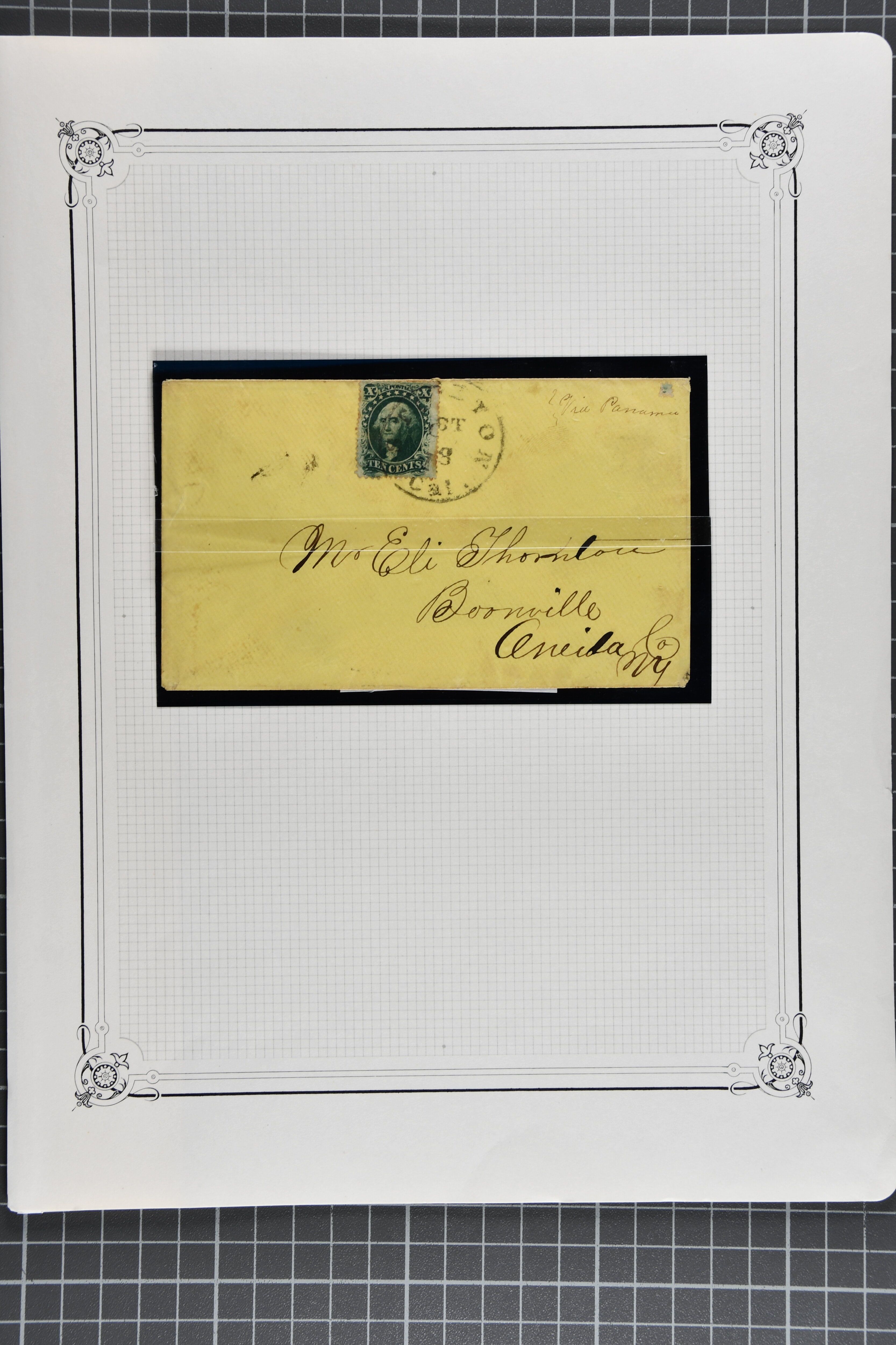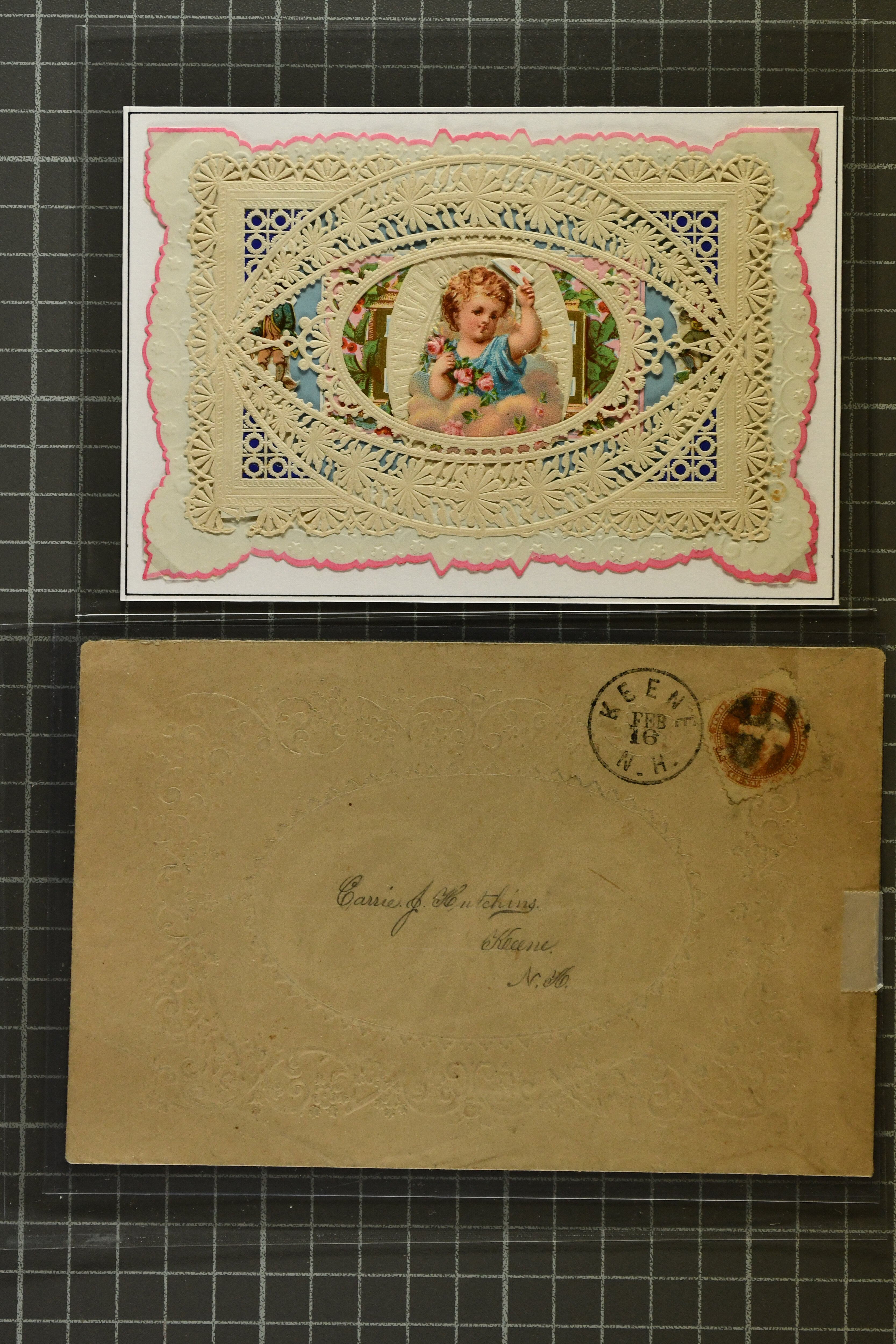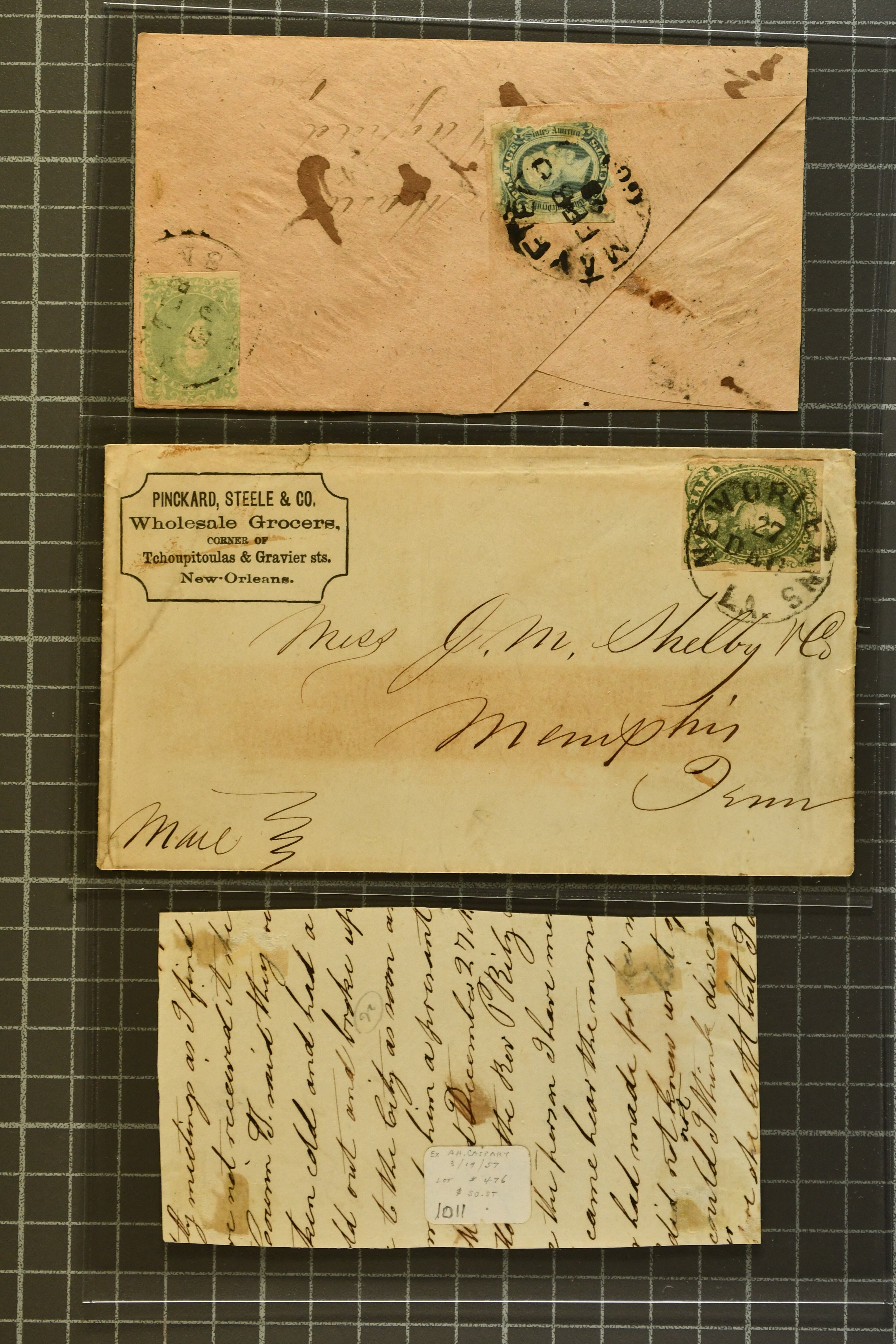 108 image1849/69: Group (5 items) with 1849/50: "U.S.P.O. / PAID / 1 Cent." black on rose Carrier label, imperforate, used on cover front to Newton, Bucks Co., PA with "PHILADELPHIA PA / 5 cts." circular datestamp in blue (Jan 19) at right (ex Collection Caspary); USA 3 c. orange-brown, Type II, imperf. marginal example (pos. 98 L2L) superb (Scott 10A), 1869 1 c. buff used on local Valentine's embossed envelope tied by "KEENE / N.H." circular datestamp (Feb 16) with complete Valentine multicoloured lace insert, Confederate States: 5 c. yellowish-green 1861, Stone 1, a fine large margined example on 1861 advertising corner envelope (Pickard & Steele & Co. / Wholesale Grocers) to Memphis tied by "NEW ORLEANS / LA." cds (Dec 27) in black; 1862 2 c. pale yellow-green used example on cover to Mayfield tied by "ATHENS / Ga." cds for circular rate; the cover turned and re-used franked by 1863 10 c. blue, sensibly folded to show both uses - the 2 c. being a very rare stamp on letter and especially so in this shade. Signed Molesworth on reverse. (Image 1) (Image 2) (Image 3)