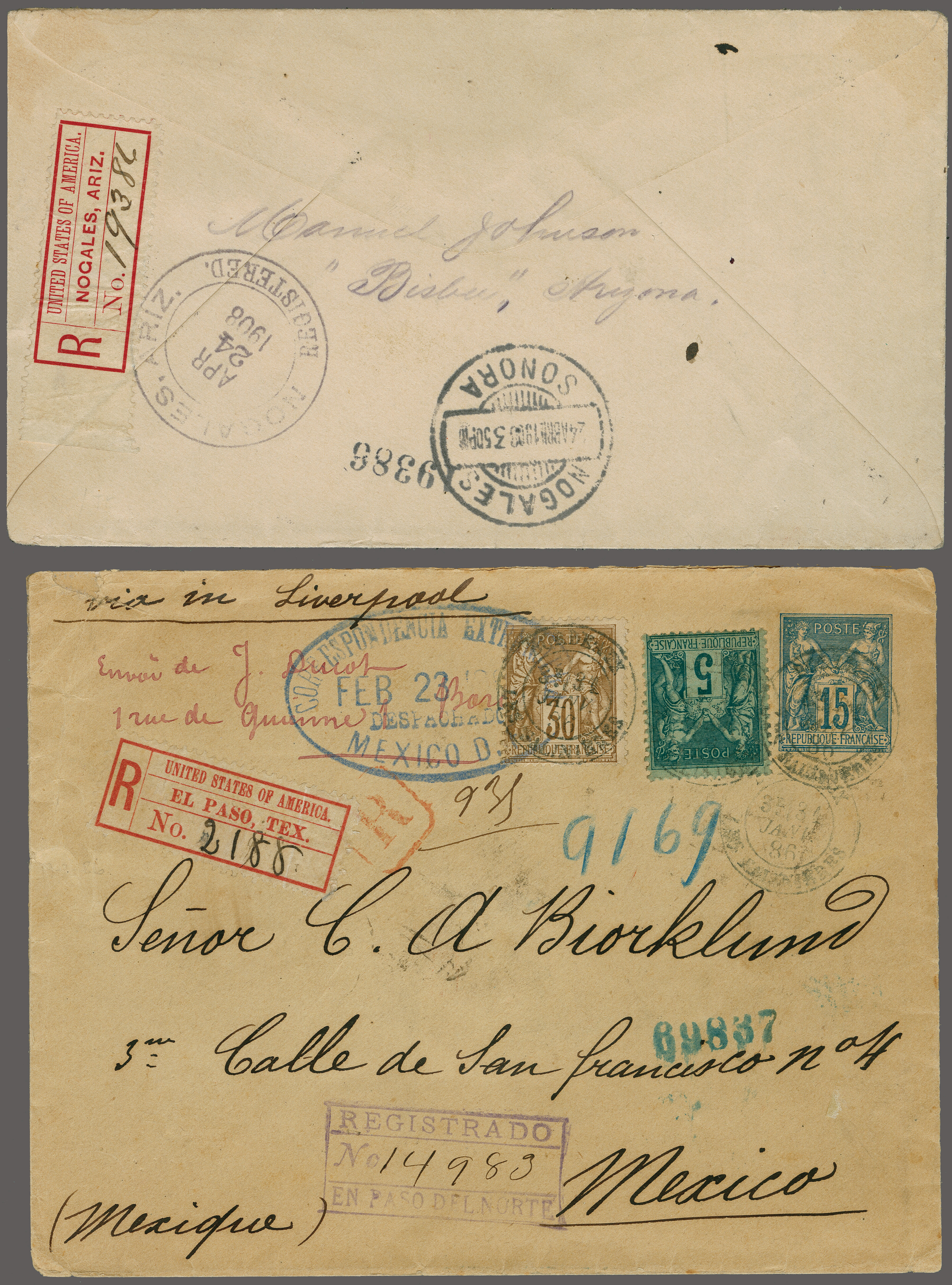 110 cover image1886/1908: Two registered covers bearing rare US transit registered labels, comprising; 1886 15 c. blue French stationery envelope uprated with 5 c. and 30 c. postage, sent from Bordeaux, France to Mexico City with added "EL PASSO, TEX." three-line registered label (has a vertical fold through 'X' where it has lifted) and a 1908 cover sent from Bisbee, Arizona to Sonora, Mexico with affixed to reverse a "NOGALES, ARIZ." transit registered label (left side marginal prefix wrinkles). Both covers have some imperfections. Rare labels. (Image 1) (Image 2)