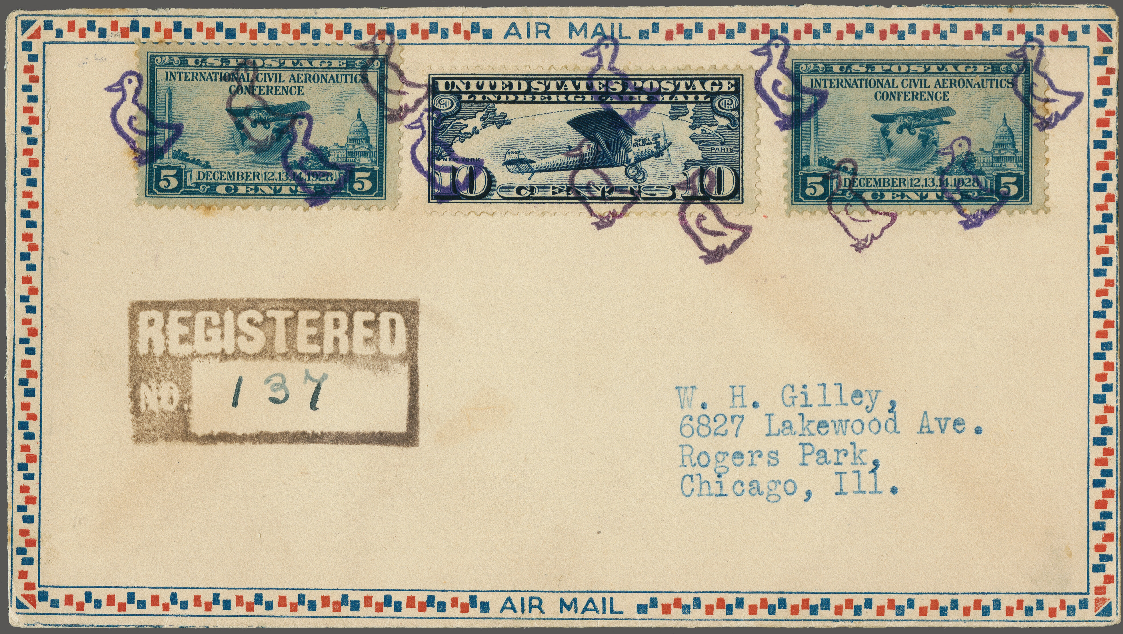 104 cover imageFancy cancels, 1929 (Nov 13): Registered cover from Duck, North Carolina to Chicago bearing 1928 Globe & Airplane 5 c. blue (2) and 1927 Linbergh's Airplane 10 c. dark blue, tied by in total 12 strikes of the Duck fancy cancel in violet, reverse with DUCK despatch and CHICAGO arrival cds's. Backflap nearly detached, nevertheless a sought after item for the Bird topical collector. (Image 1) (Image 2)