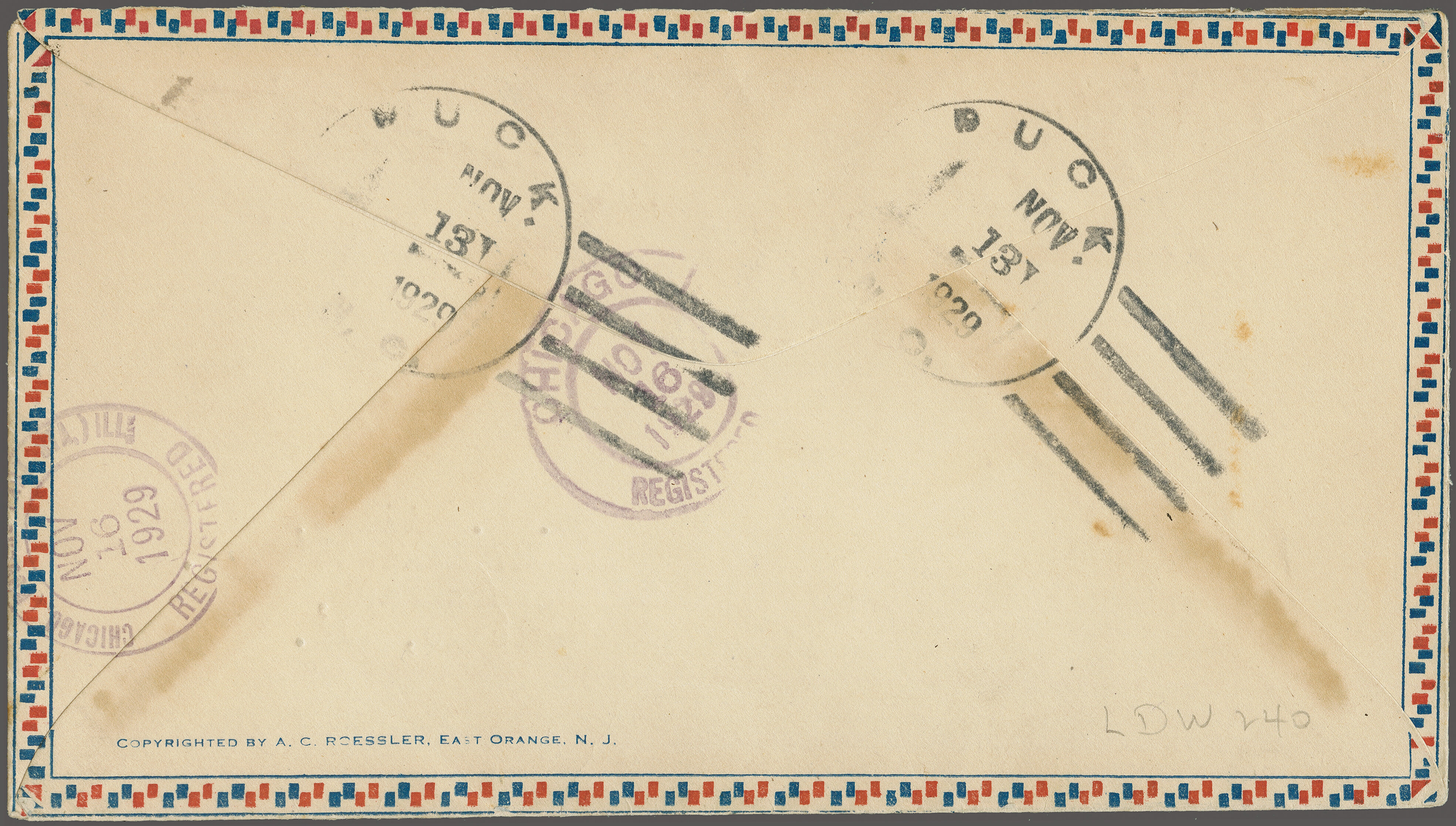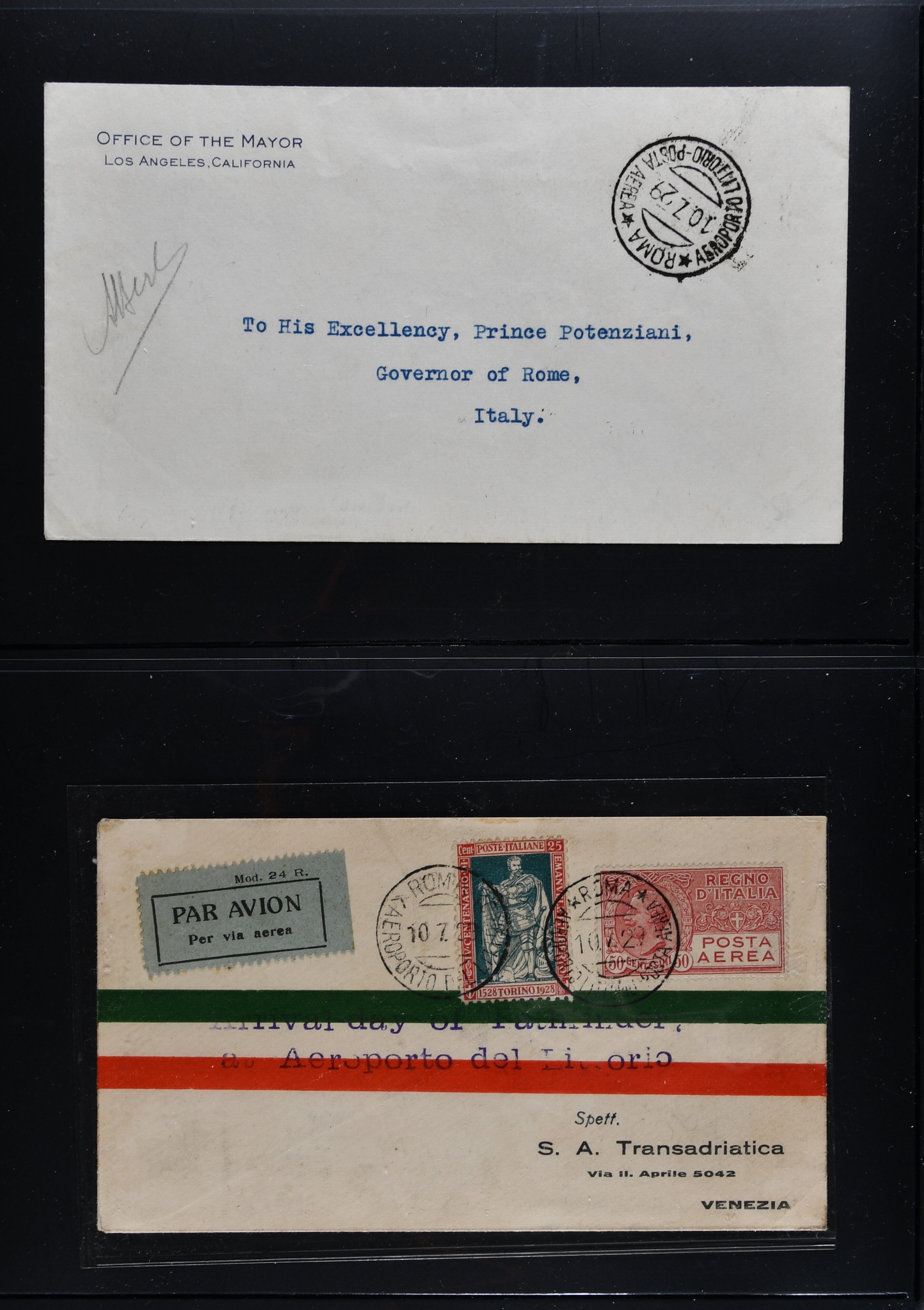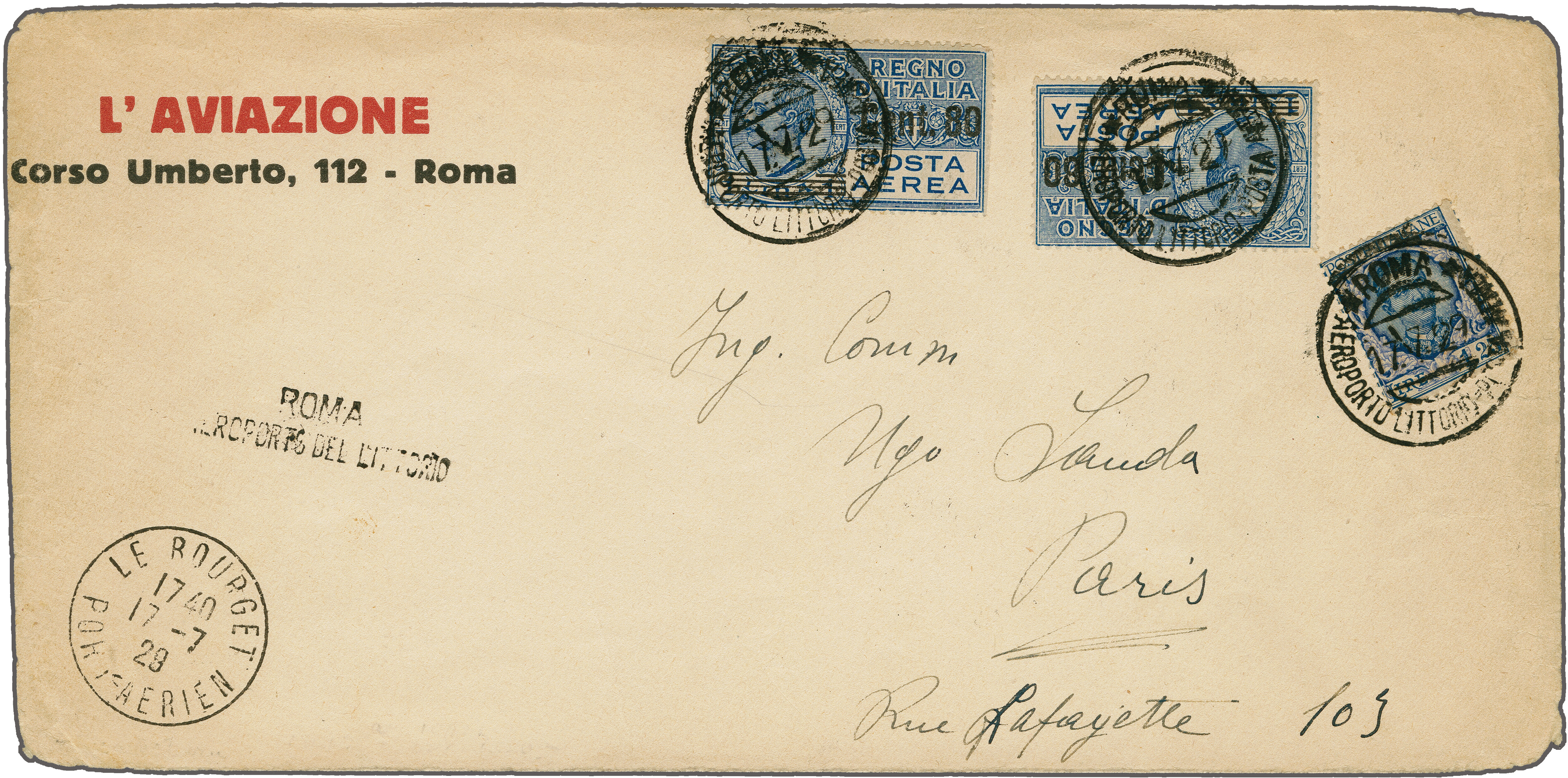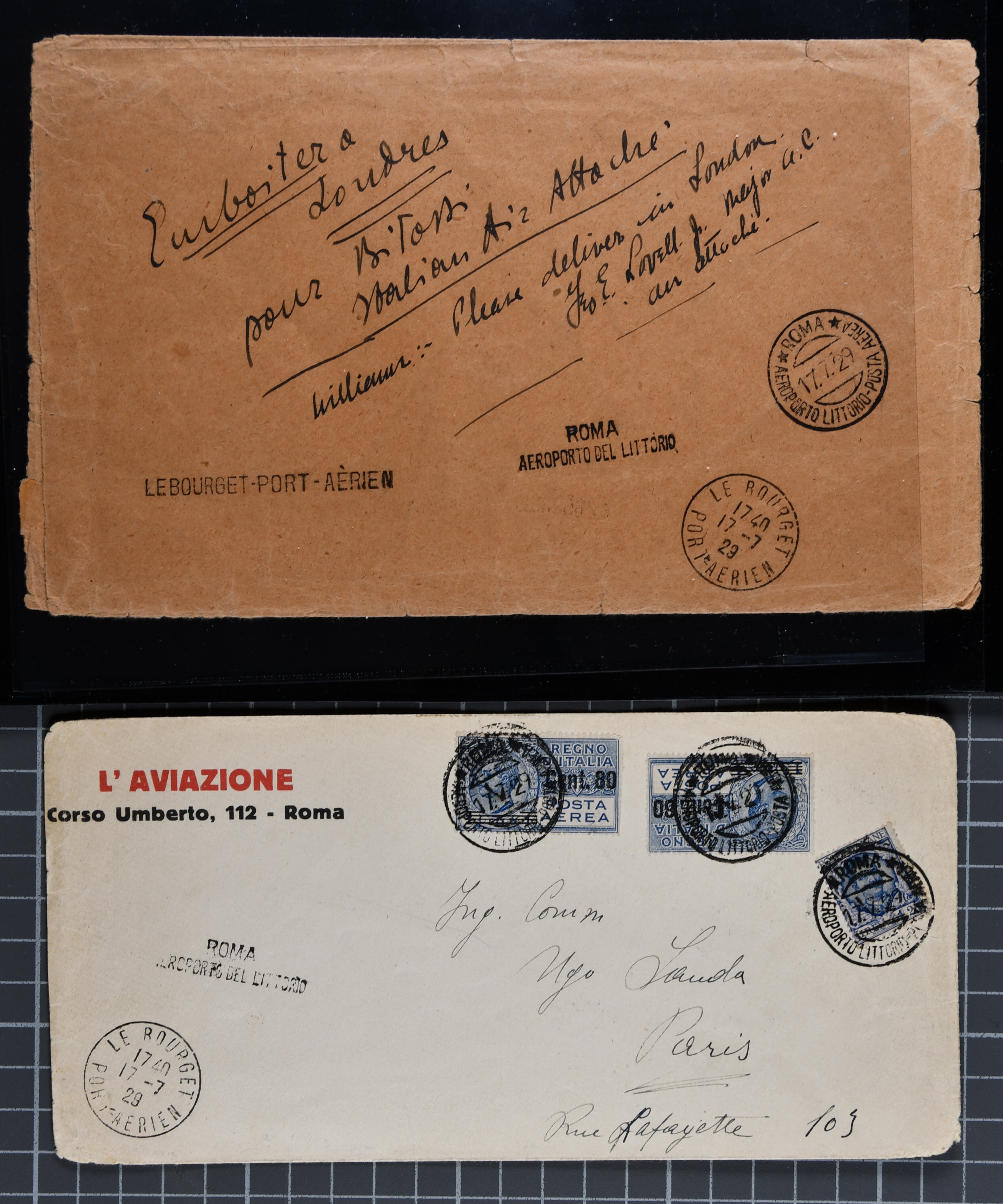 1746 cover image'Pathfinder' Flight USA-Spain-Italy-France-London 1929 (July 10./17.): Group of four envelopes, incl. unfranked official cover from the Office of the Mayor in Los Angeles addressed to the Mayor of Rome bearing Yancey’s autograph in pencil (Longhi 1938), cover of Roma – Venezia special flight to celebrate the arrival of “Pathfinder” (Longhi 1940), Rome – Paris return flight of which only 10 covers carried (Longhi 1952) as well as official Rome – London flight cover addressed to Comandante Bitossi, Italian Air Attache of the Italian Embassy in London (Longhi 1951). An extremely rare set Longhi = € 4'700 Roger Q. Williams and Capt. Lewis A. Yancey. Attempted a flight from Old Orchard to Rome in the Bellanca-J monoplane “Pathfinder”, which took off July 8th. Due to engine problems, they were forced down near Santander in Spain. After repairs, they continued the flight to Rome where they landed 72 hours after their departure. From Rome, they flew to Paris and London. (Image 1) (Image 2) (Image 3)