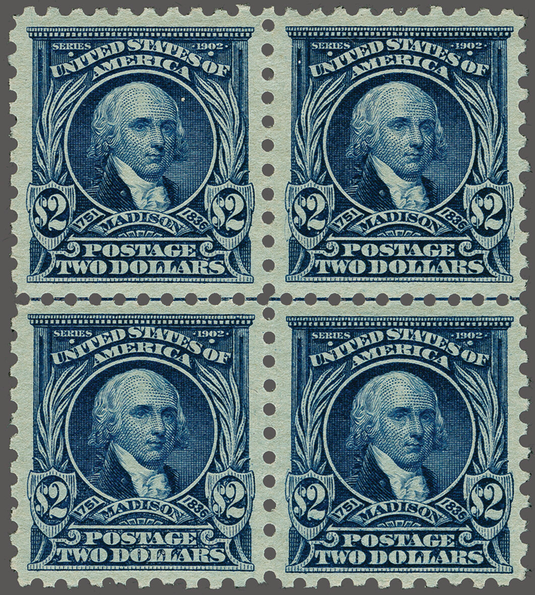102 **/*/bof image1917 (March 22): Madison $ 2 dark blue, perf. 10, no wmk., an unused block of four, well centred and of fine fresh colour, large part og. with lower pair unmounted og. Fine and most attractive multiple Scott = $ 925+. (Image 1) (Image 2)