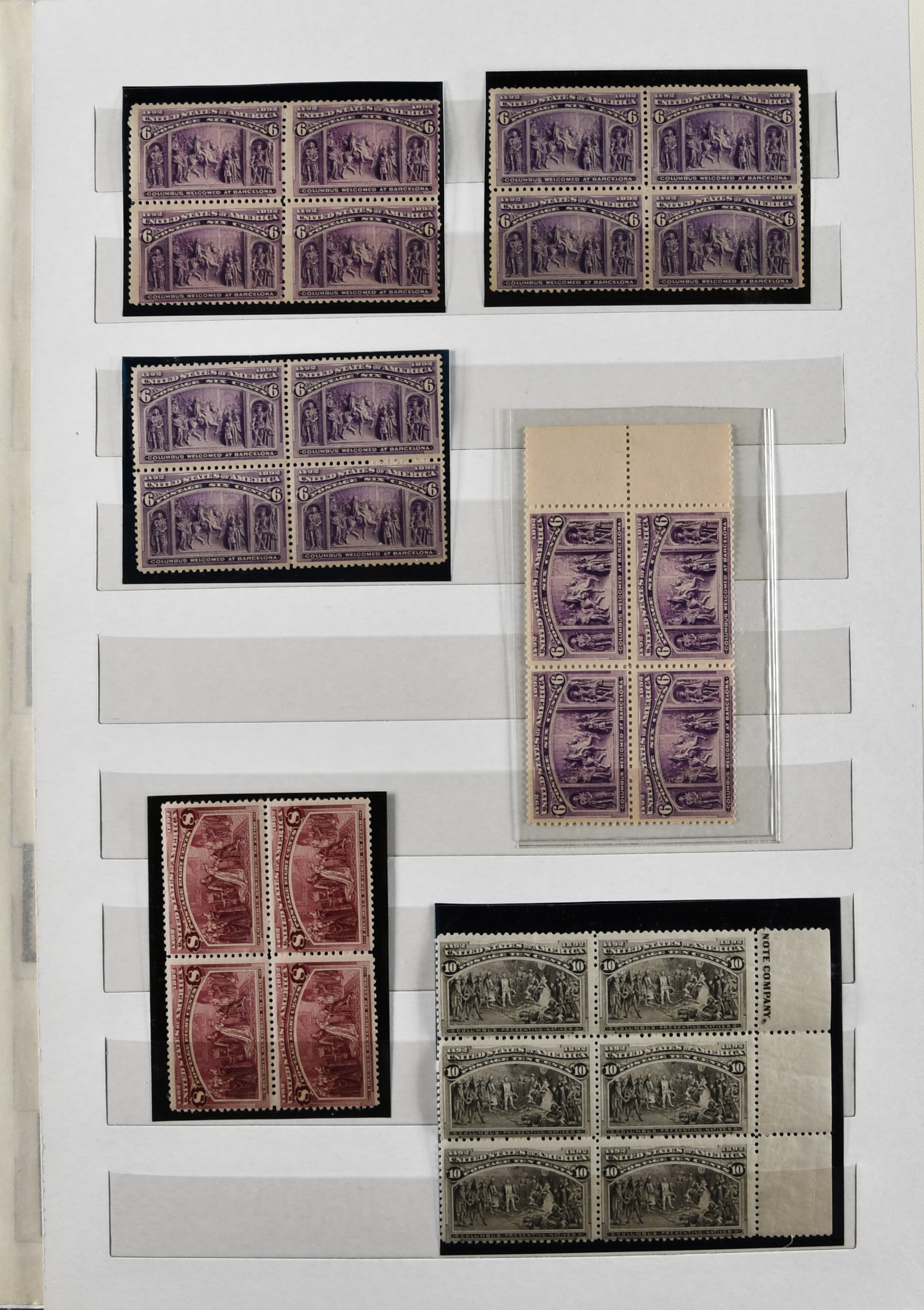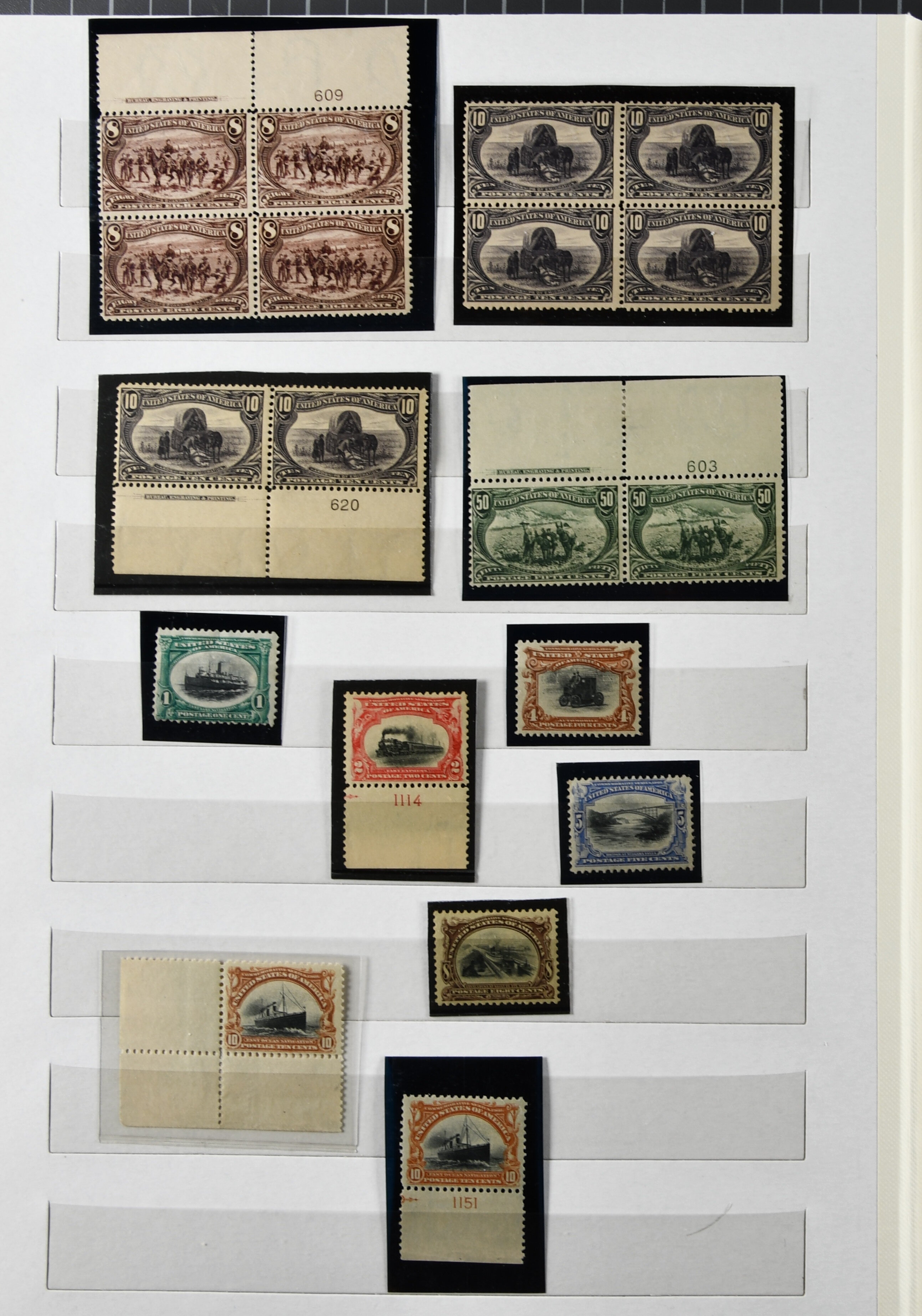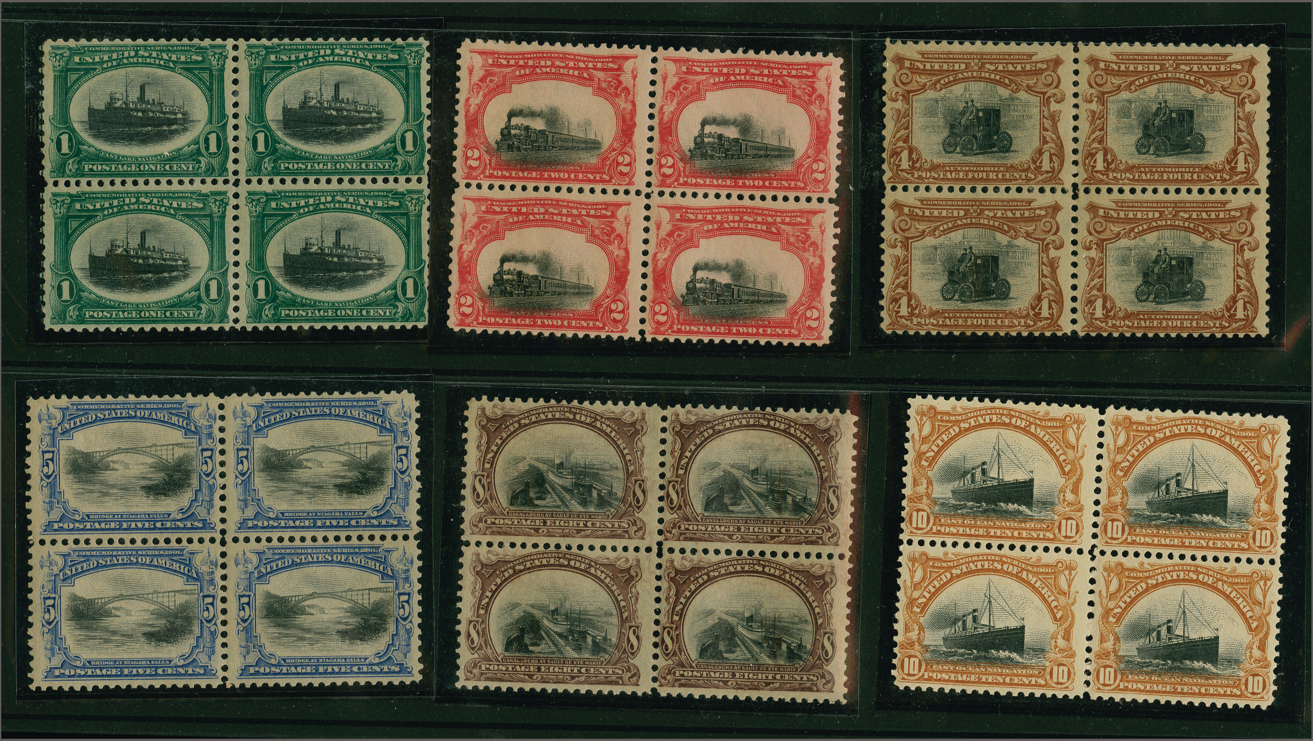 101 **/*/bof image1901 (May 1): Pan-American Exposition set of six values in unused blocks of four, all well centred and of fine fresh colour, the 4 c. deep red-brown & black large part og., the balance all fresh and fine, unmounted og. Scott = $ 3'200+. (Image 1) (Image 2)