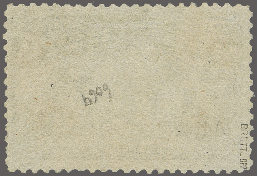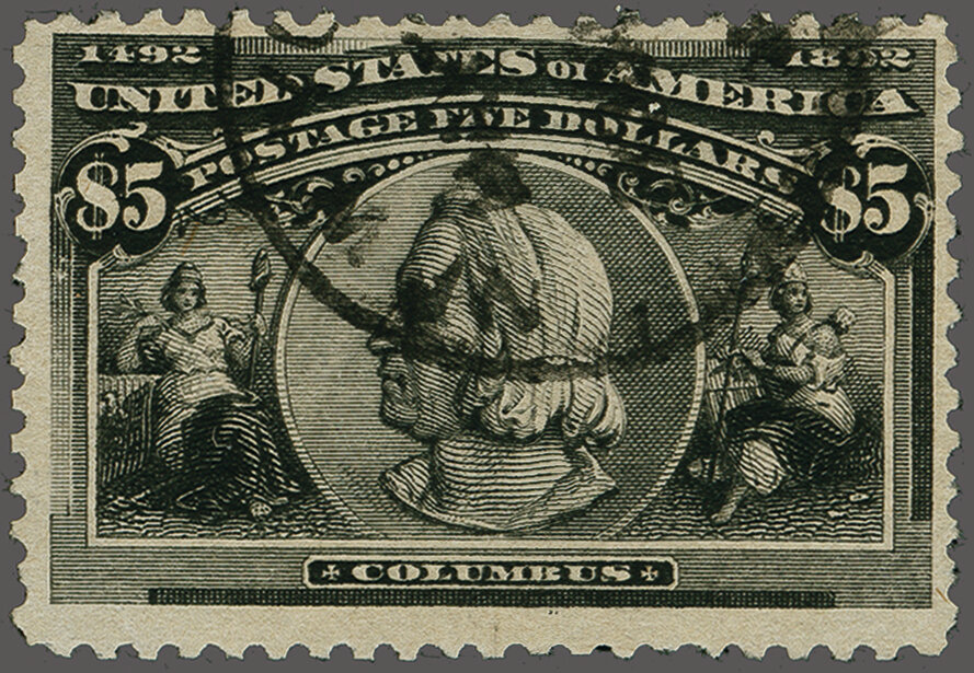 100 image1893 (March 24): Columbus $ 5 black, a used example of good colour, lightly cancelled by circular datestamp in black. A scarce stamp. Signed Brettl BPP Scott = $ 1'200. (Image 1) (Image 2)