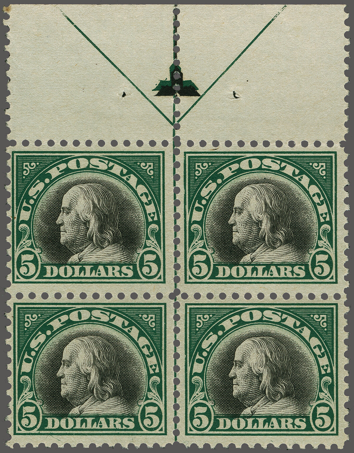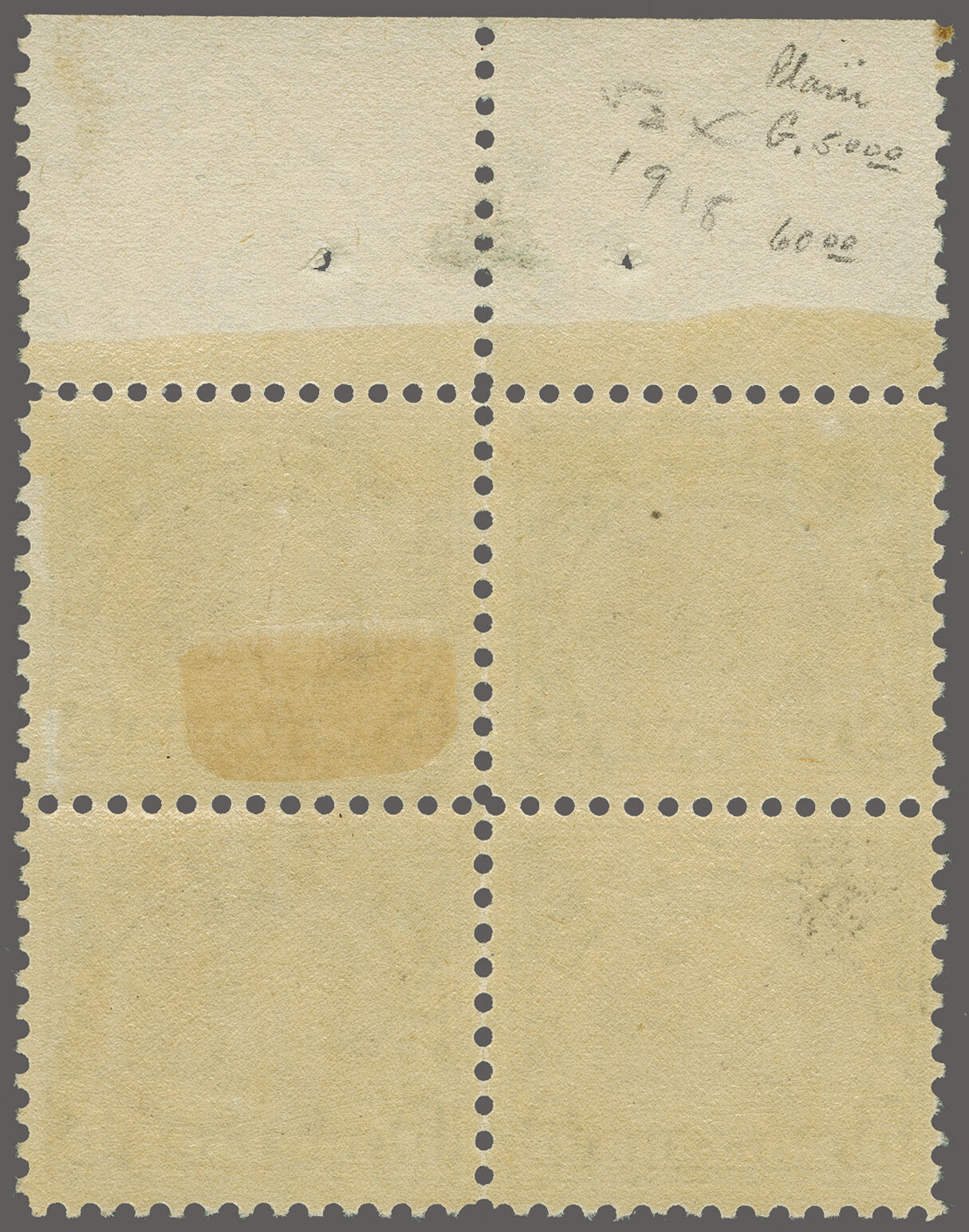 103 **/*/bof image1918 (Aug): $ 5 deep green & black, an unused block of four with marginal centreline at top, fresh and very fine with large part og. and three stamps unmounted og. Scarce Scott = $ 975. (Image 1) (Image 2)
