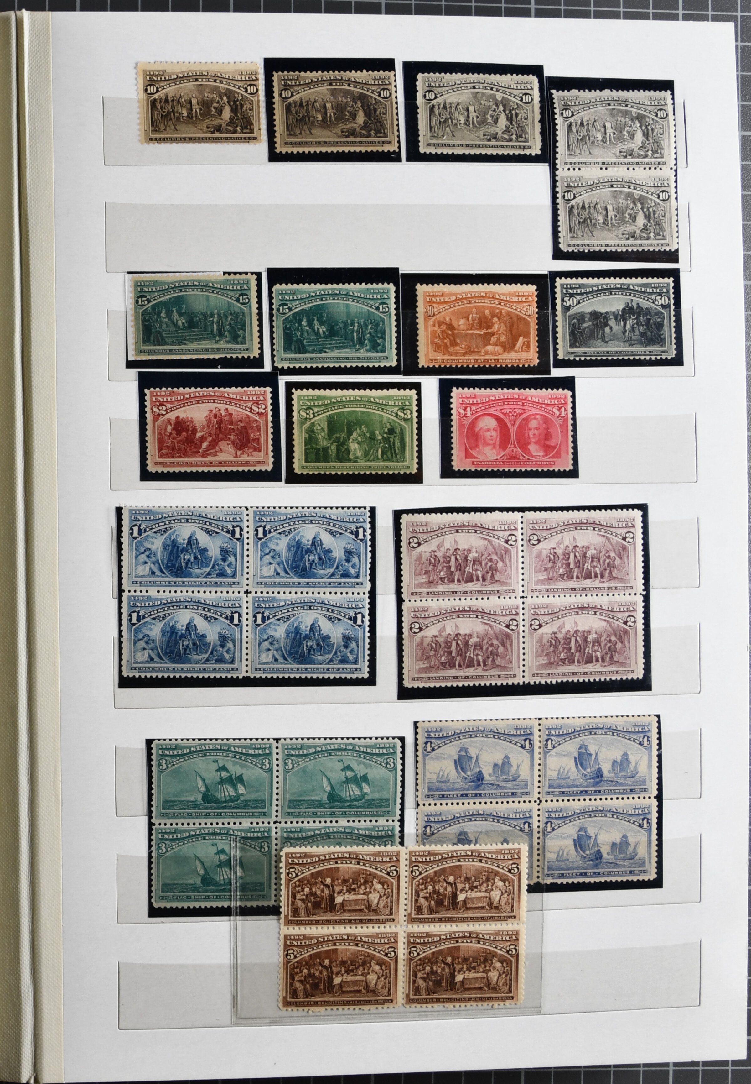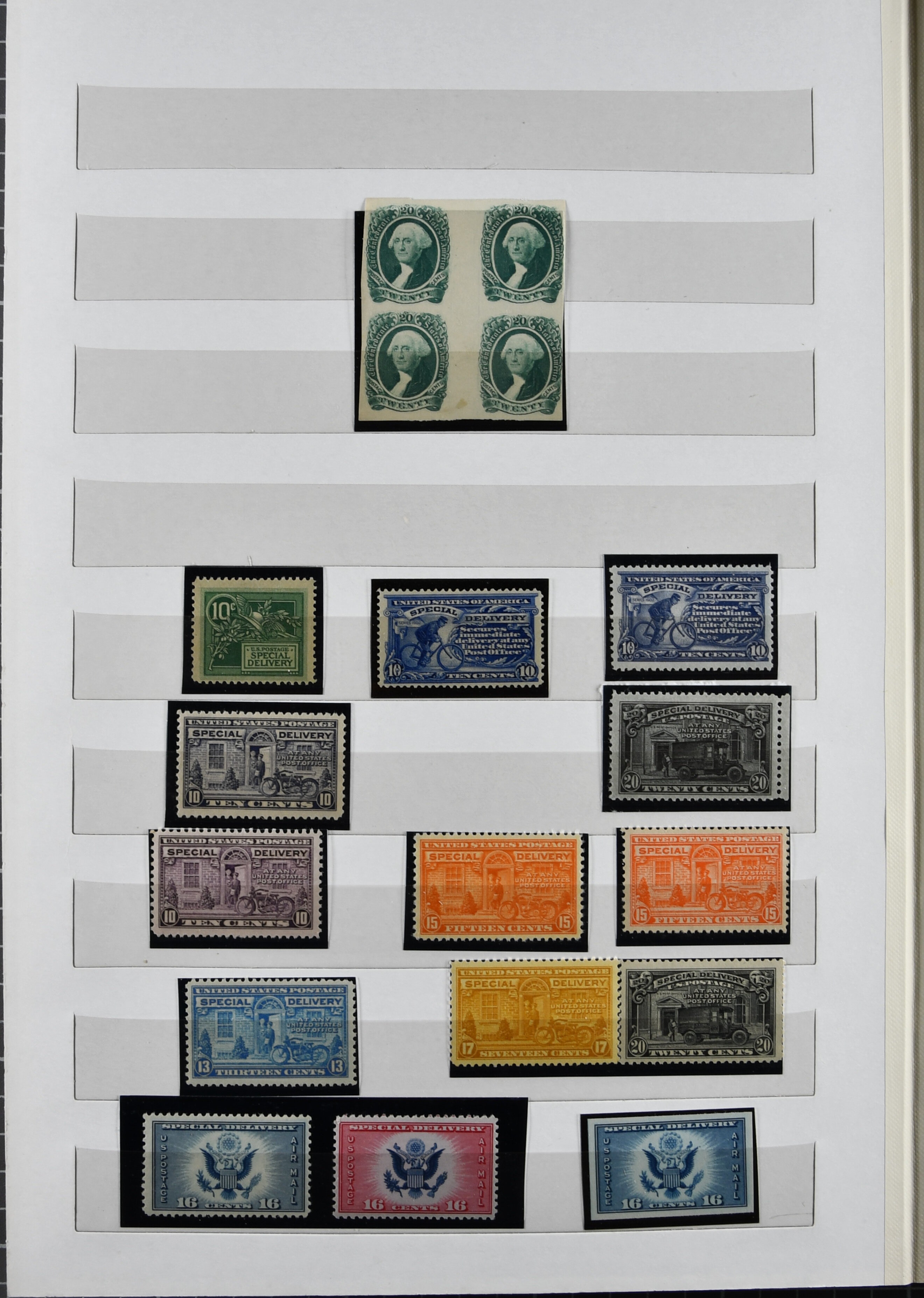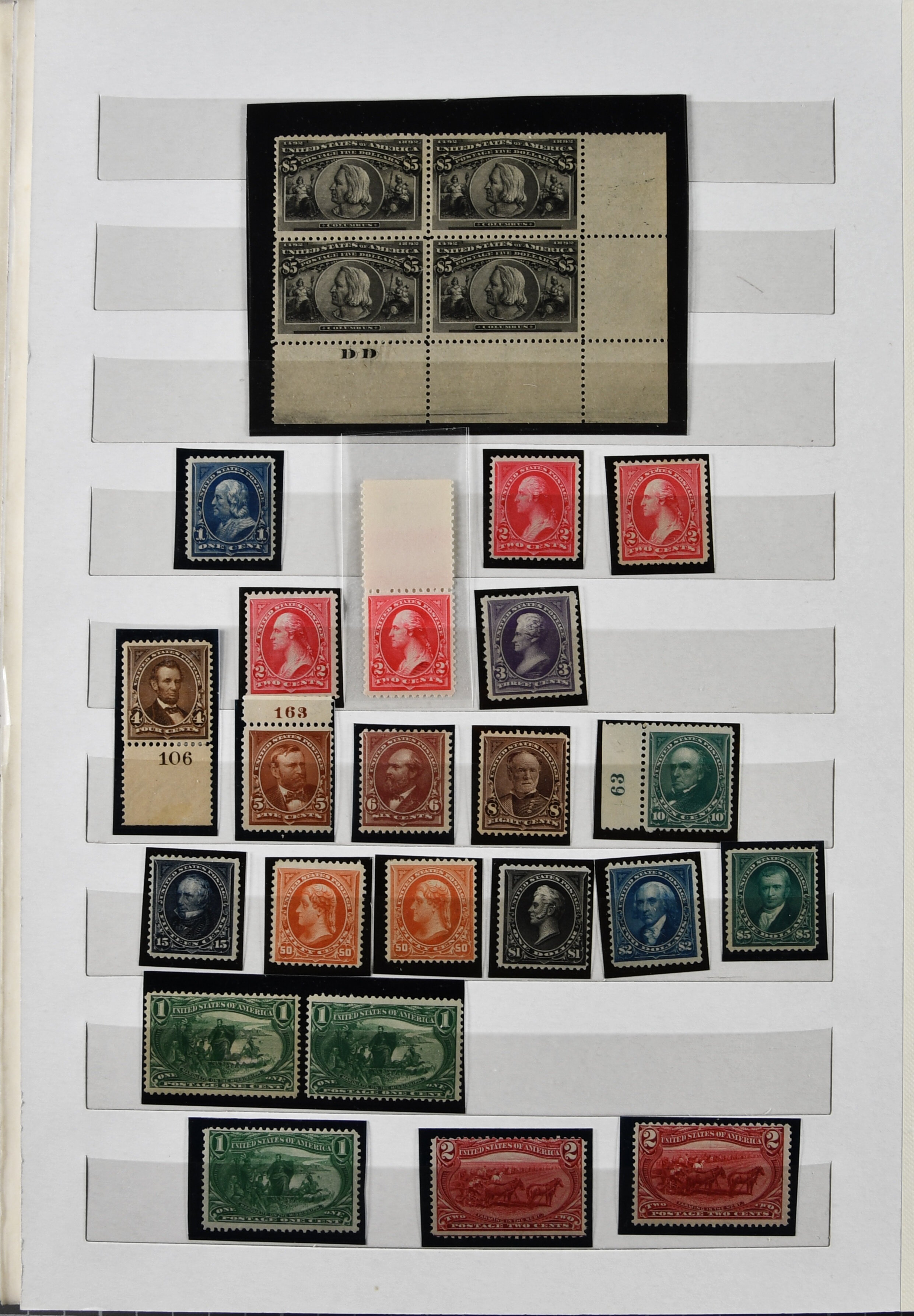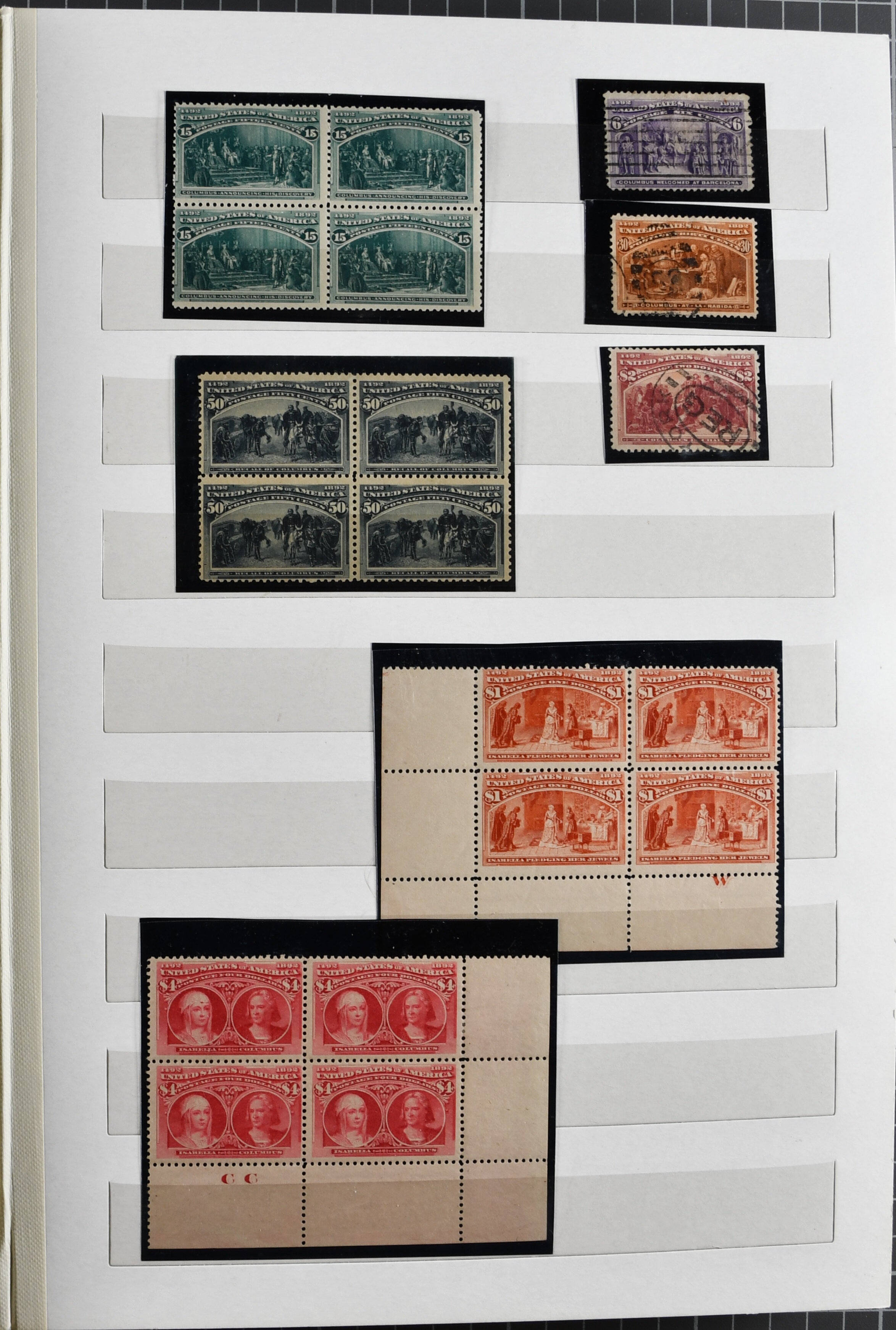 107 **/*/cover/bof imageLots & Collections, 1847/1997c.: Collection in three volumes with 1847 5 c. red-brown used, 1847 5 c. red-brown pair on cover from New York to Savannah; 1847 10 c. black used, 1861/62 3 c. and 12 c. used on 1863 cover from New Orleans to France, 1861/62 5 c. brown and 10 c. green used on 1863 cover from New Orleans to France; 1861 1 c. blue unused, 12 c. black unused, 90 c. blue used; 1869 2 c. brown used strip of three, 15 c. blue & brown Type II unused, 24 c. green & violet used, 30 c. ultramarine & carmine used, Lincoln 90 c. carmine & black used; 1890/93 definitive incl. 15 c., 30 c. and 90 c. orange unused, fantastic array of 1893 Columbus Issue with set incl. duplication to 50 c. unused, and $ 2, $ 3 and $ 4 unused and a used $ 2; Columbus 1893 issue in unused blocks of four: 1 c., 2 c., 3 c., 4 c., 5 c., 6 c. blocks (4, one sheet marginal); 8 c., 10 c. in marginal block of six, 15 c., 50 c., $ 1 corner marginal block, $ 4 corner marginal block and $ 5 in a corner marginal block; 1894 definitive issue set of thirteen to Marshall $ 5 green unused incl. additional 50 c.; 1898 Trans-Mississippi set of nine unused with some duplication incl. additional $ 1 black and $ 2 orange-brown; Trans-Mississippi multiples with blocks of four 1 c., 2 c., 4 c., 5 c. marginal block, 8 c. marginal block and 10 c., pairs of 10 c. and 50 c. sage green; 1901 Pan-American set of six unused; 1902/03 definitive set to 13 c. unused plus $ 1 and $ 5 unused, 1906 Lincoln 5 c. imperf. pair unused, 1904 Louisiana set of five unused (4 sets), 1907 Jamestown set of three with 1 c. block of four, 2 c. in blocks of four and six (both sheet marginal) and 5 c. block of six unused; 1908/09 $ 1 violet-brown unused, 1912/16 set of 16 values to $ 1 unused, 1915 Panama-Pacific 10 c. orange unused; 1917 no wmk Madison $ 2 blue and Marshall $ 5 green unused, Marshall $ 5 green unused block of four; 1916/17 $ 1 violet-brown block of four unused, 1918 $ 2 orange-red and $ 5 green & black unused, 1918 Curtis Jenny set of three in unused blocks of four with additional 24 c. block; 1920 $ 2 carmine & black block of four unused, 1922/25 unused set with $ 2 and $ 5 values in blocks of six unused; 1923 Airmail 8 c. and 24 c. in unused blocks of four; 1926 Philatelic Exhibition sheets unused (2); 1929 Kansas and Nebraska overprint sets of 11 unused, 1930 Zeppelin set of three unused; 1933 Zeppelin 50 c. green unused (2), 1938 Prexies with $ 5 centreline block of four unused, thereafter seemingly complete unused to circa 1996 incl. range of Special Delivery issues. An outstanding collection (28 certificates) with careful viewing recommended Scott = $ 70'000+. (Image 1) (Image 2) (Image 3) (Image 4) (Image 5) (Image 6) (Image 7) (Image 8) (Image 9) (Image 10) (Image 11) (Image 12) (Image 13) (Image 14) (Image 15) (Image 16) (Image 17) (Image 18) (Image 19) (Image 20) (Image 21) (Image 22) (Image 23) (Image 24) (Image 25) (Image 26) (Image 27) (Image 28) (Image 29) (Image 30) (Image 31) (Image 32) (Image 33) (Image 34) (Image 35) (Image 36) (Image 37) (Image 38) (Image 39) (Image 40) (Image 41) (Image 42) (Image 43) (Image 44) (Image 45) (Image 46) (Image 47) (Image 48) (Image 49) (Image 50)