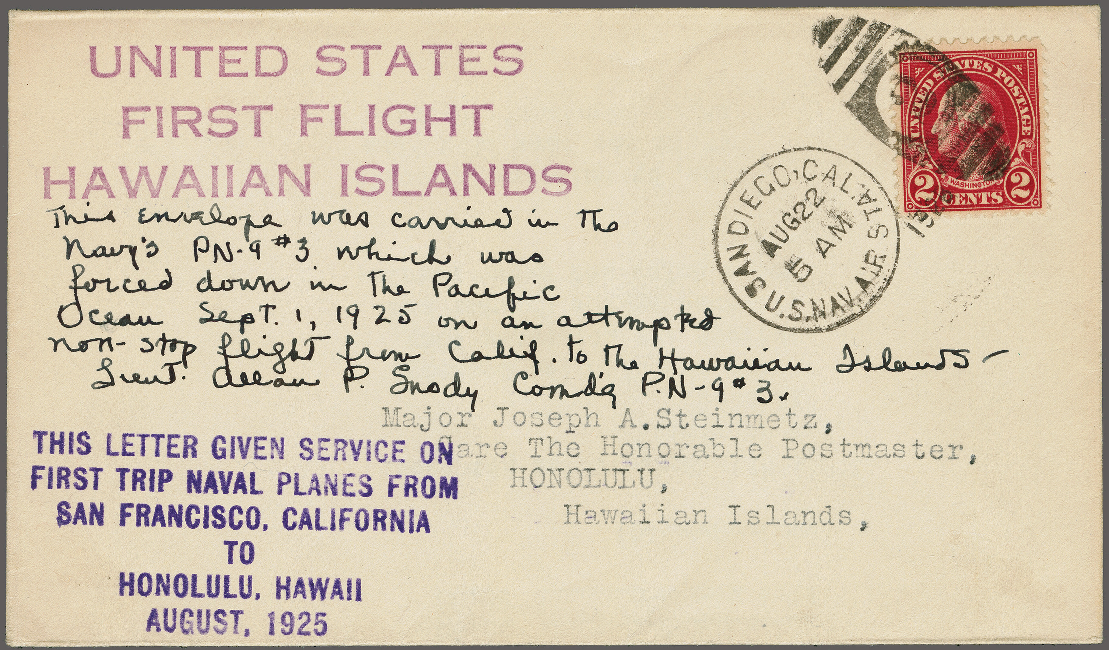 1741 cover imageUS Navy San Francisco-Hawaii Nonstop Flight, 1925 (August 1): Envelope with magenta and purple cachets franked with 2c Red to Honolulu, tied by San Diego Aug. 22 duplex, fresh and fine. Two US Navy planes PN9-1 under Commander John Rodgers U.S.N. and PN9-3 under Commander Lieutenant Allan P. Snody, U.S.N. took off on August 31st at 3.P.M. for a non stop flight from San Francisco to Hawaii, but they were forced down at different distances on the route. This cover was carried and signed by Allan P. Snody in PN-3 AAMC #1033a. (Image 1) (Image 2)