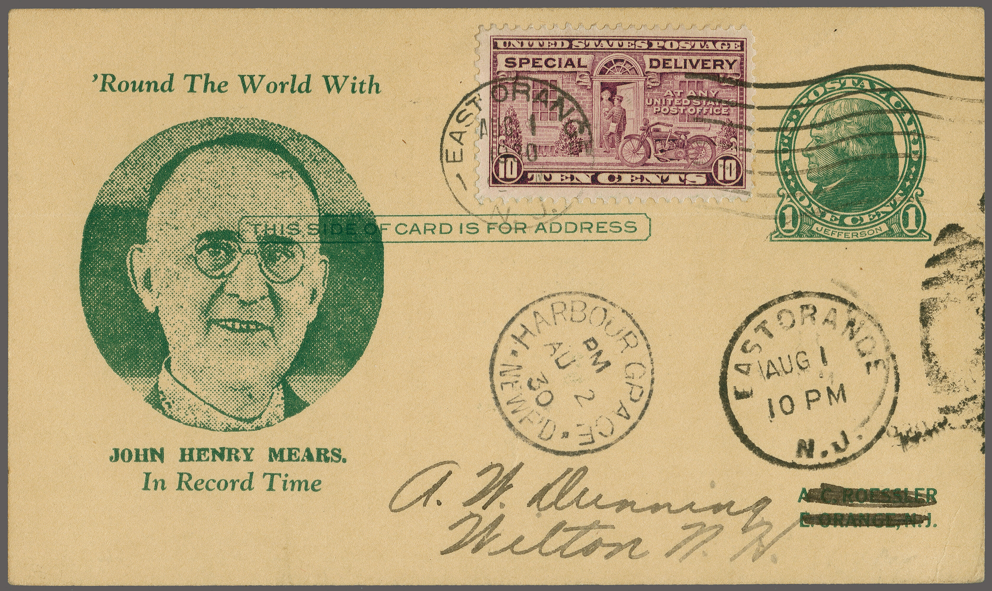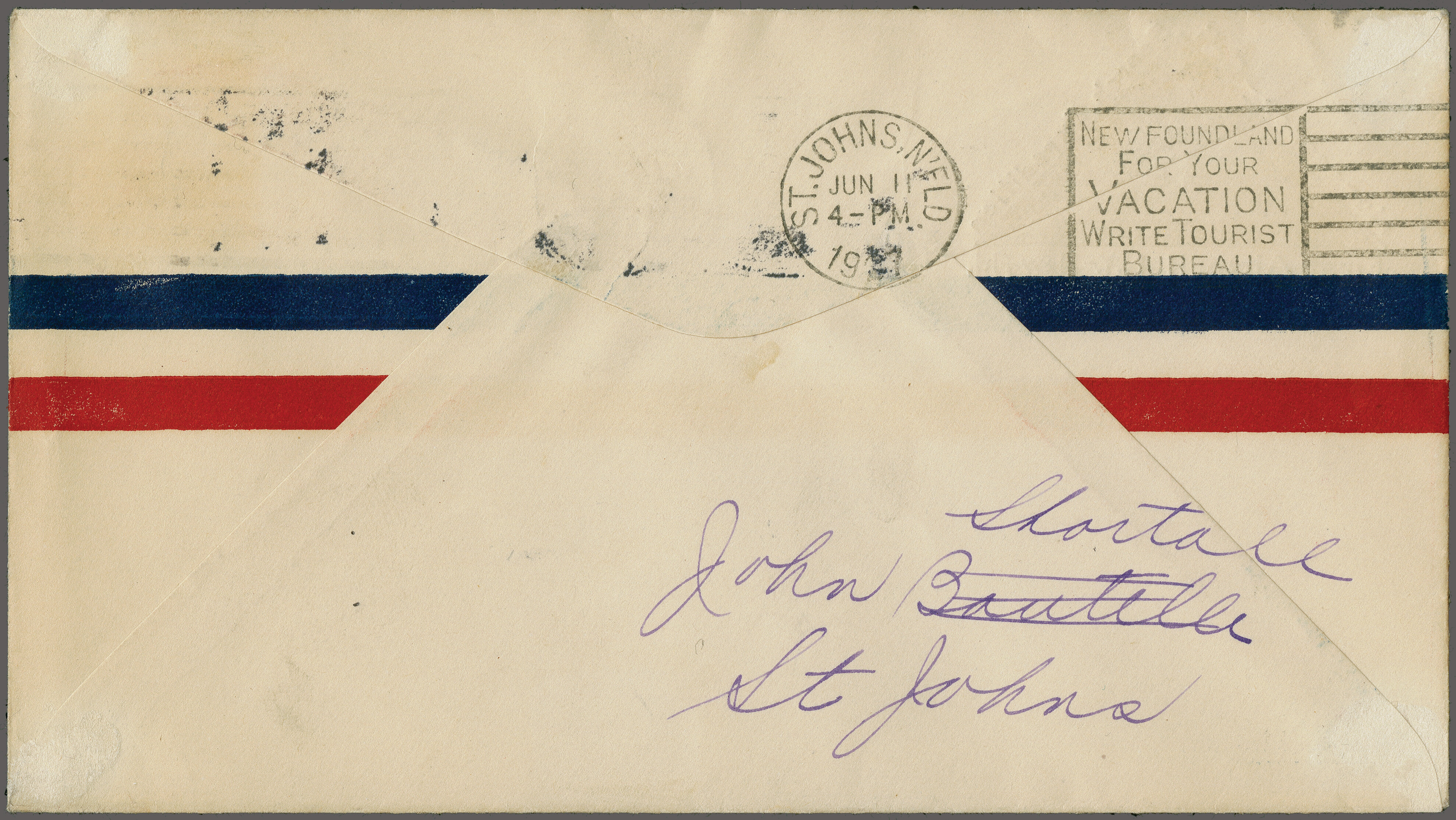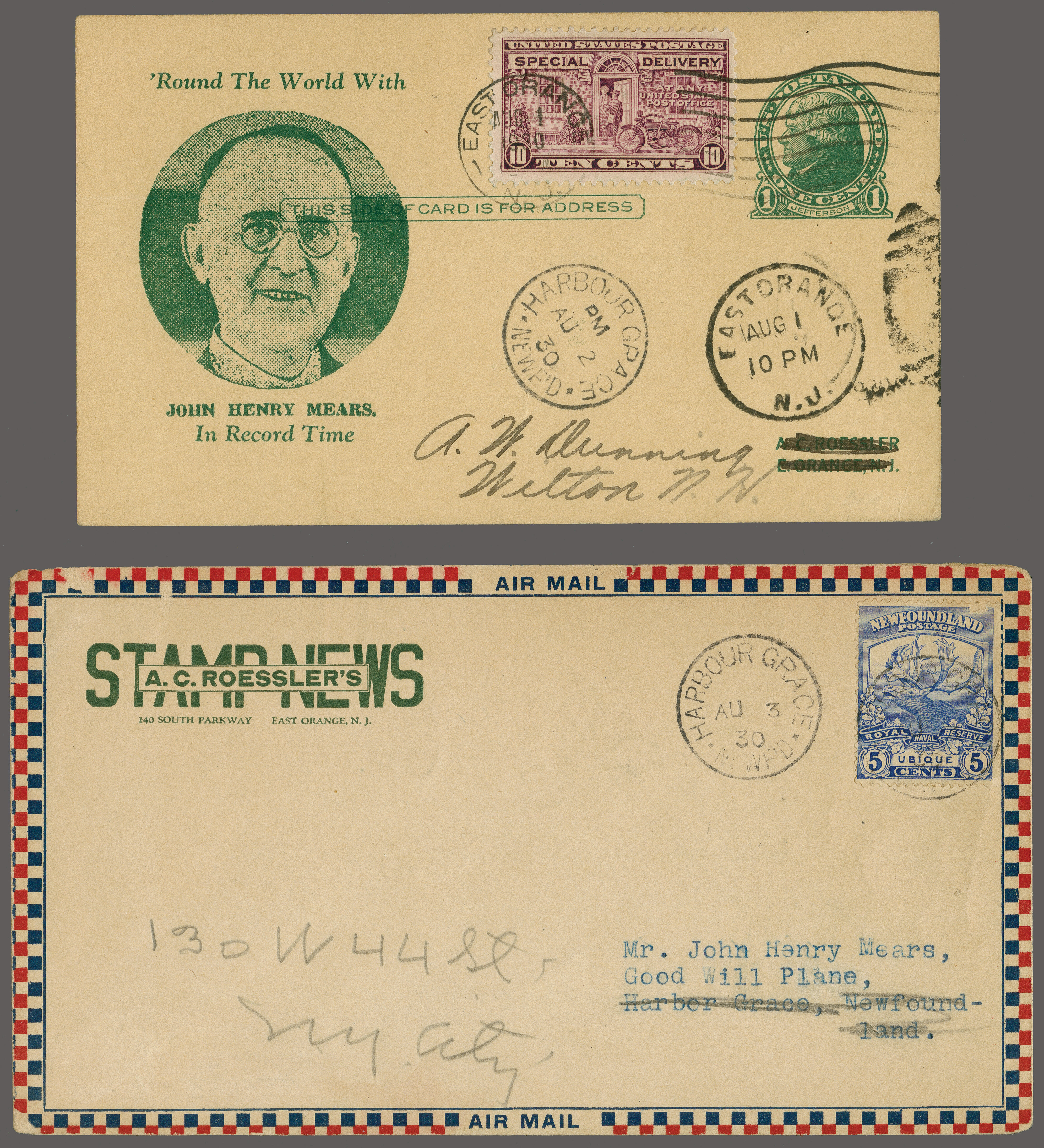 1747 cover imageNew York - Newfoundland Flight by J.H.Mears 1930 /Aug. 2): John Mears autographed 1c. stationery card from East Orange to "Harbour Grace AU 2" together with 'Roessler Stamp News' airmail envelope addressed to John Henry Mears, franked with Newfoundland 5 c. tied "Harbour Grace AU 3 30" backstamped "Con. Bay R.Y.P.O.A., Newfoundland, August 9" on reverse. One of only ten covers known AAMC PP100b1+c. (Image 1) (Image 2) (Image 3)