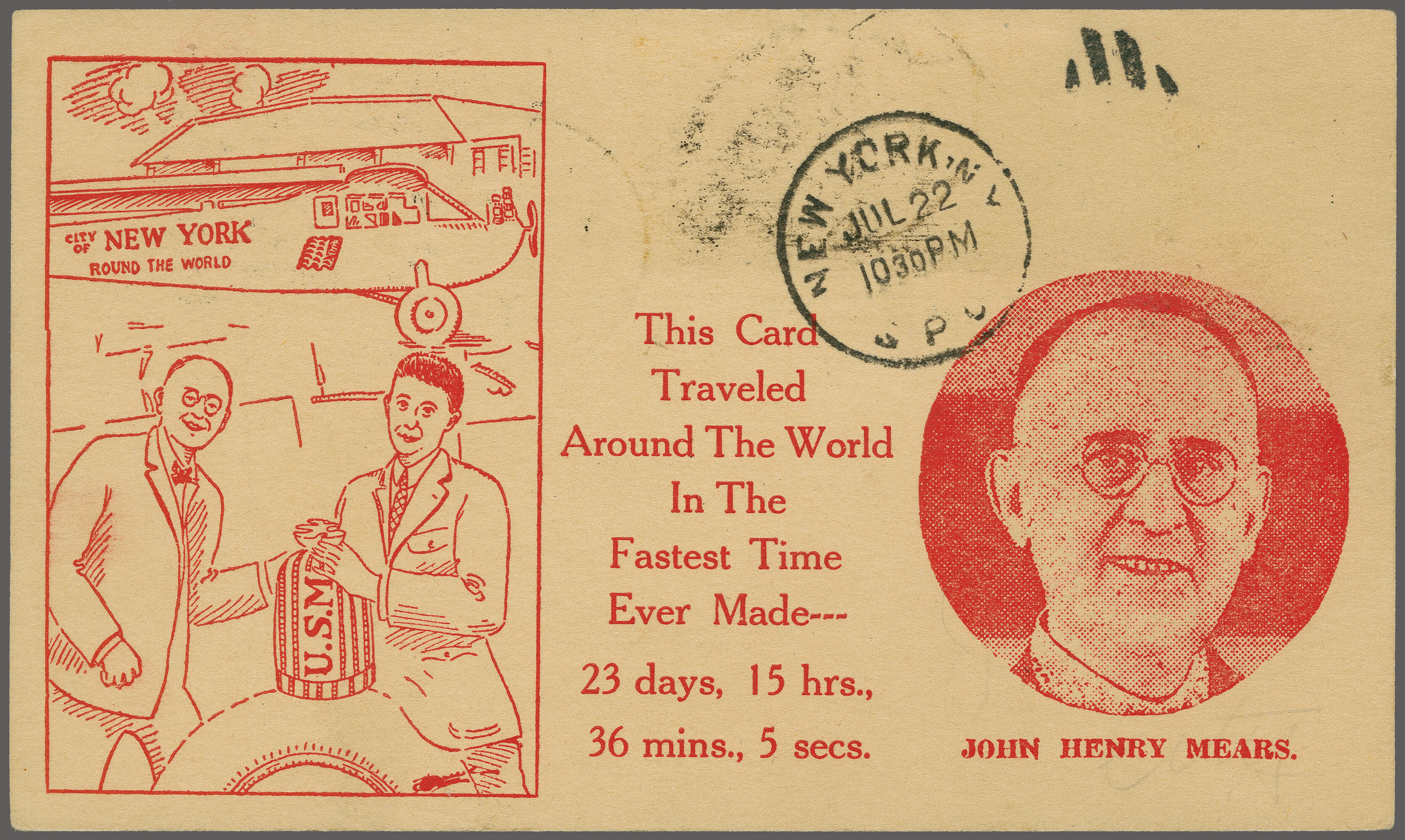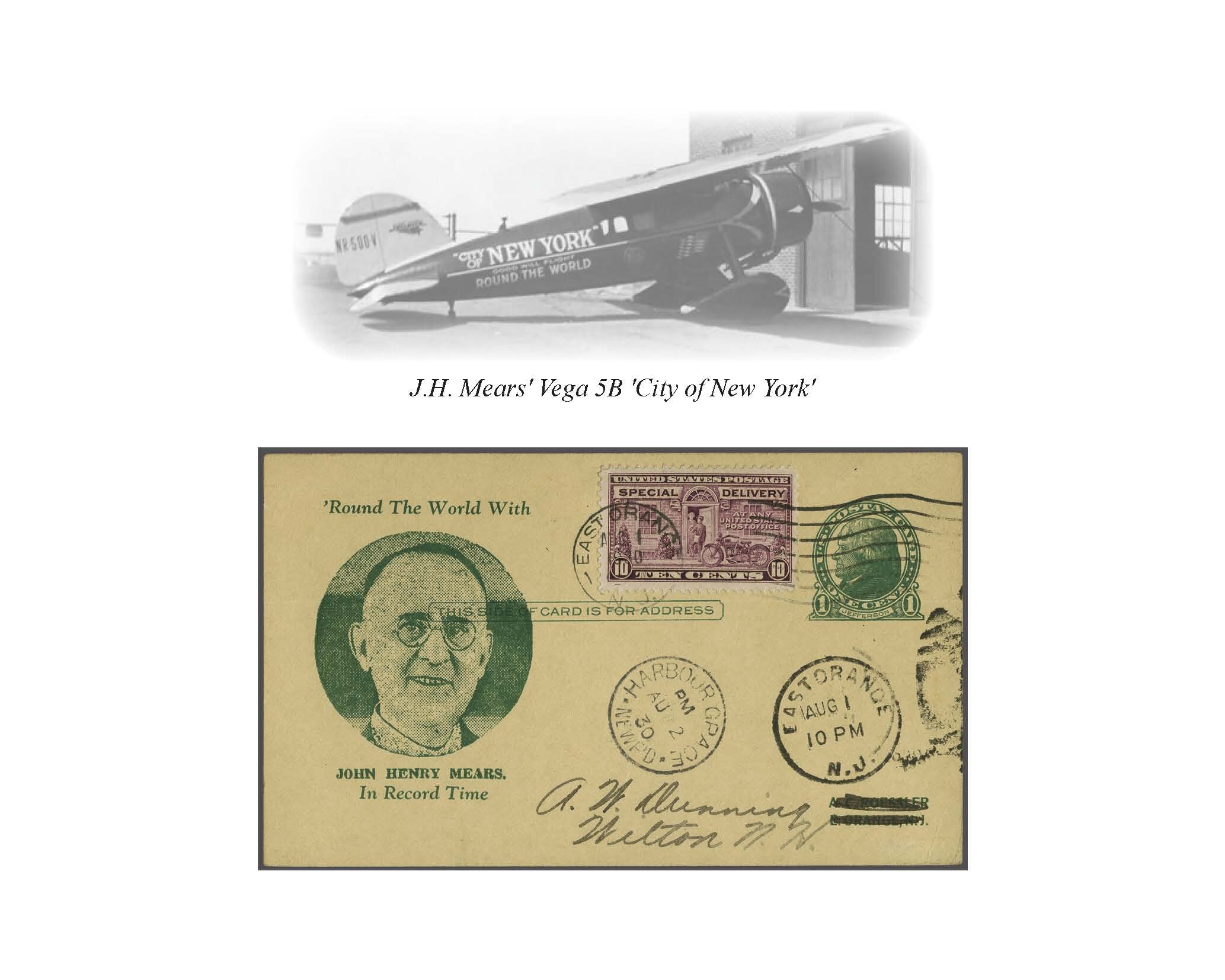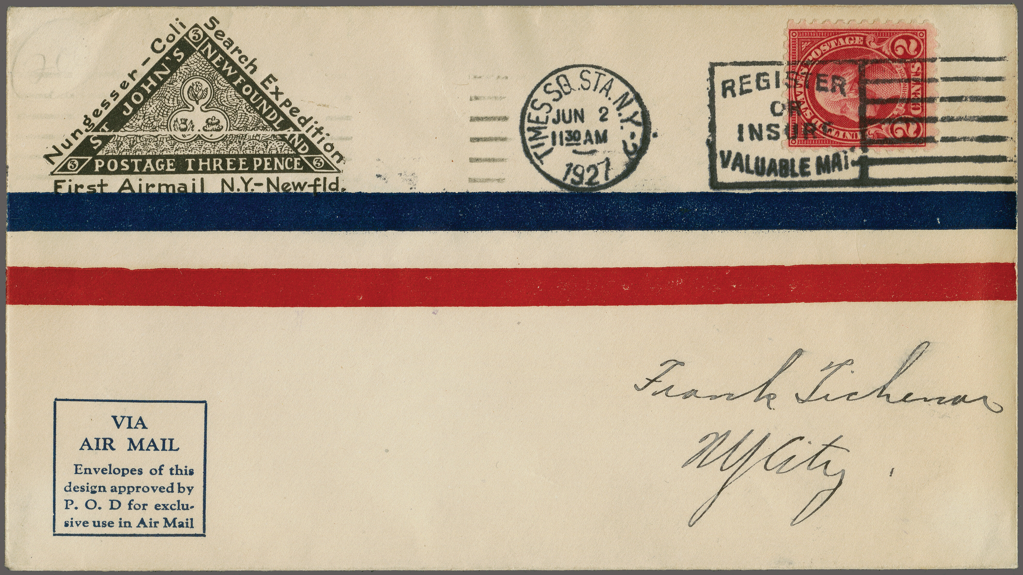 1747 cover imageNew York - Newfoundland Flight by J.H.Mears 1930 /Aug. 2): John Mears autographed 1c. stationery card from East Orange to "Harbour Grace AU 2" together with 'Roessler Stamp News' airmail envelope addressed to John Henry Mears, franked with Newfoundland 5 c. tied "Harbour Grace AU 3 30" backstamped "Con. Bay R.Y.P.O.A., Newfoundland, August 9" on reverse. One of only ten covers known AAMC PP100b1+c. (Image 1) (Image 2) (Image 3)