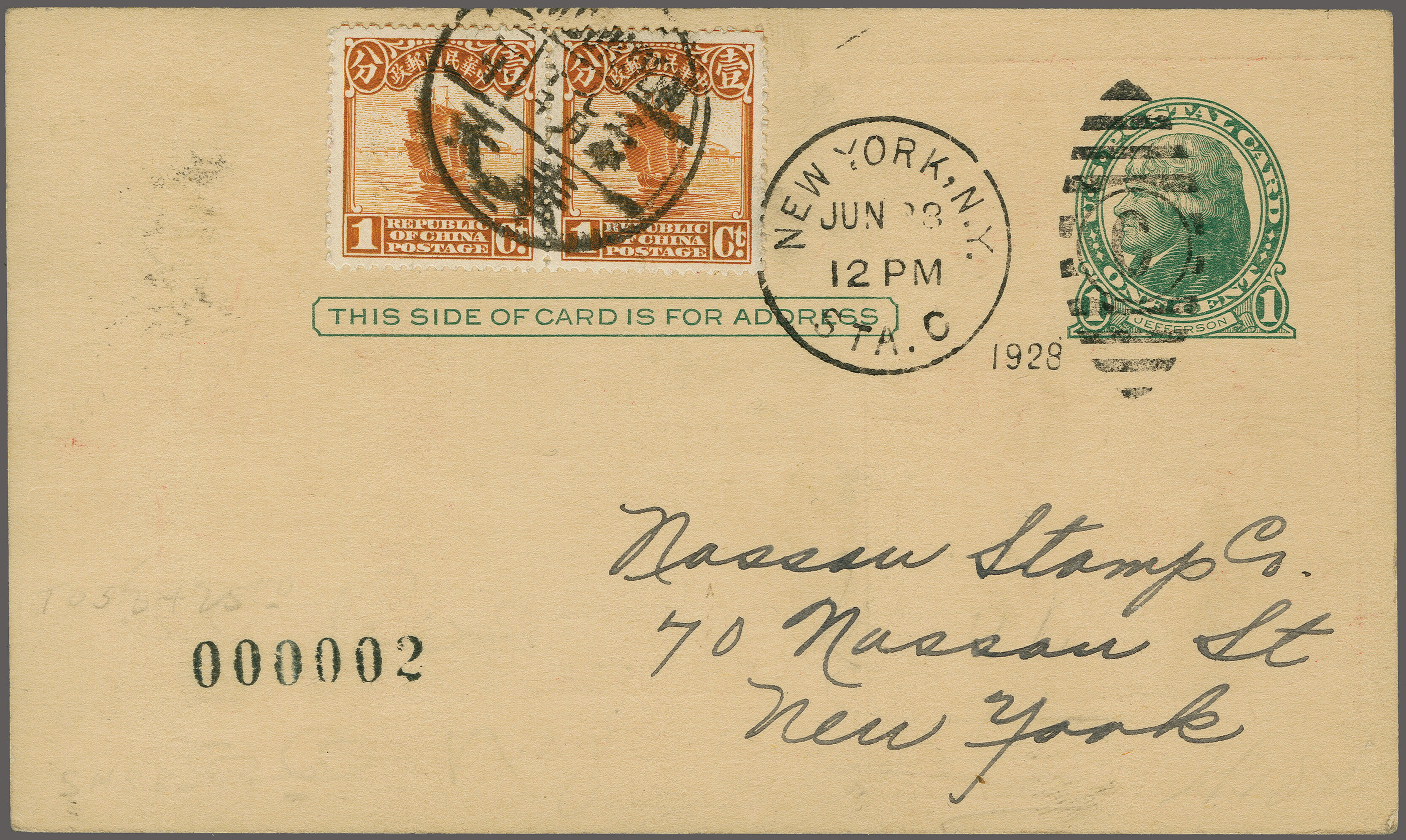 1744 cover imageJ. H. Mears-Collyer Round-the-World Flight 1928 (Jun. 28): Roessler-illustrated 1¢ postal card canceled New York, Jun 28 and bearing two 1¢ Chinese stamps canceled Mukden, Jul 10; serially numbered "000002"; backstamped New York, Jul 22, with stamp removed (as is often the case), Very Fine. AAMC TO 1077. (Image 1) (Image 2)