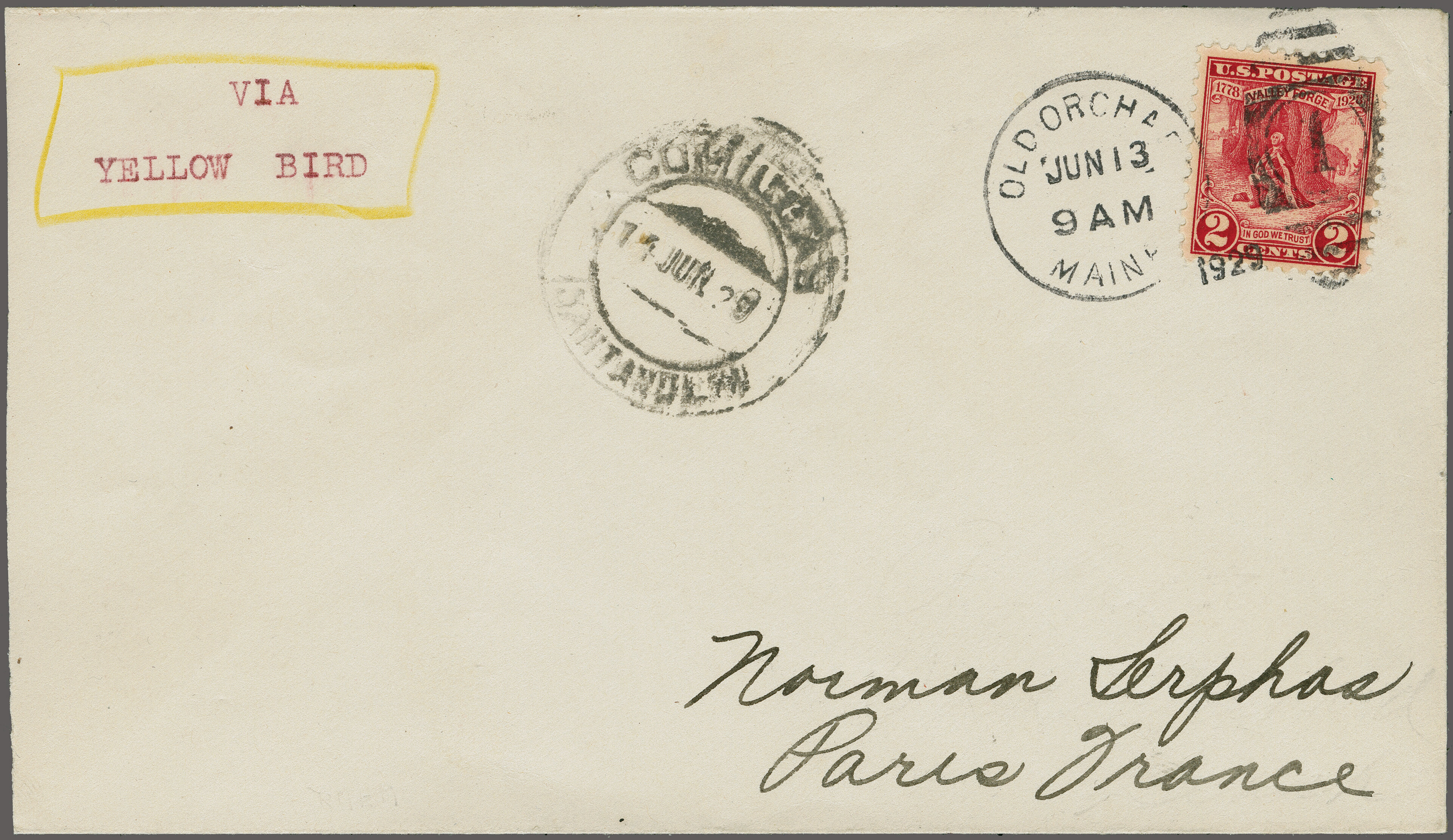 1745 cover image"Yellow Bird" first flight from Old Orchard to France 1929 (June 13): Cover franked with Valley Forge 2c. carmine rose, addressed to Paris and stamped at "Comillas 14. Jun 28". The French plane "Yellow Bird" (L'Oiseau Canari) set records for the longest flight over the ocean and the first French flight over the North Atlantic. The plane flew 2,410 miles in 22 hours. The pilot, Lt. Rene Lefebvre, navigator, Sgt. Jean Assolant, and backer, Armeno Lotti attempted to fly non-stop from US to France. While en route, the crew discovered they have an uninvited passenger, one Arthur Schreiber, hidden aboard before the departure from Old Orchard in Maine. Because of extra weight and bad weather they ran out of fuel and were forced down at Comillas Spain. (Image 1) (Image 2)