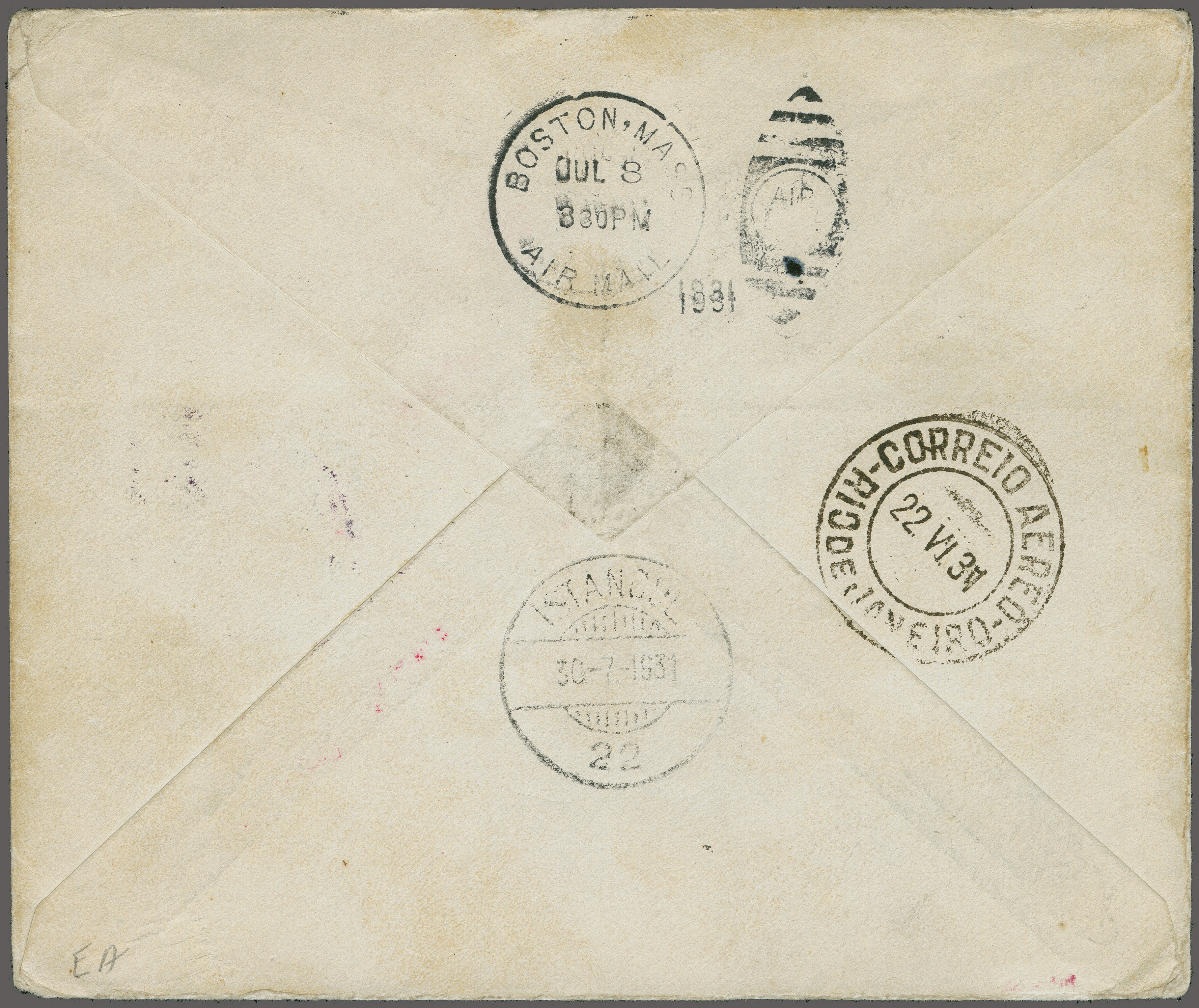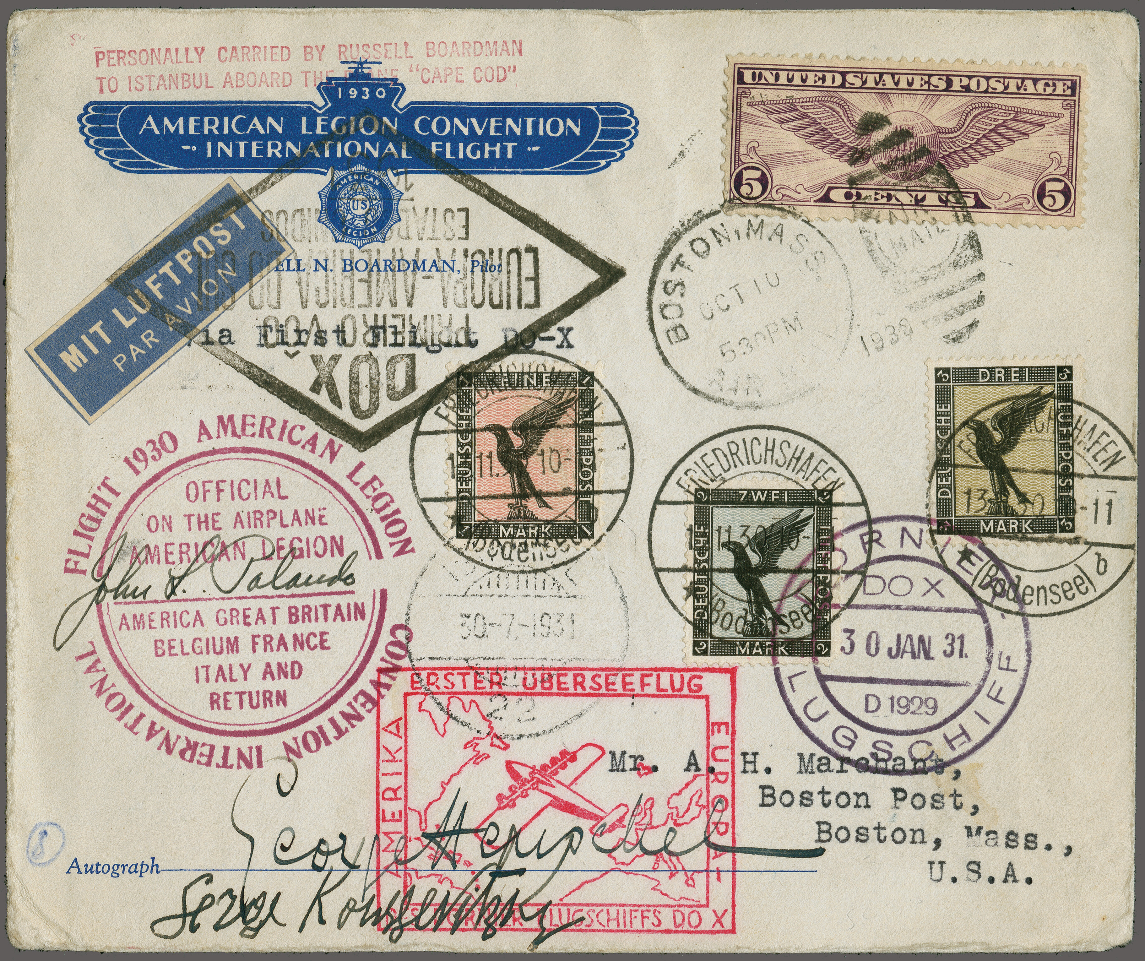 1748 cover image1930 (Oct. 10): "American Legion" flight cover, franked with 5c 'Winged Globe' tied by "Boston Mass. Oct. 10" duplex, 'personally carried by Russel Boardman / to Istanbul aboard the plane "Cape Code" with "Istanbul 30-7-1931" cds. on reverse, used in combination with German Dornier Do-X flight cachet (30. Jan.31) to Rio de Janeiro with arrival pmk of July 22 on reverse, signed by both pilots, v.f. and rare combination cover. (Image 1) (Image 2)