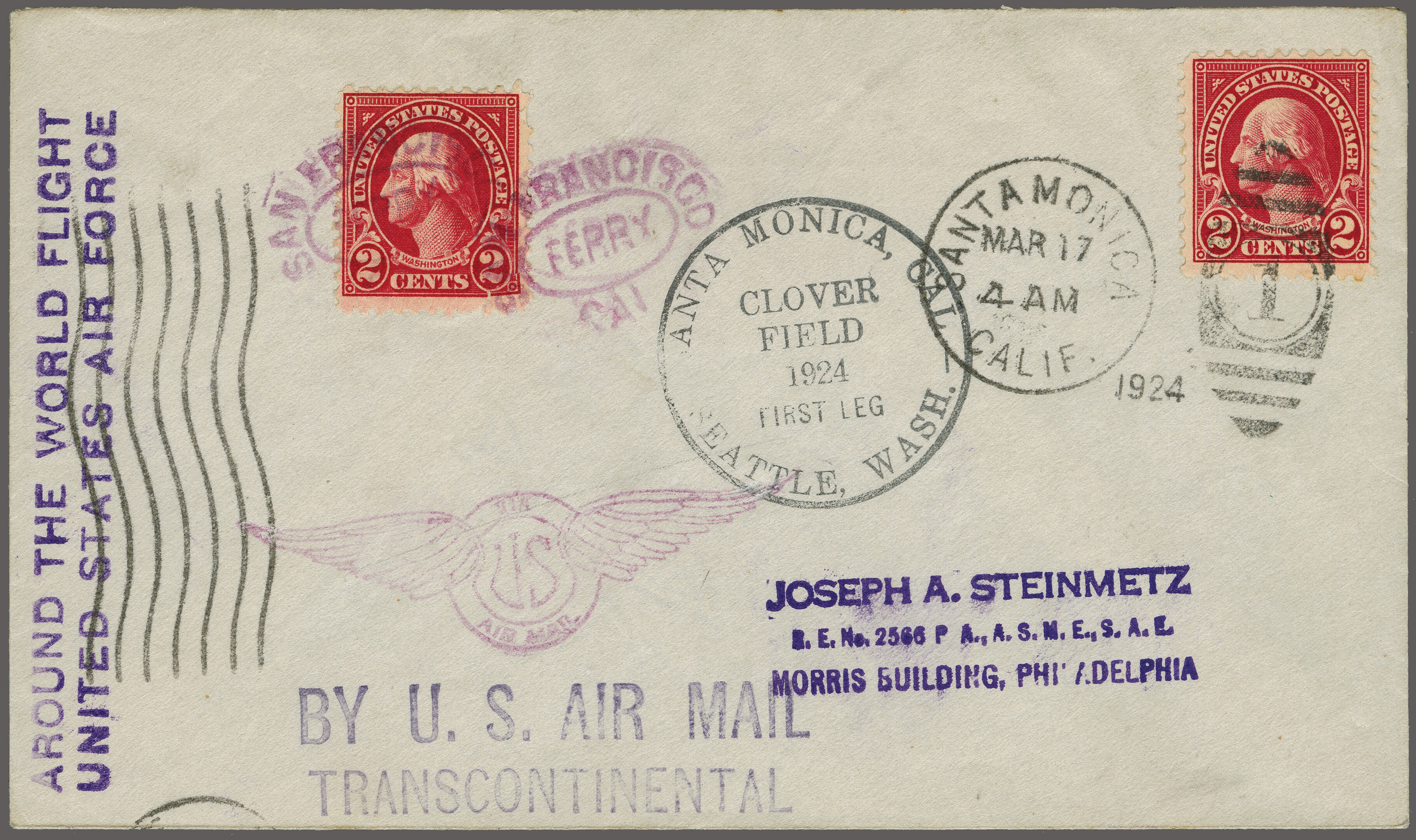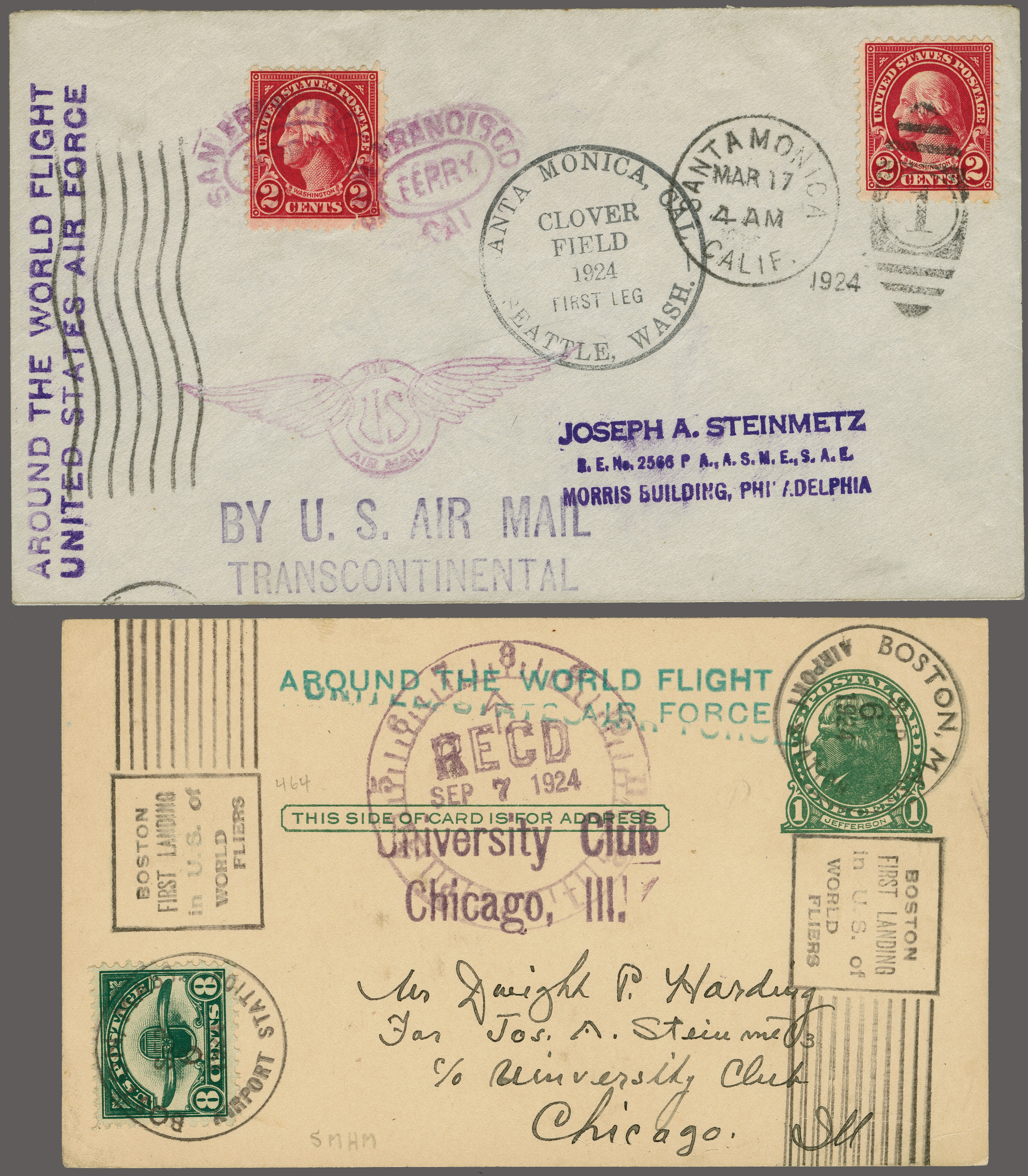 1740 cover imageU.S. Air Force Around the World Flight 1924 March 17): First leg cover franked with 2c US standard domestic rate applied two times in Santa Monica, March 17th and San Francisco(Ferry) special cancelations together with 1c postal card uprated with a 8c airpost used from "Boston Airport Sep. 6 1924" to Chicago with special cachet in green AAMC TO1025, PP-34b. (Image 1) (Image 2)