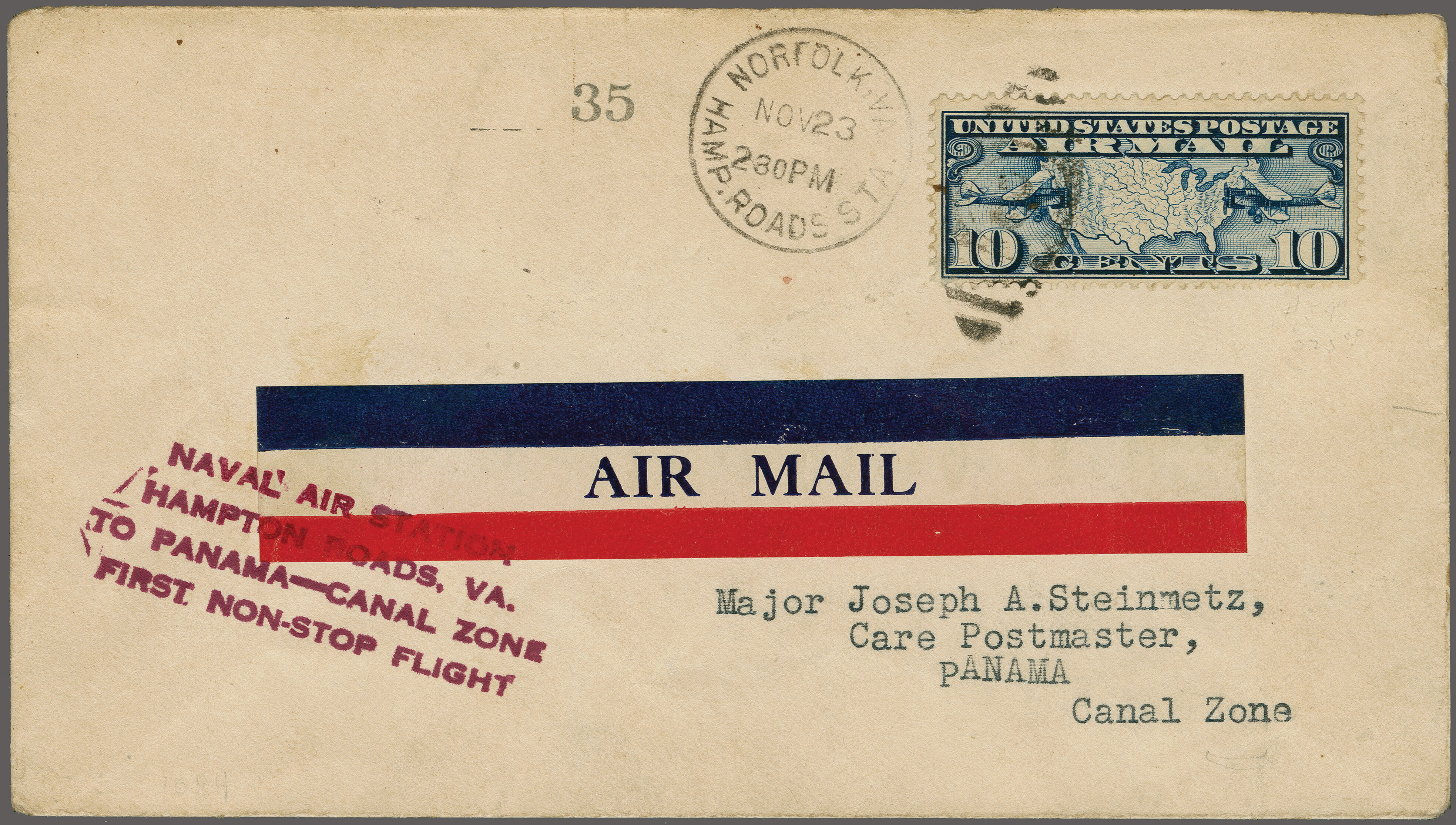 1742 cover imageNorfolk VA - Canal Zone, Cmdr. H. H. Bartlett of US Navy attempted Non-Stop Flight in a PN-10 flying boat 1926 (Nov. 23): Cover franked with arimail 10c. with special cachet: 'Naval' Air Station Hampton Roads VA. to Panama-Canal Zone /First Non-Stop Flight" in magenta backstamped "Cristobal Nov. 26 C.Z. dublex on reverse. Some edge wear, otherwise fine AAMC TO1044. Additional Notes:As for any contract route although a 15c rate was in force between September 15th 1926 and January 31st ,1927 for routes over 1,000 miles.Broken oil feed line forced the aviator landing near Pines Island, Cuba, 600 miles from destination; after repairs, he proceeded to Cristobal, arriving November 26th. (Image 1) (Image 2)