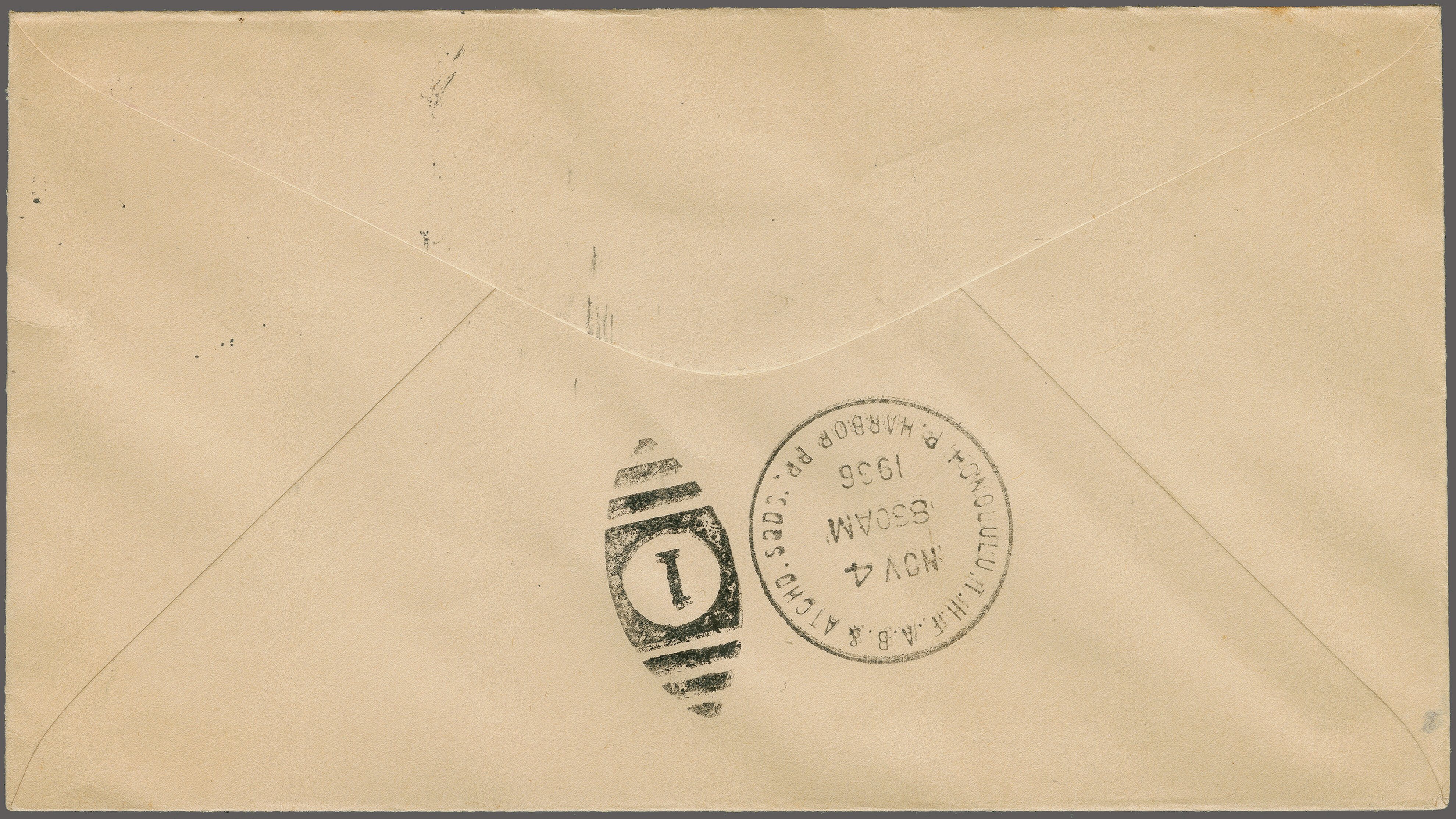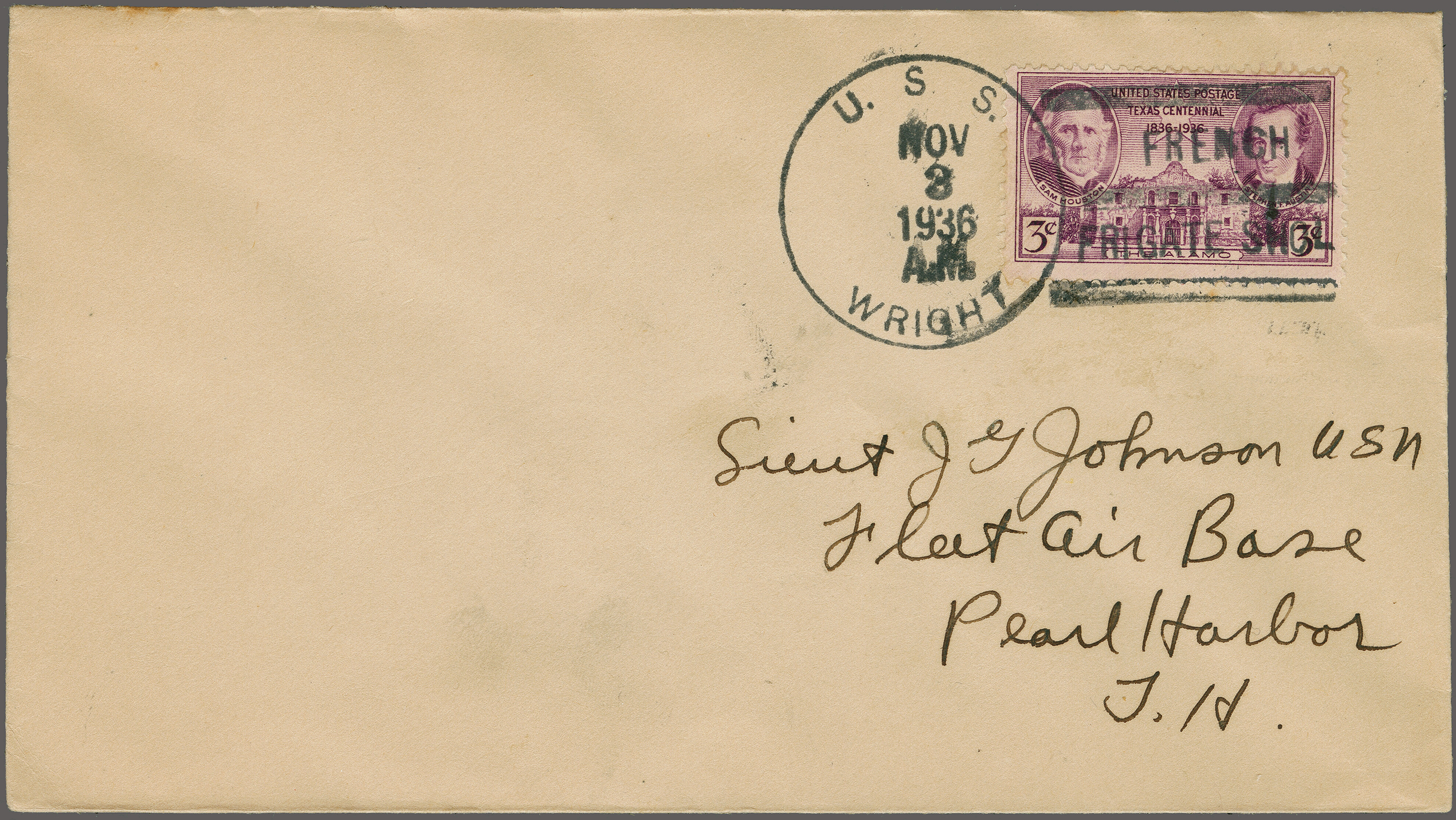 1762 cover imageU.S. Navy First Flight 'Johnston Island-Hawaii' 1936 (Nov. 3): Envelope franked with 3 c. tied by "U.S.S. WRIGHT NOV 3 1936 A.M. FRENCH FRIGATE" to Pearl Harbour, backstamped on reverse by "Pearl Harbour Nov. 4 - 8.30 AM" duplex. Patrol Squadron 4 departed from Johnston Island enroute to Kingman Reef was diverted by a storm and landed in Pearl Harbor, Hawaii. A very rare cover! (Image 1) (Image 2)