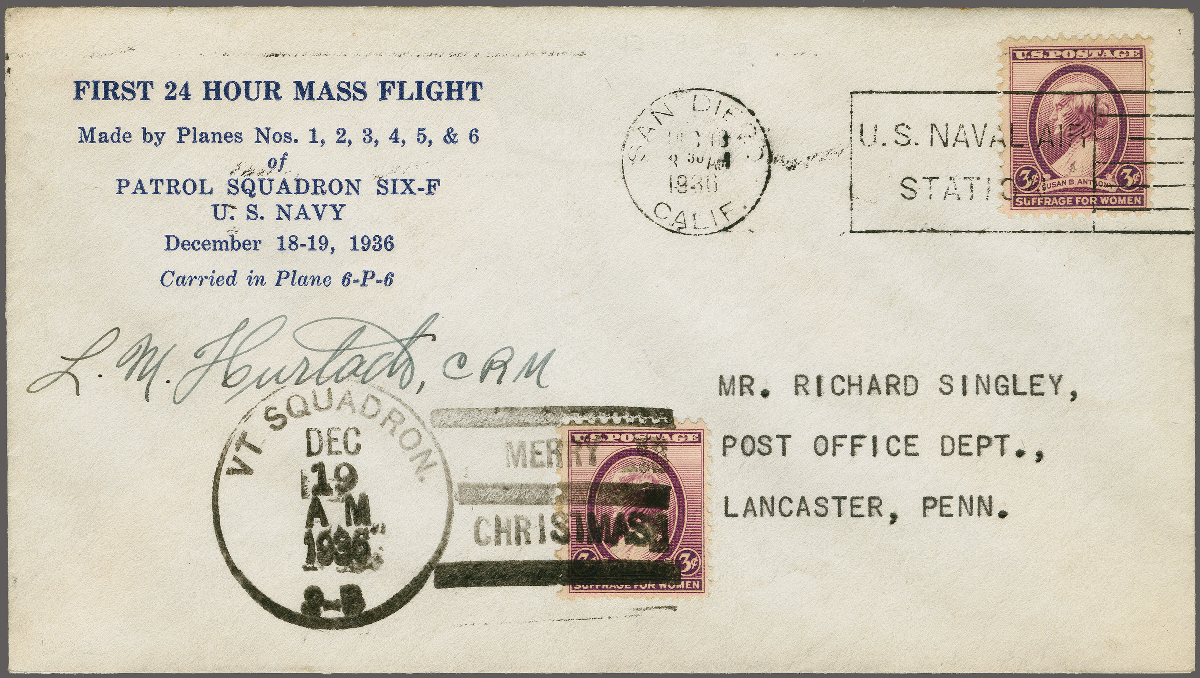 1763 cover imageU.S. Navy First 24 Hour Massed Flight by Patrol Squadron Six-F 1936 (Dec. 18/19): Special printed envelope franked with 3c. tied by "San Diego Naval AIR Station" carried in plane 6-P-6, signed by the pilot and additionally franked on board of 'VT SQUADRON DEC 19 AM" to Lancaster, Pennsylvania. The first 24-hour mass test flight by US Navy planes on a "shake down" cruise for contemplated transpacific flight was made by Patrol Squadron 6F, consisting of twelve planes. The squadron flew 400 miles in the deep and then up and down the Pacific Coast in test maneuvers. (Image 1) (Image 2)