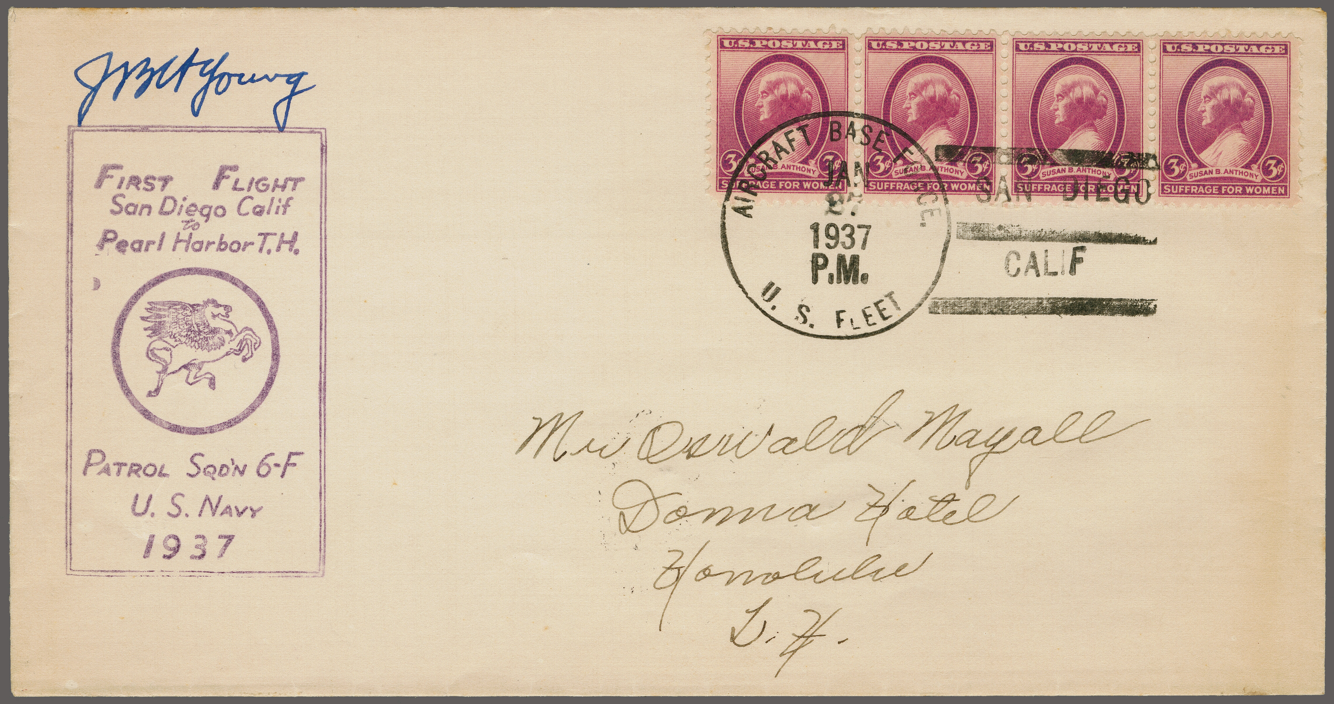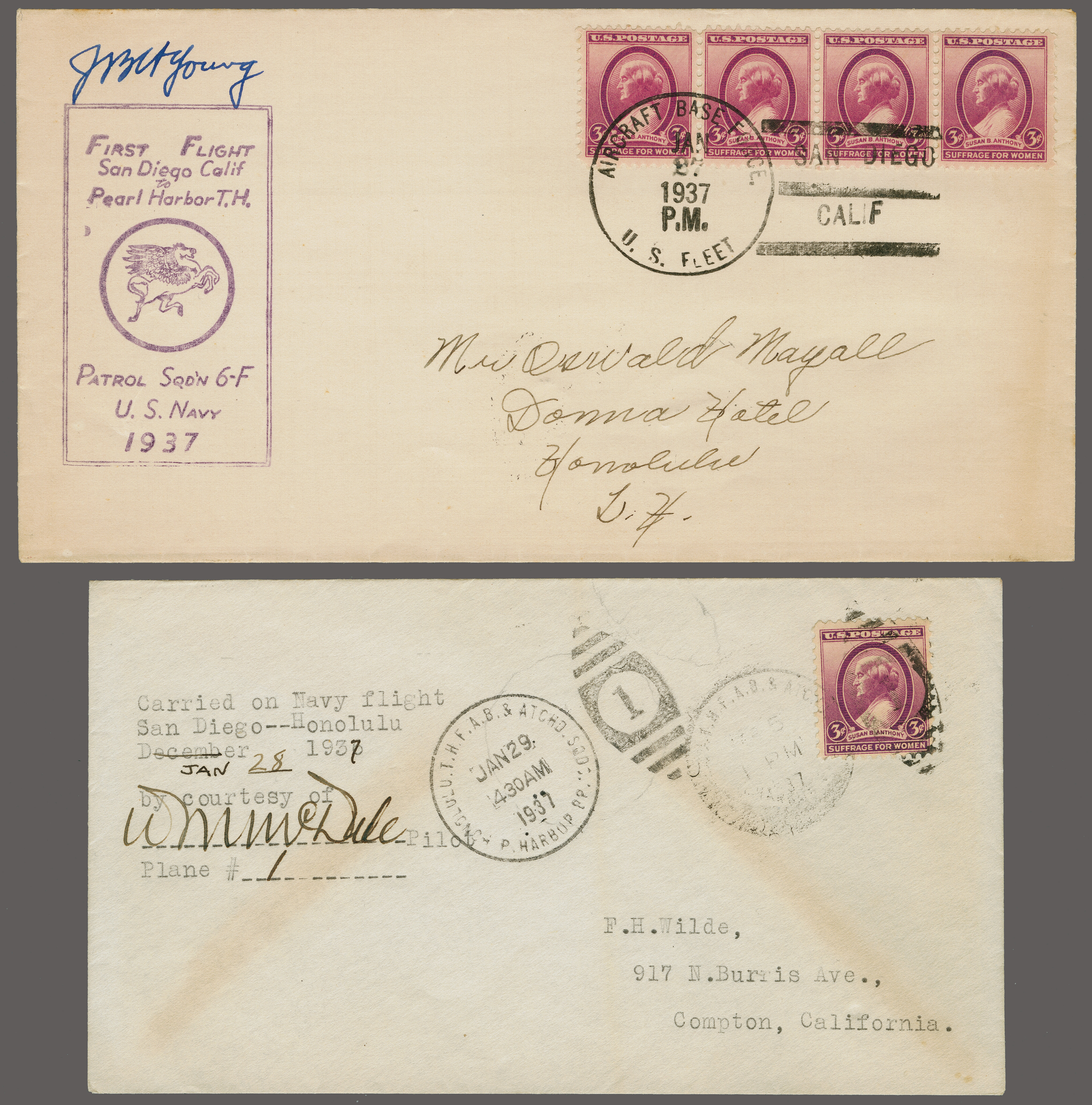 1767 cover imageFirst US Navy Massed Flight San Diego - Pearl Harbor 1937 (Jan.27): Pilot signed envelope franked with 3c. strip of four tied by "AIRCRAFT BASE FORCE U.S. FLEET to Honolulu, backstamped by "Jan. 29 P. Harbour' duplex together with a second envelope signed by the Squadron Commander carried also on Navy flight to Honolulu (Jan 28 1937) and cancelled on arrival "Pearl Harbour Jan 29 1937" and sent back to California. Twelve airplanes of the US Navy Squadron 6 made the first flight from San Diego to Hawaii. Lieut.-Comdr. Wm. M. McDade was the leader and his squadron flew through the famous "Wall of Rain" on this flight. (Image 1) (Image 2)