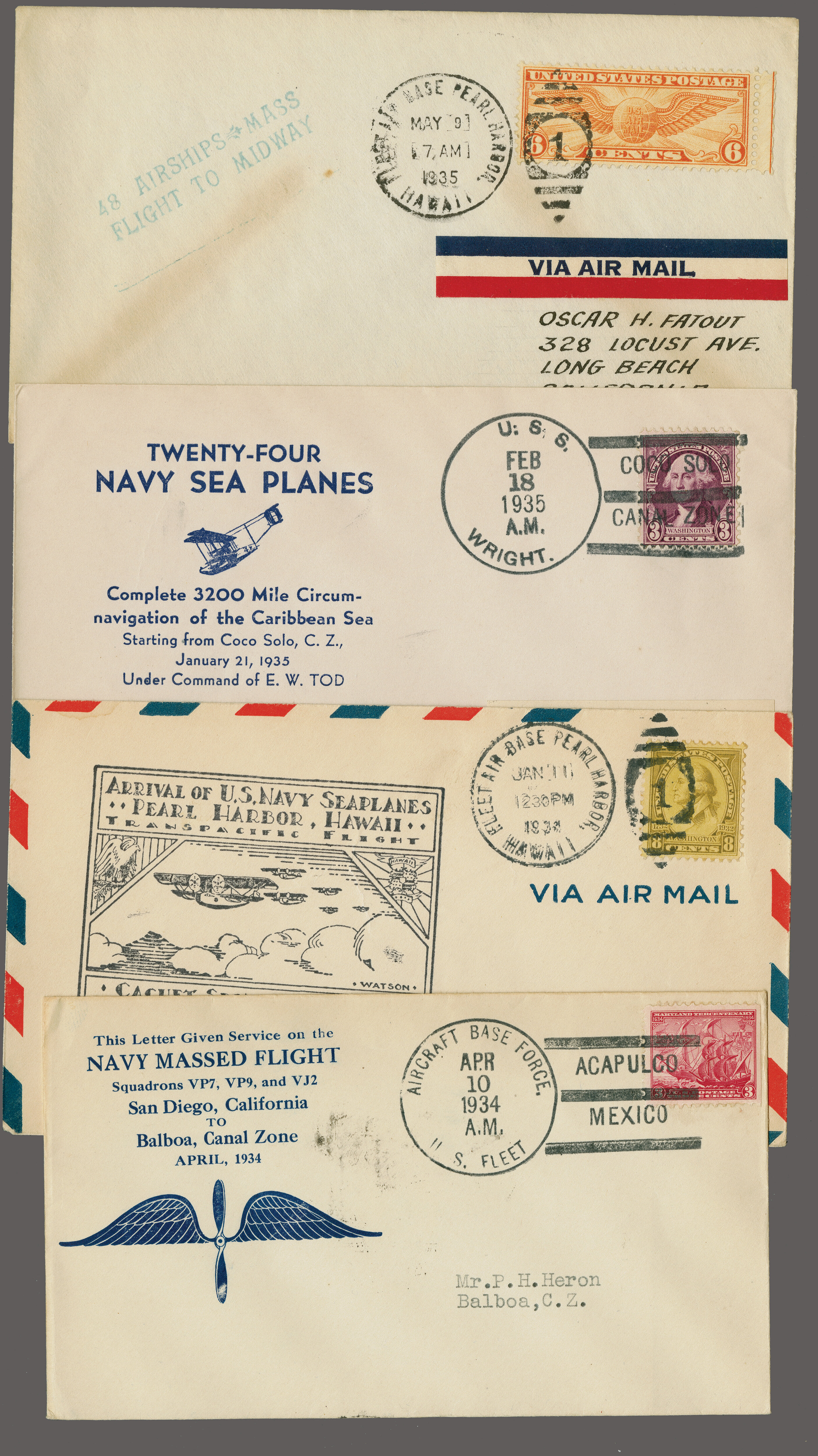 1764 cover image1934/37: Set of four US Navy Massed Flight Covers, including 1934 Sand Diego-Balboa flight (CZ 81b), 1935 Circumnavigation of the Caribbean Sea starting from Coco Solo, Canal Zone (CZ 83b), 1934 First US Navy Squadron Flight San Francisco – Hawaii (TO1200) as well as Navy Mass Flight Hawaii – Midway Island – Hawaii (TO1234). (Image 1)