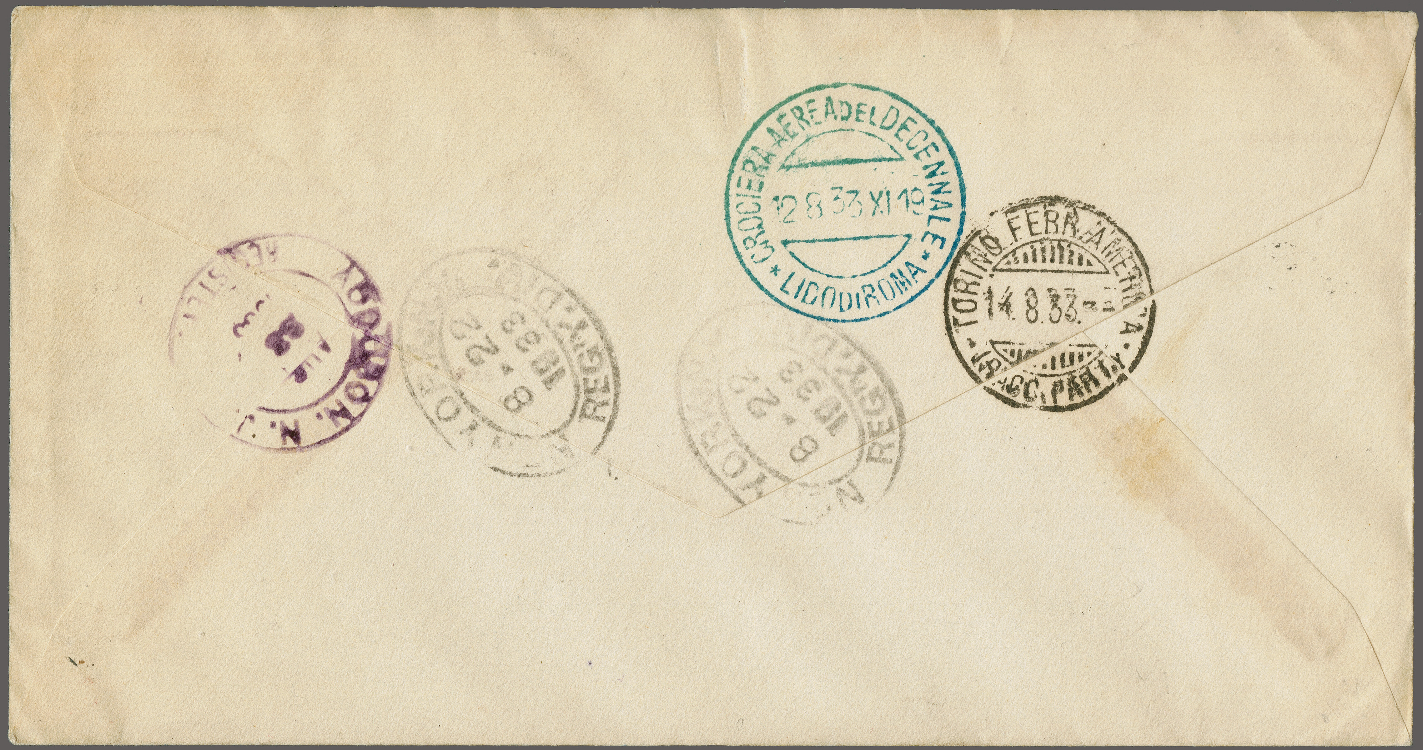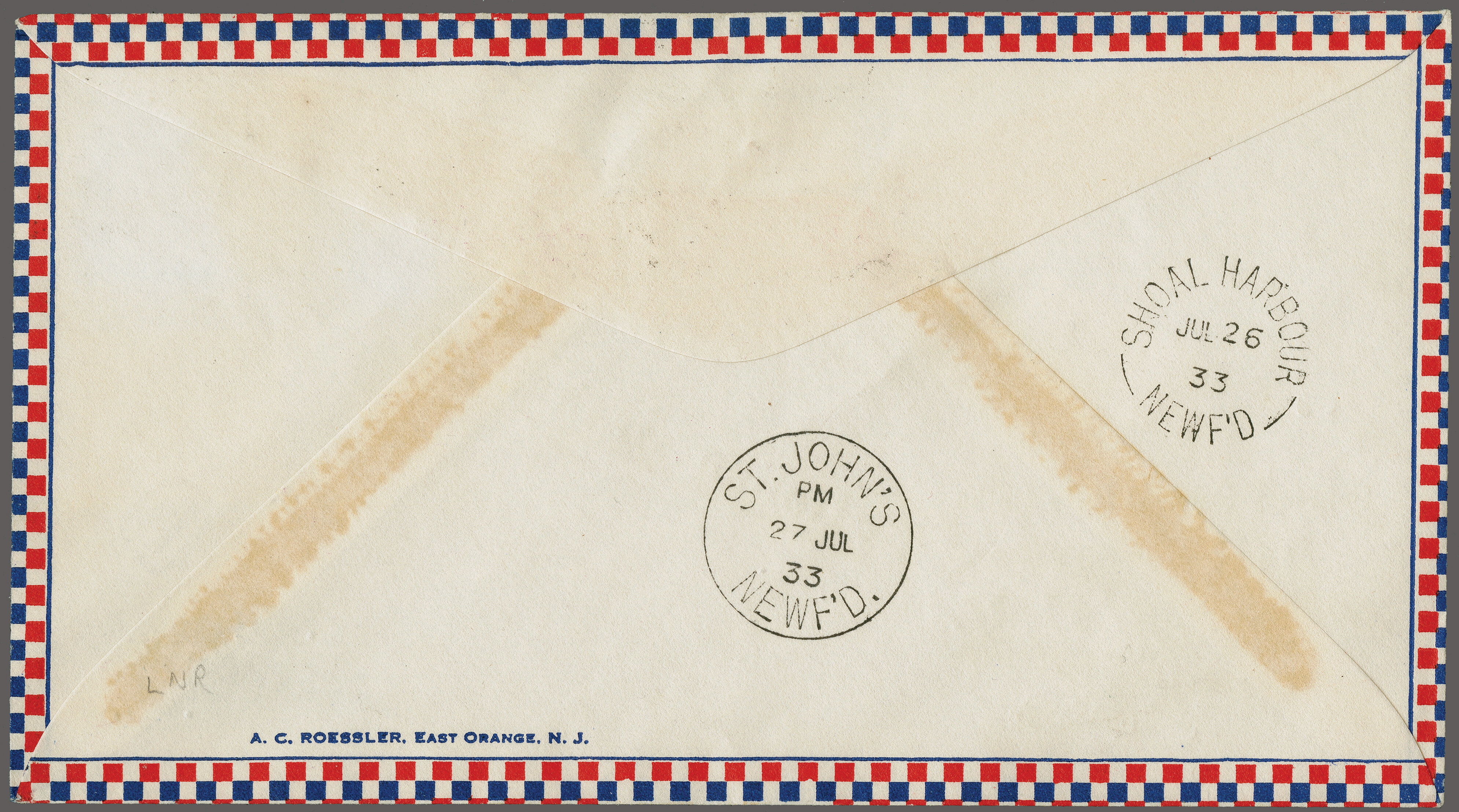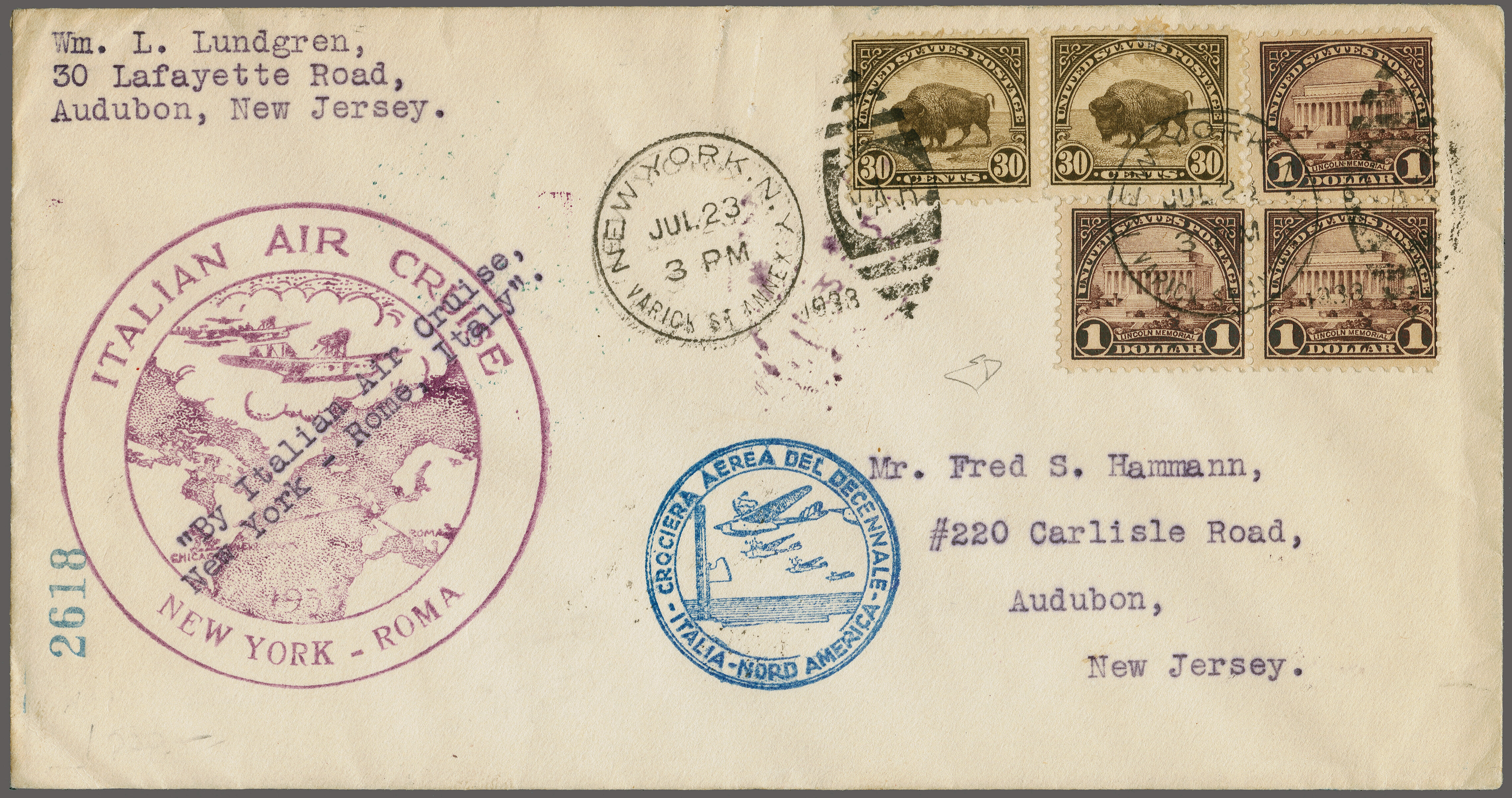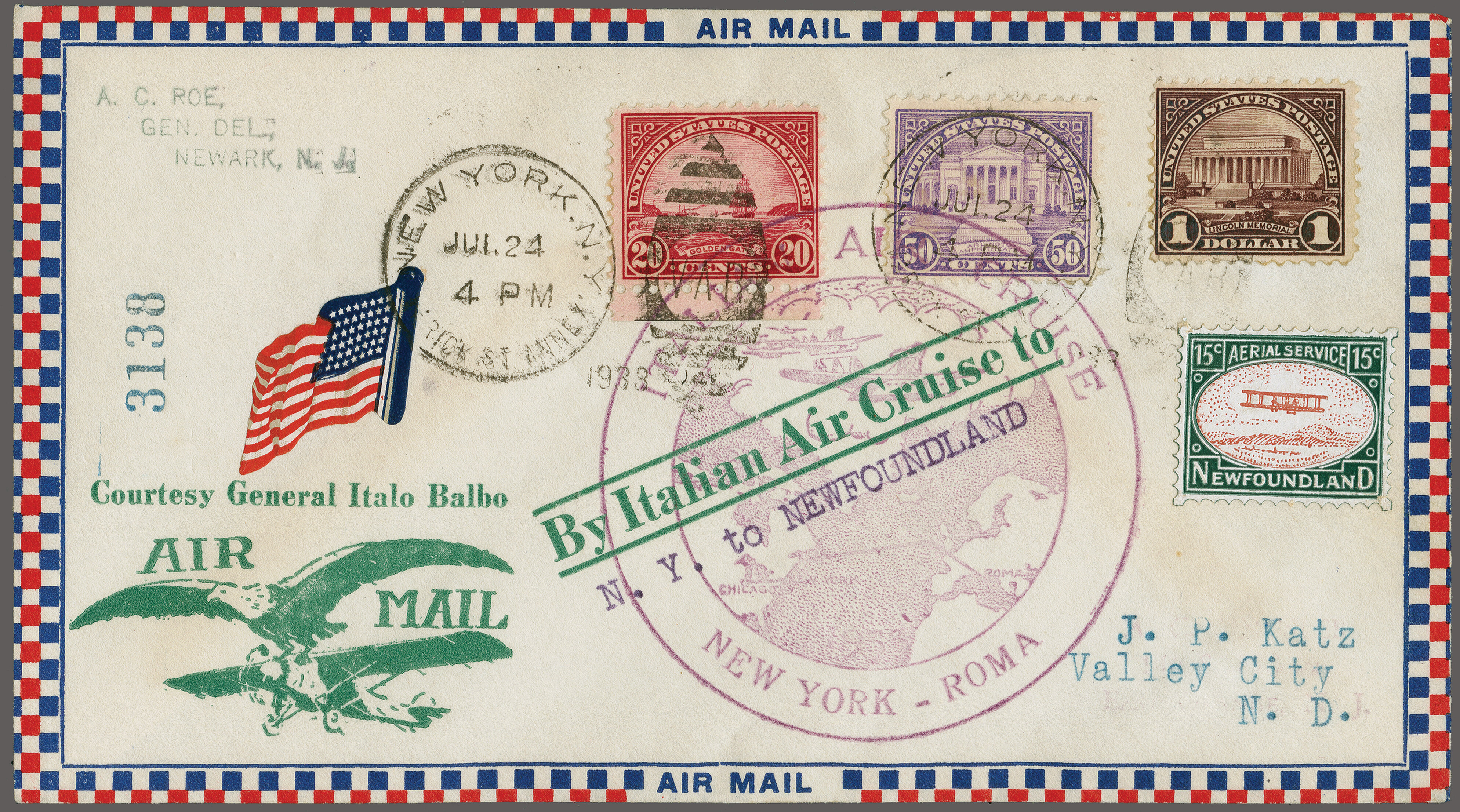 1759 cover image'Balbo Squadron' Return Flight New York, NY, USA - Shediac, Canada - Shoal Harbour, Newfoundland 1933 (July 24): Roessler pre-printed flight cover No.'3138', endorsed typewritten 'N.Y. to Newfoundland' and violet 'New York to Rome' special flight cachet, franked with US$ 1.70 c., cancelled with "New York Jul.24" duplexes, with unused 15 c. 'Roessler' label added, backstamped "Shoal Harbour Jul 26 33" and "St. John's 27 Jul.33" on reverse Longhi 2945 = € 2'000. (Image 1) (Image 2)