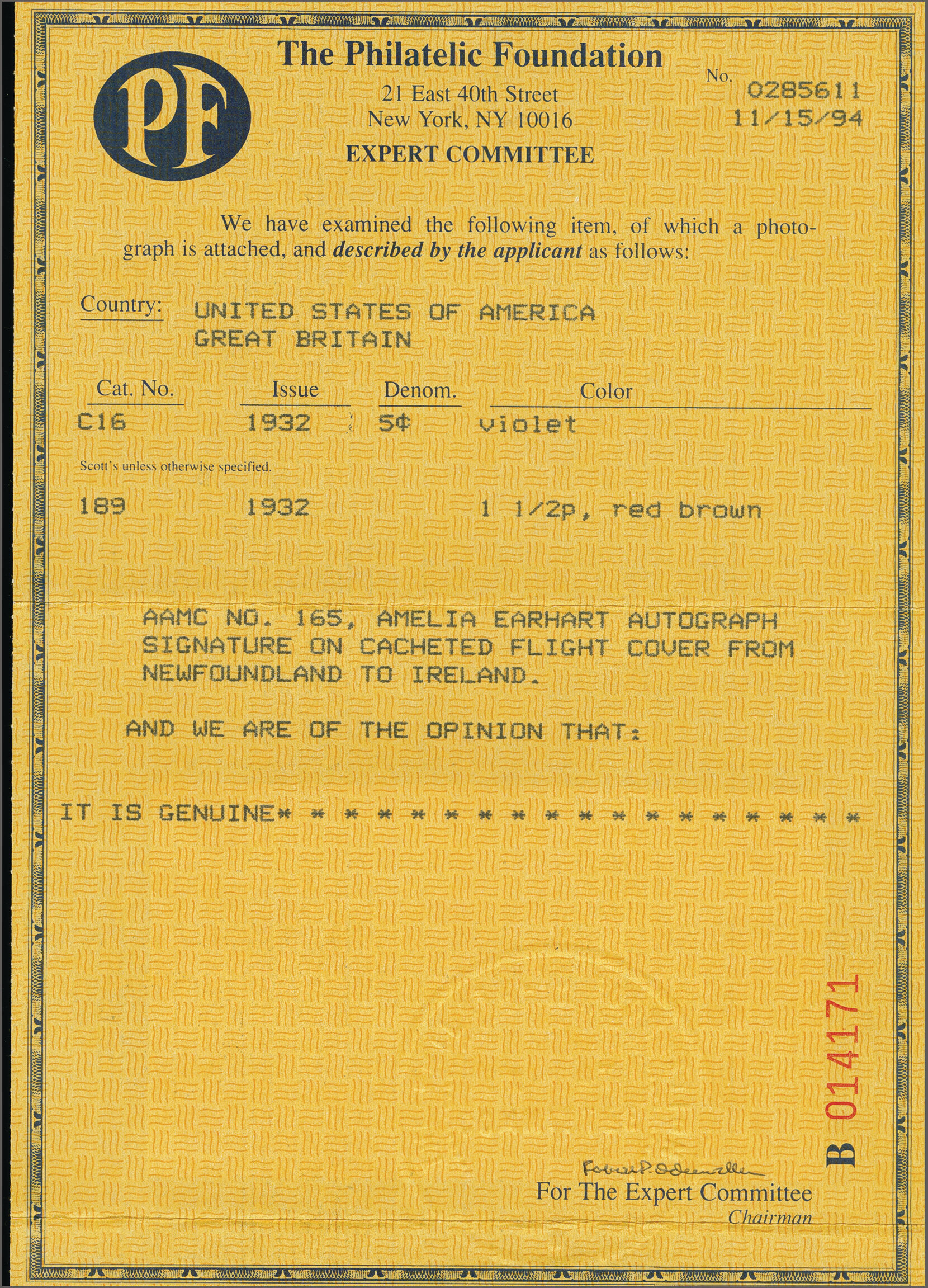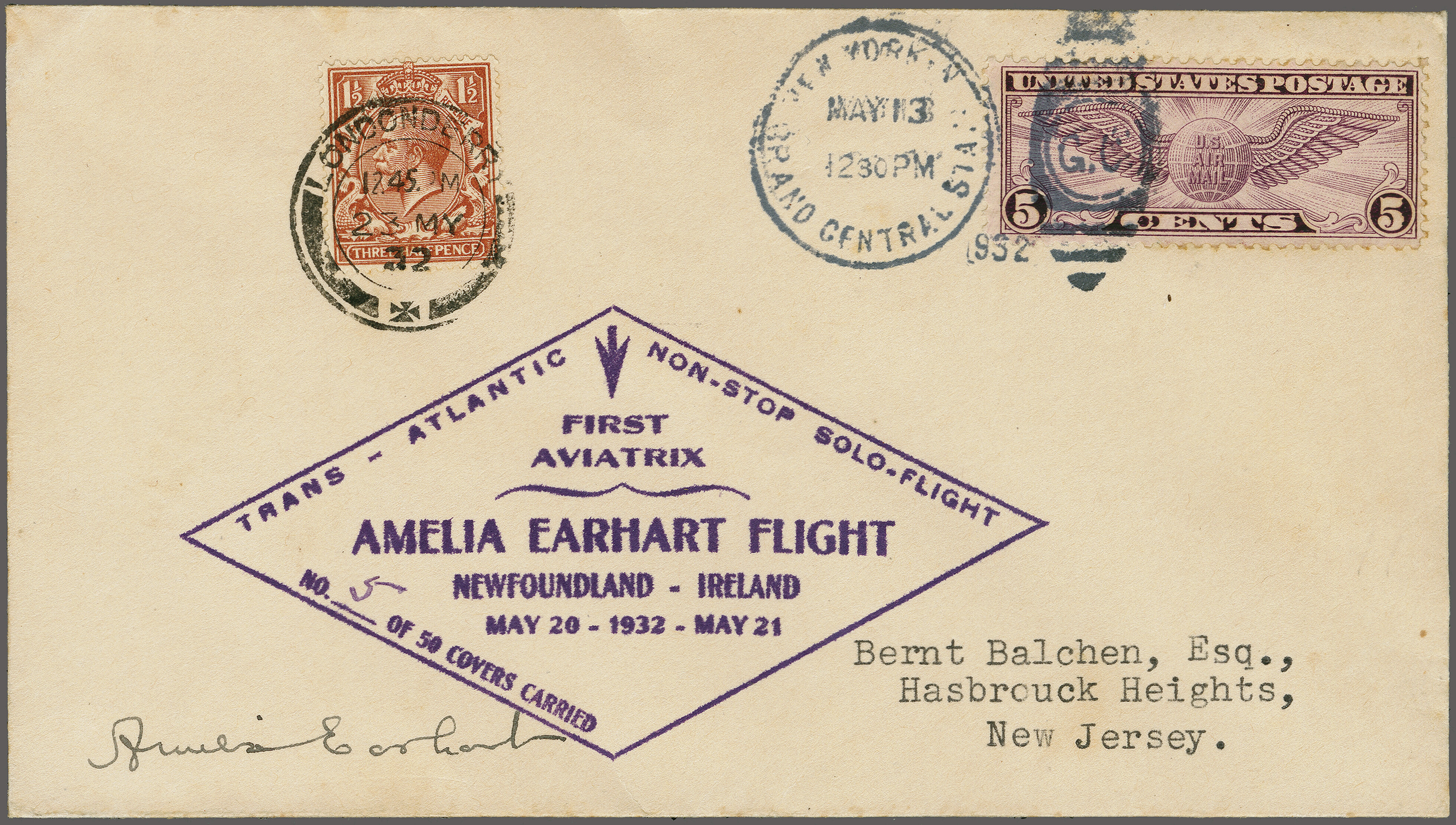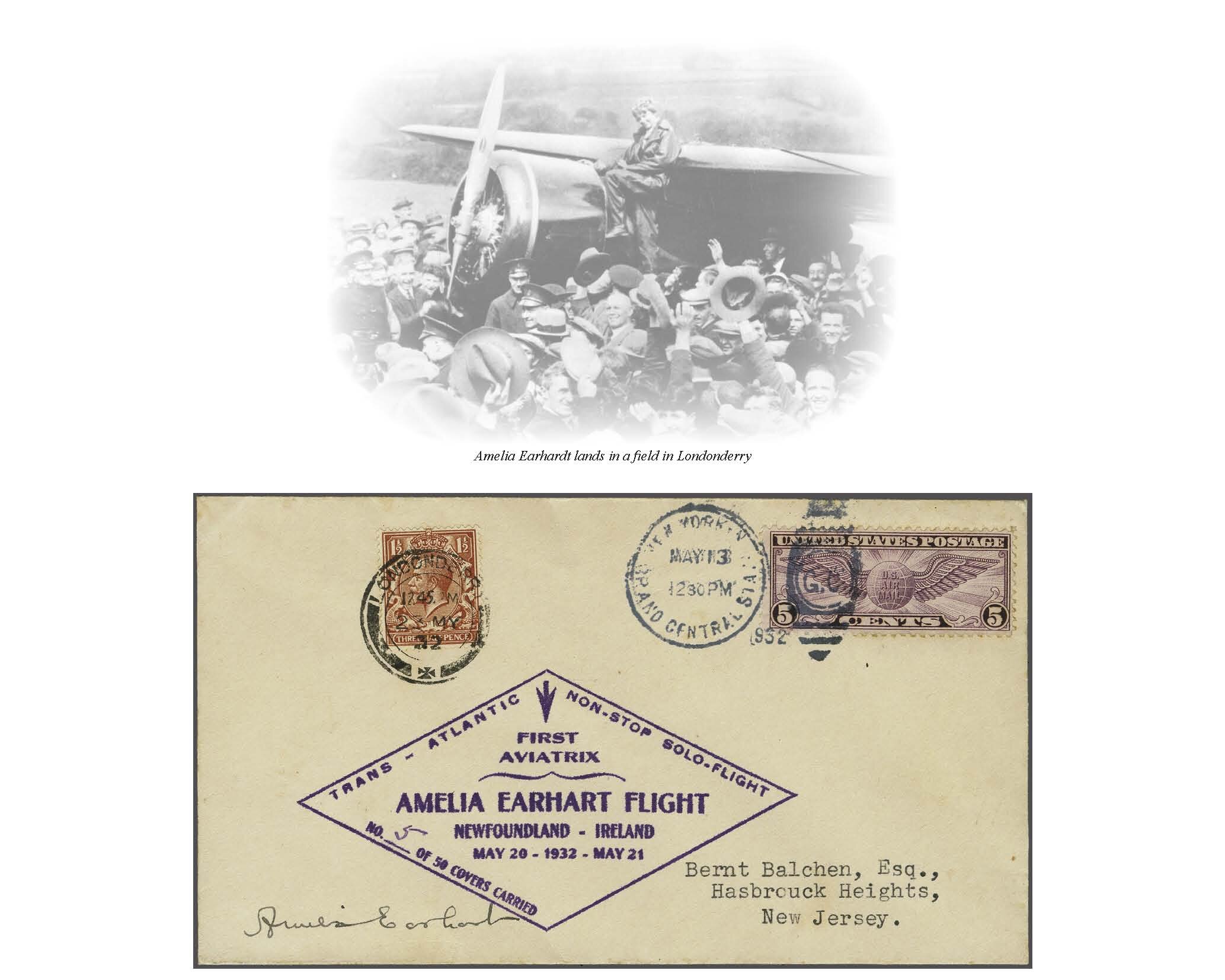 1761 cover image1934 (Dec. 19): Amelia Earhart envelope No. 5/50 of her Trans-Atlantic Solo Record Flight Newfoundland to Ireland 1932 (May 20/21), franked with Air Mail 5 c. tied by New York Grand Central duplex cancellation May 13, violet special cachet, additionally franked on arrival with GB 1½ d. with Londonderry cancellation (May 23), signed by the Avaitrix at lower left. A fine and rare cover. Cert. Philatelic Foundation (1994) Amelia Earhart Putnam became the first woman to fly solo across the Atlantic in her Lockeed Vega 5B and the first pilot to repeat the feat, landing her plane in a pasture at Culmore near Londonderry, Ireland, after she contended with strong northerly winds, icy conditions and mechanical problems. Earhart took off from Harbor Grace, Newfoundland on May 20th at 3:51 P.M., after 14h 54’ she landed in Ireland and continued the flight to London, arriving May 22nd. (Image 1) (Image 2) (Image 3) (Image 4)