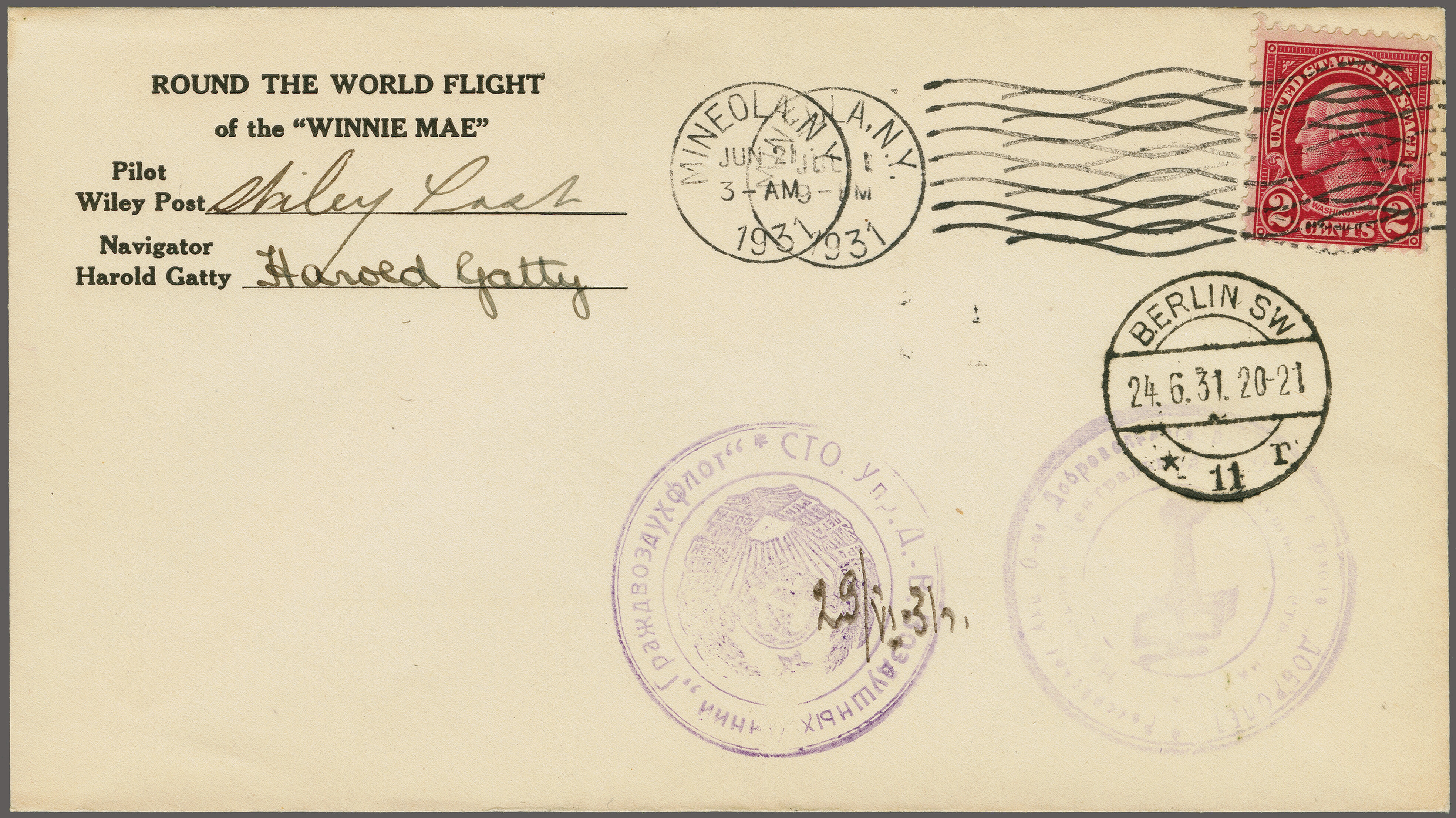 1751 cover image'Winnie Mae' Speed Record Round-the-world World Fligt by Wiley Post and his Navigator Harold Gatty 1931 (June 21): Pre-printed envelope, signed by Wiley and Gatty, franked with 2 cts carmine, cancelled on departure by machine cancellation "MINEOLA, N.Y., JUNE 21 3-AM 1931", as well as on arrival "MINEOLA, N.Y., JUl 1 9-PM 1931", with "Berlin SW 24.6.31" transit cds. and Moscow special cachets with handwritten date '29/VI 3h'. (Image 1) (Image 2)