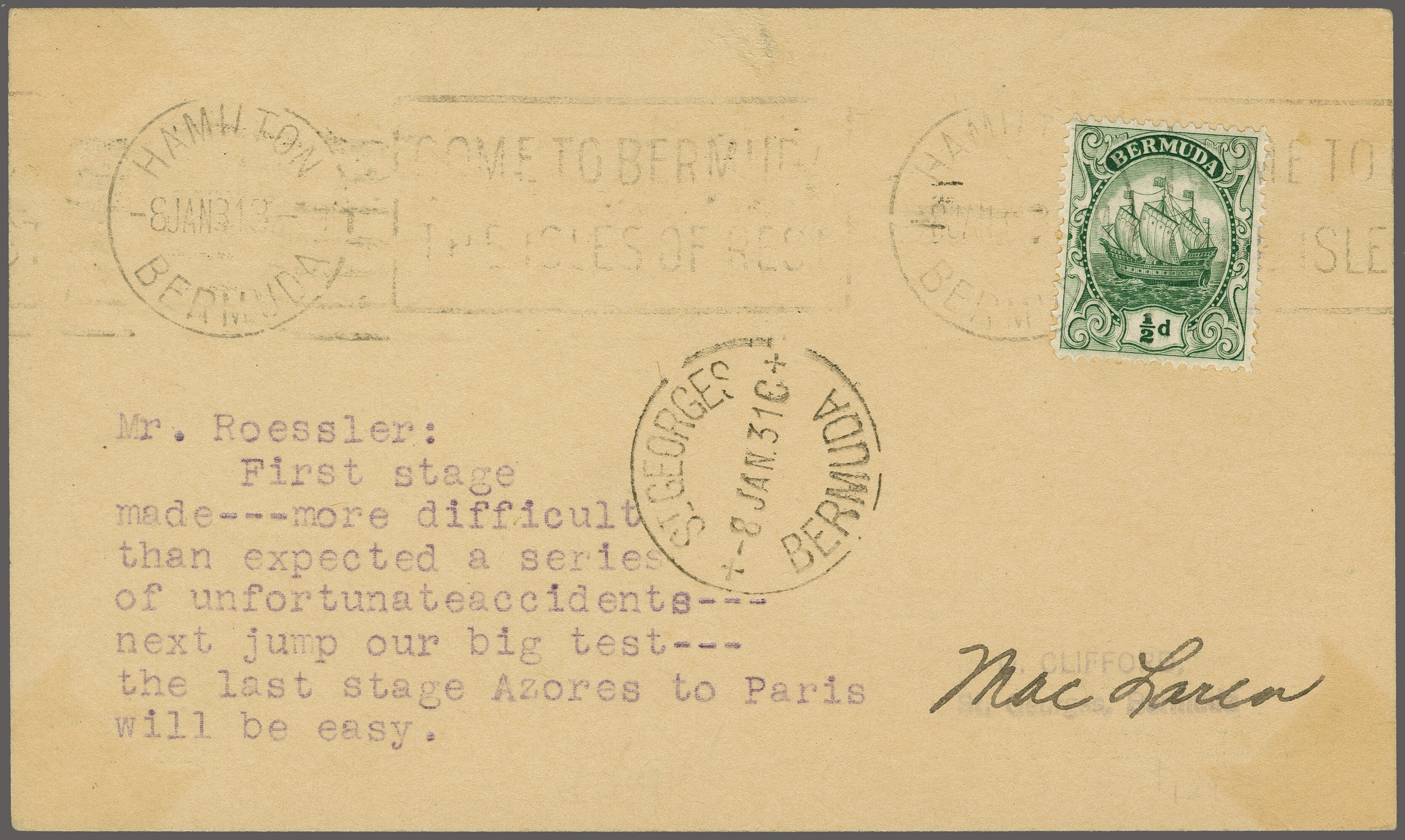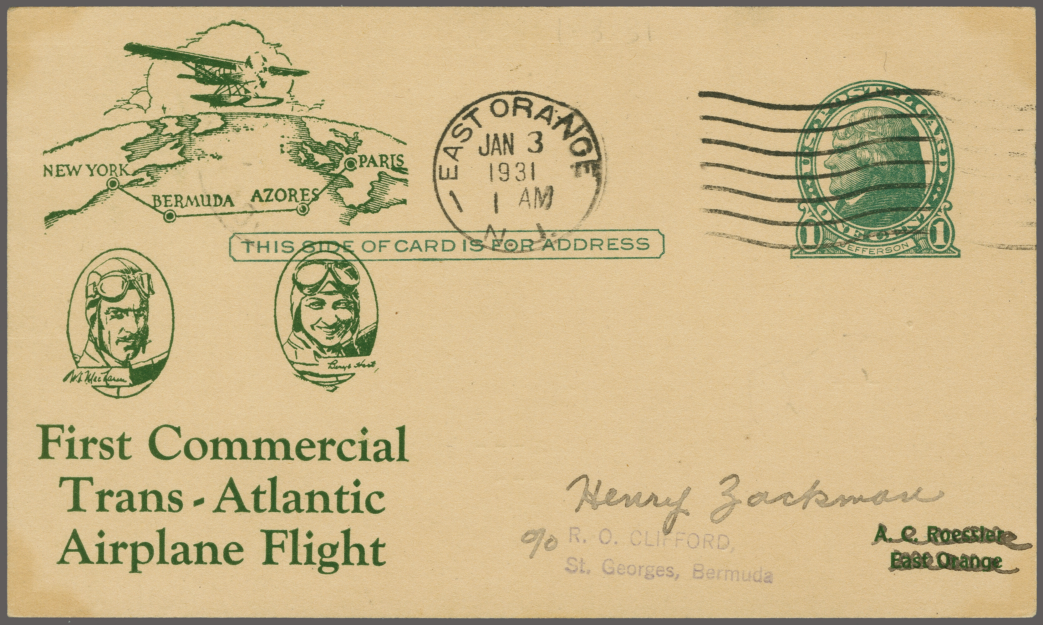 1749 cover imageFirst Commercial Trans-Atlantic Airplane Flight 1931 (Jan.3): Special printed 1c. stationery card cancelled in "East Orange Jan 3 1931' of first stage to Bermuda, franked on reverse with Bermuda 1/2d tied by "Hamilton Bermuda 8.Jan. 31" machine cancel and additional "St. Georges Bermuda 8.Jan. 31C" also applied on reverse, addressed to Roessler with typewritten message "First stage made - more difficult that expected a series of unfortunate accidents - next jump our big test - the last stage Azores to Paris will be easy", signed by Lt. Wm. S. MacLaren. (Image 1) (Image 2)