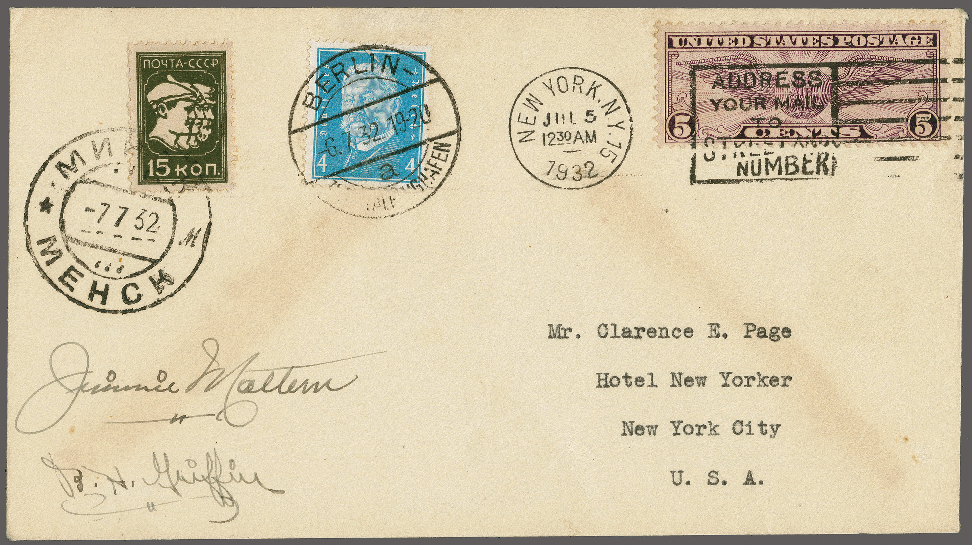 1754 cover imageMattern and Griffin Round the World Flight 1932 (5 July): Cover franked with 5c U.S. (New York July 5), 4pfg. Germany (July 7) and 15k Russia (cancelled Minsk 7.7), addressed to Clarence E. Page and autographed by both pilots, some usual minor flaws and toning, of no consequence.The U.S. pilot Jimmy Mattern, together with Lt. Griffin, took off from Floyd Bennet Field in an attempt to beat the round-the-world record held by Post and Gatty. The fliers landed in Berlin after a trip of 31 hours and 41 minutes from New York, via Harbor Grace. They later reached Moscow, but cracked up on their hop to Siberia. One of only 10 (!) covers carried on this flight AAMC TO 1167. (Image 1) (Image 2)
