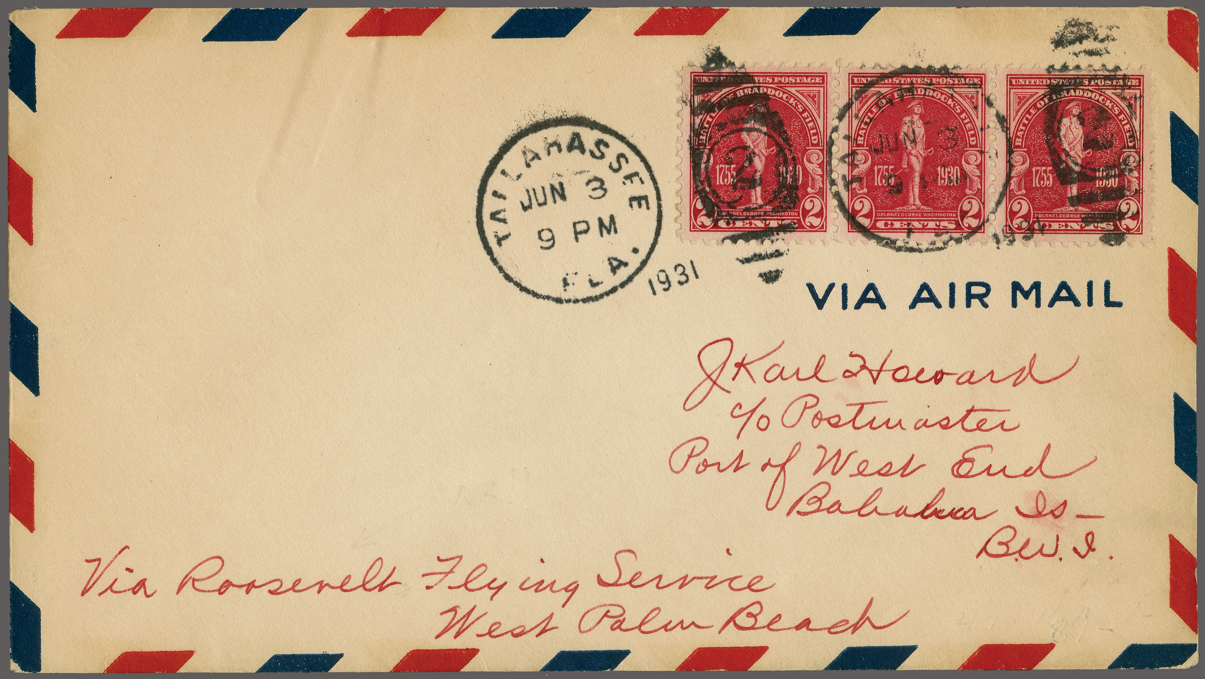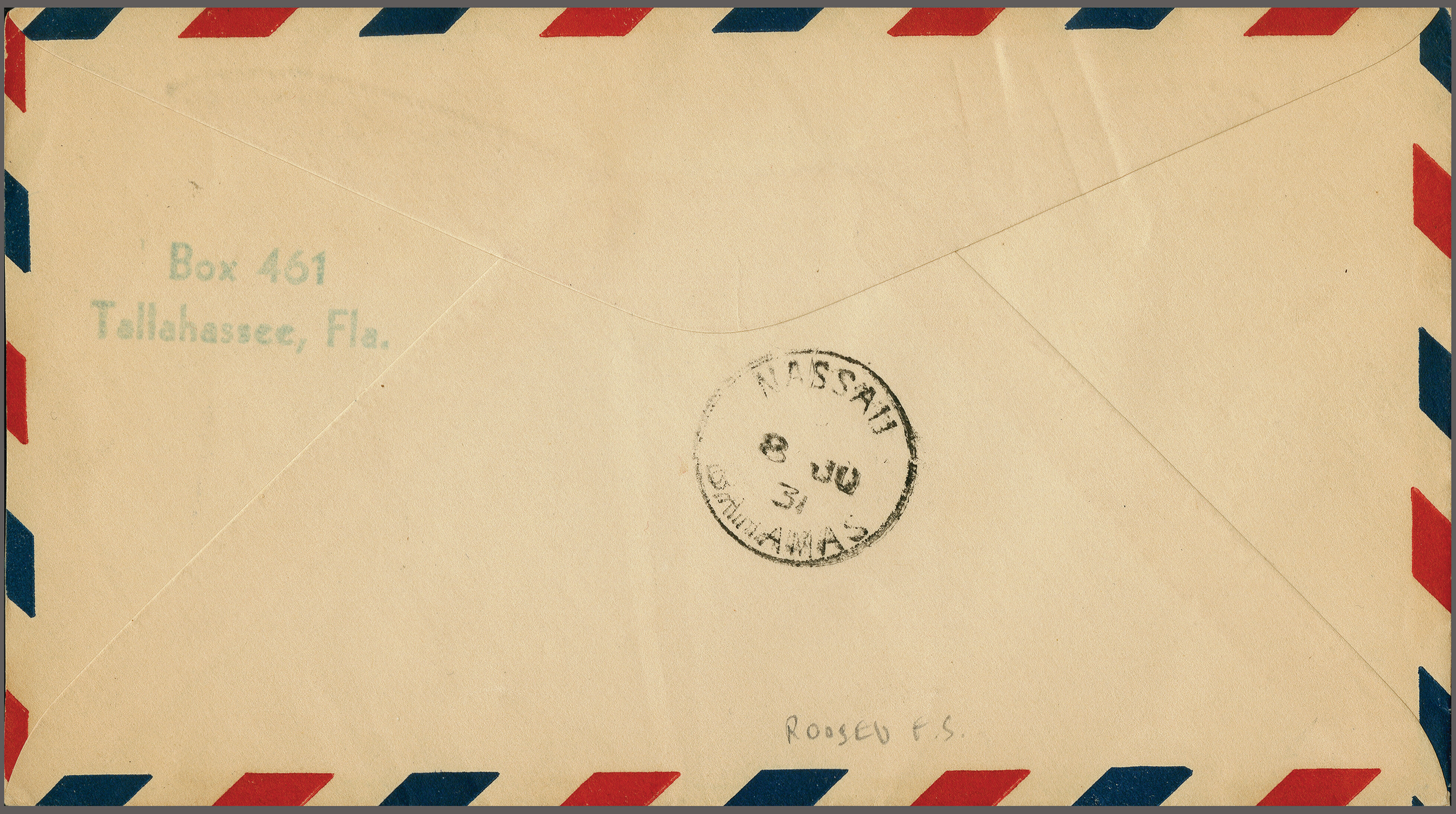 1750 cover imageRoosevelt Flying Service Tallahasee FL - Bahamas 1931 (June 3): Airmail envelope franked with 6c, with 1c over paid, twice cancelled by WTallahassee JU 3 9PM" and backstamped "Nassau, Bahamas, June 8th, 1931". Unlisted flight, only few letters carried for personal delivery , mainly with special greetings between officials. Fine and rare. (Image 1) (Image 2)