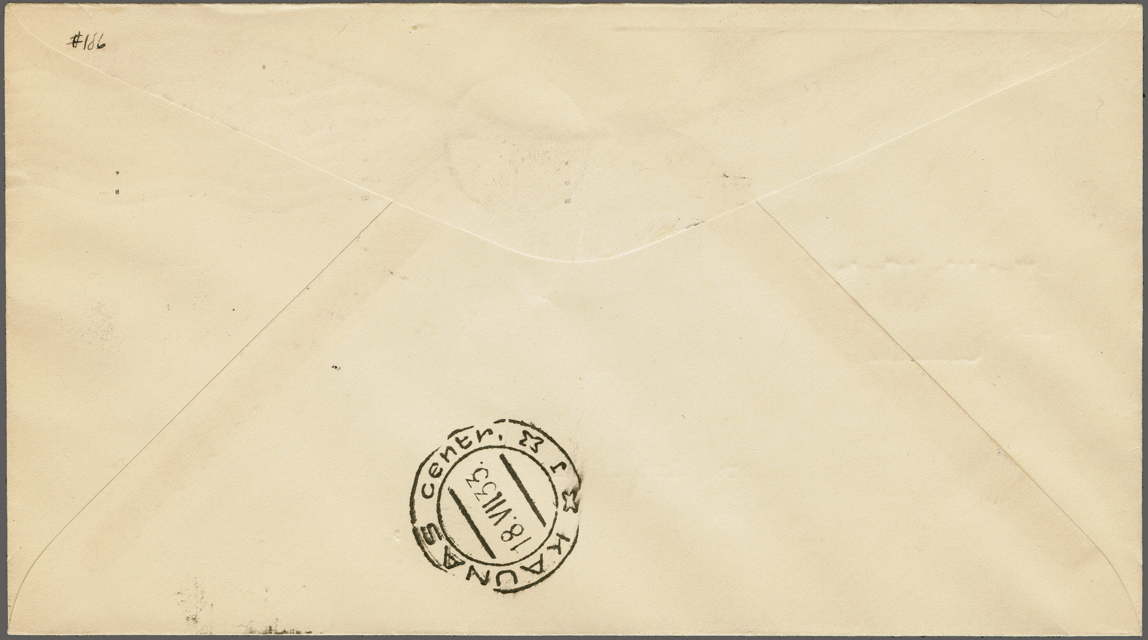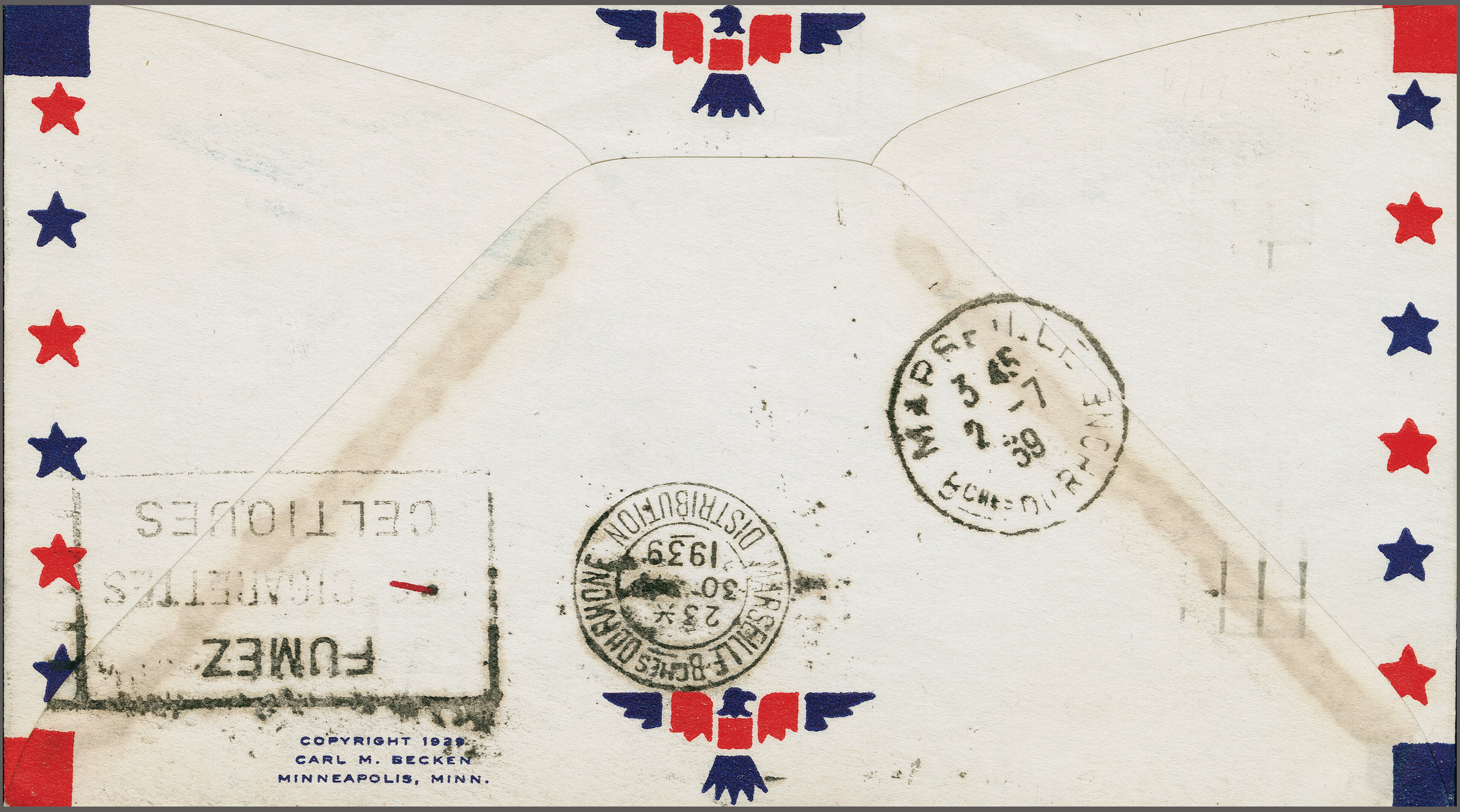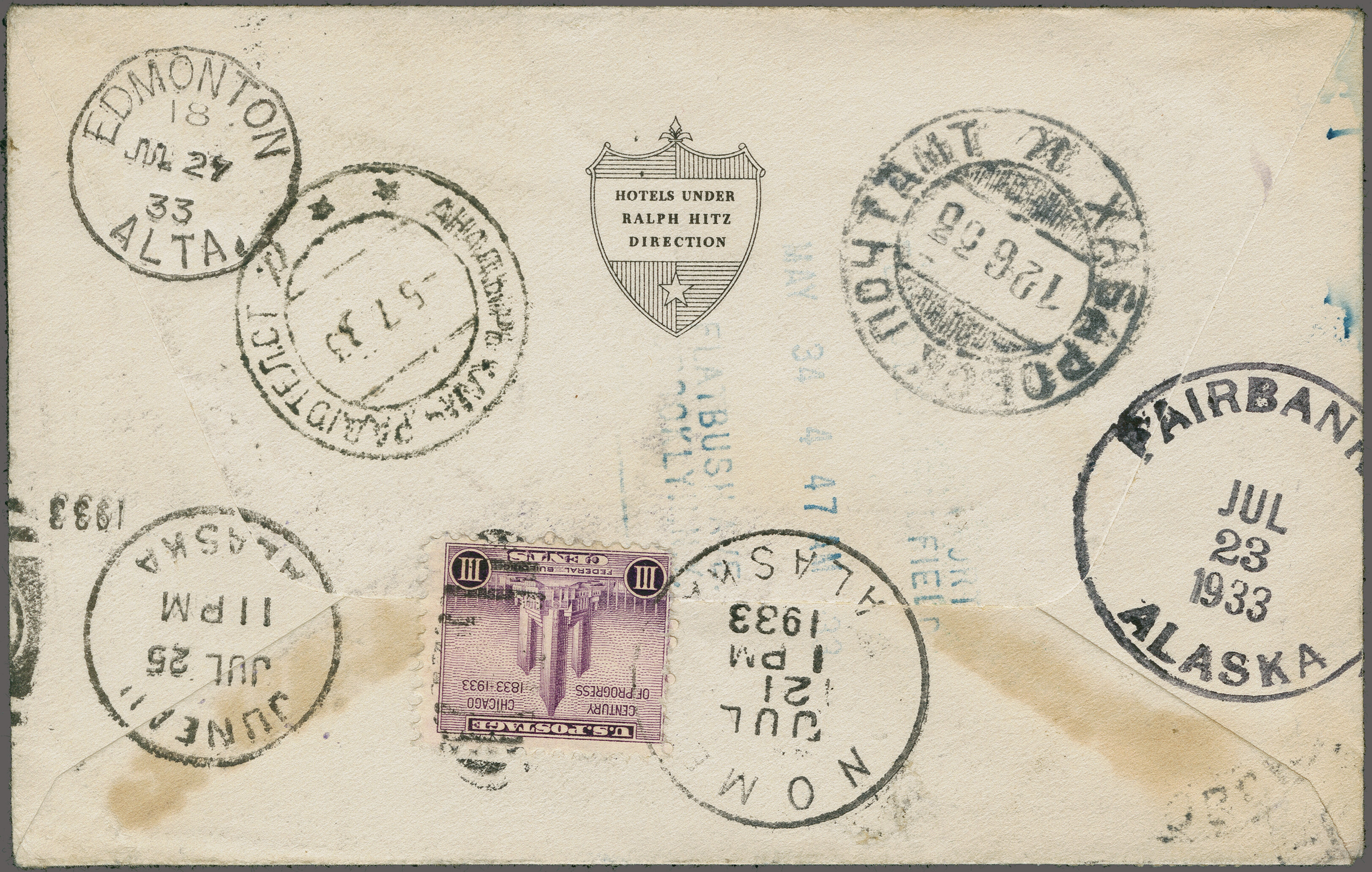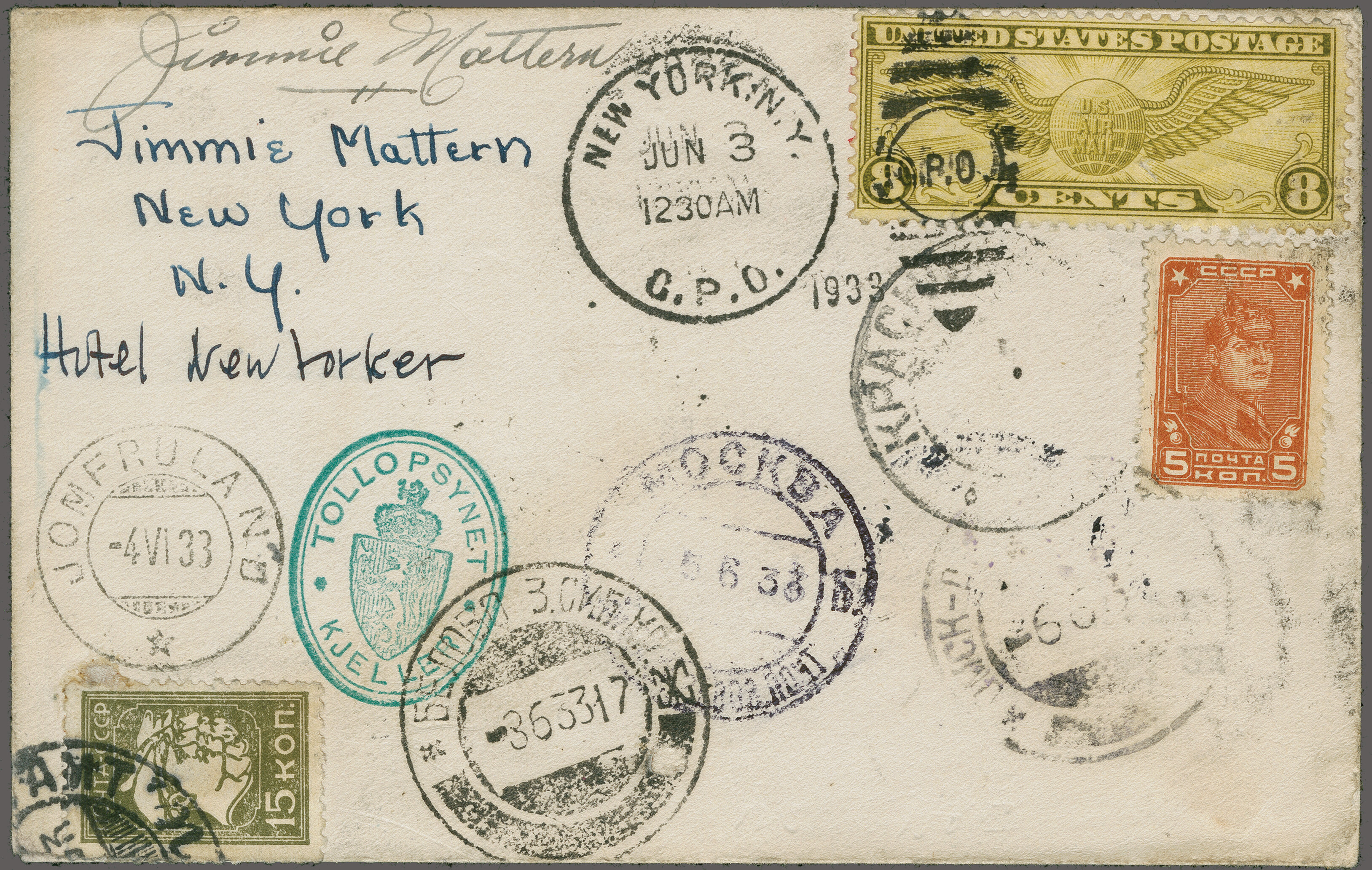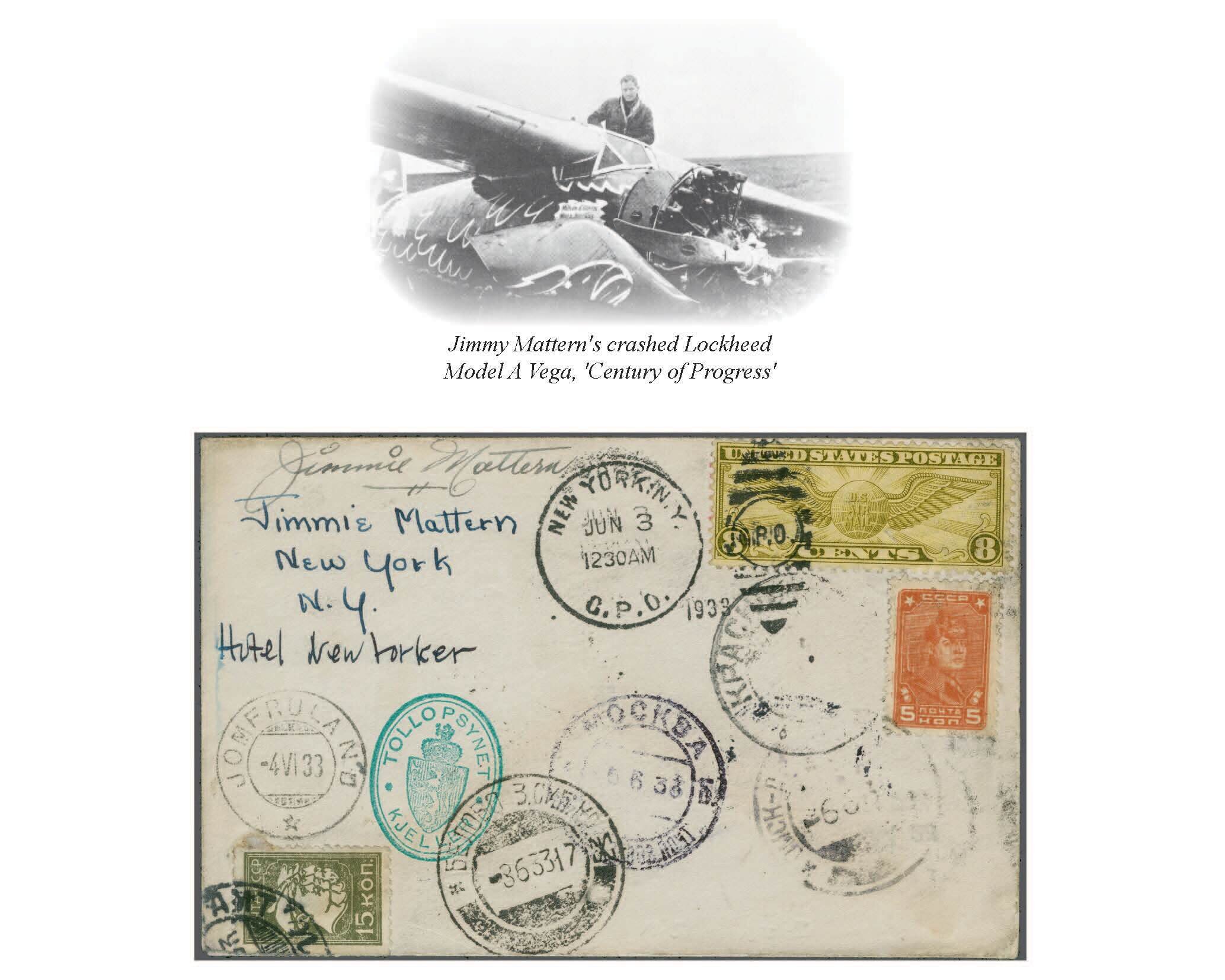 1755 cover imageAttempted Round the World Solo Flight by Jimmy Mattern 1933 (June 3): Cover franked with 8c. for domestic air mail, cancelled at departure "New York June 3", backstamped in Jomfruland (June 4), Moscow (June 5), Omsk (June 6), Belovo (June 8), Krasnoiarsk (June 9), Khabarovsk (June 12), Anadyr (July 5), Nome (July 21), Fairbanks ( July 23), Juneau (July 25) and Edmonton (July 27). The cover is signed by Jimmy Mattern, who attempted to circle the globe in record time. Leaving New York, he flew nonstop to Jomfruland, Norway. The next stop was Moscow, but he was lost near Anadyr, Siberia and no communication was received for two weeks. Jimmy was finally rescued by the famous Russian flyer Levanevsky and flew on his plane to Nome, Alaska. From there, Mattern secured another airplane and continued back to New York. He carried a few covers which have postmarks showing the history of the flight. Minor cover wear and tear. A very rare cover. (Image 1) (Image 2) (Image 3)