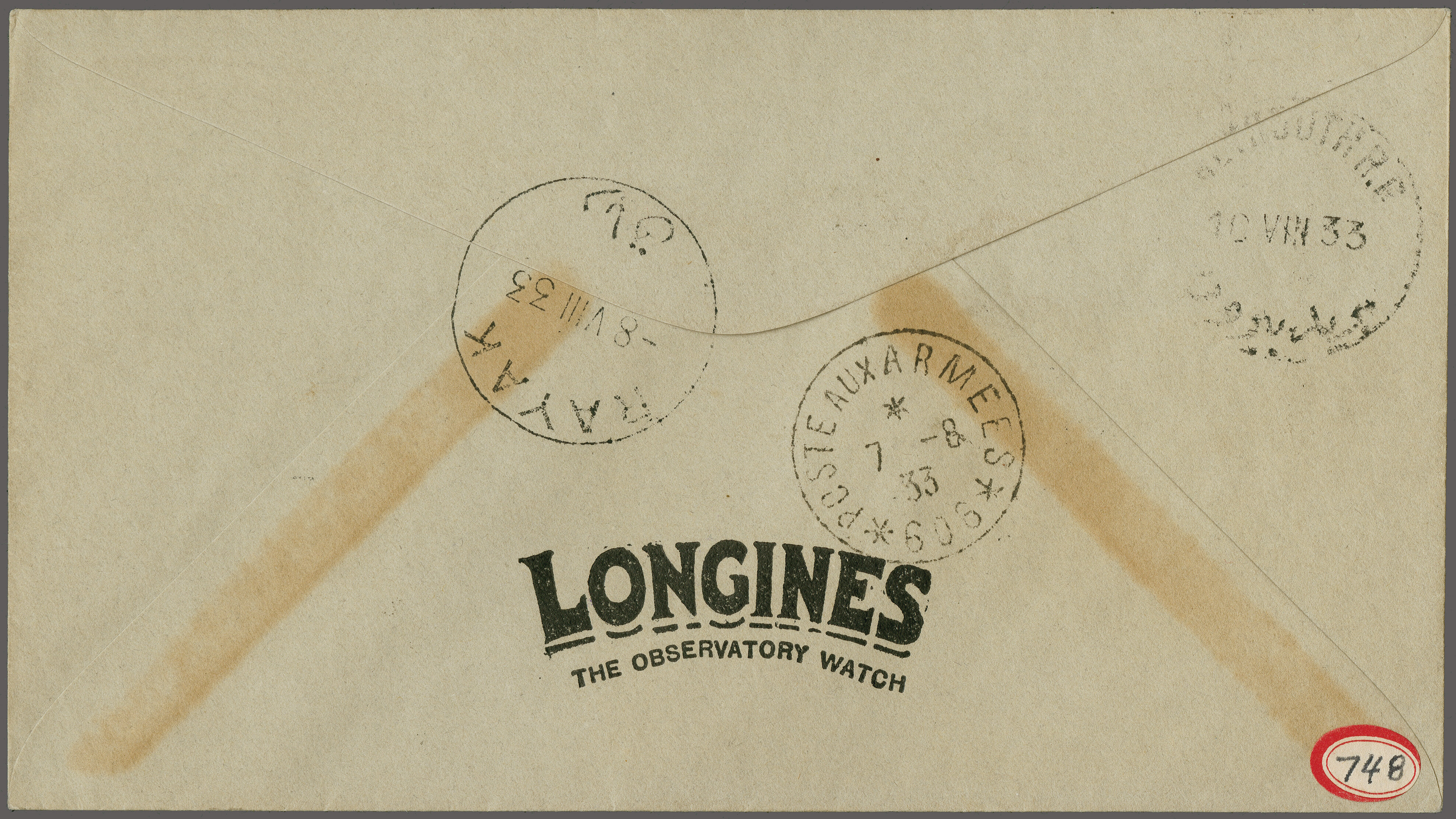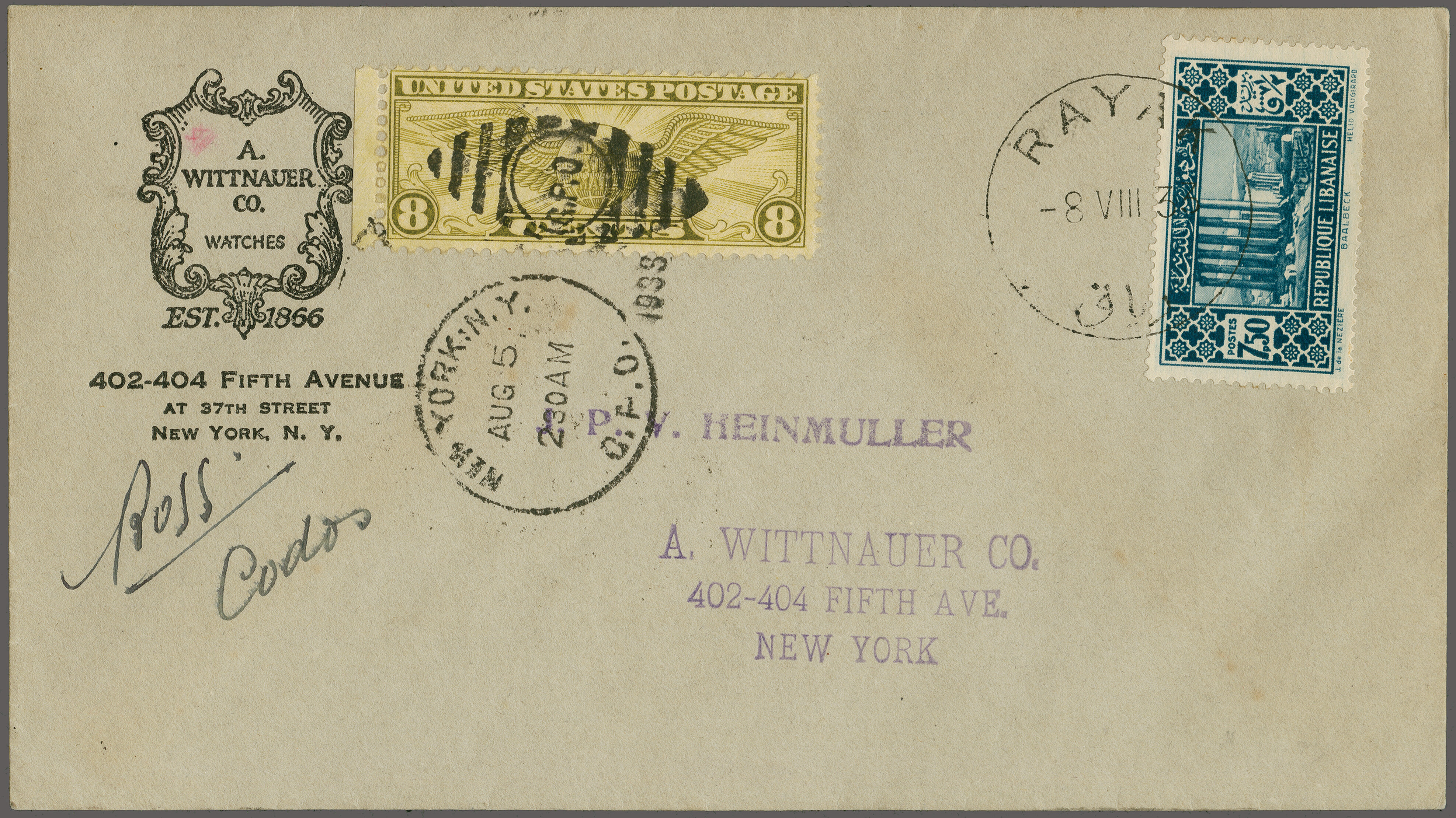 1760 cover imageLong Distance Record Flight, New York - Syria 1933 (Aug. 5), 'Longines-Wittnauer' cover with U.S. and Lebanese combination franking, tied by "New York Aug. 5 1933" duplex and "RAYAK 8.VIII.33" arrival cds., backstamped by "Poste aux Armées 7-8 33", signed by Codos and Rossi. Very Fine as just 25 covers were carried, and only some of those were signed by the pilots AAMC 1186. (Image 1) (Image 2)