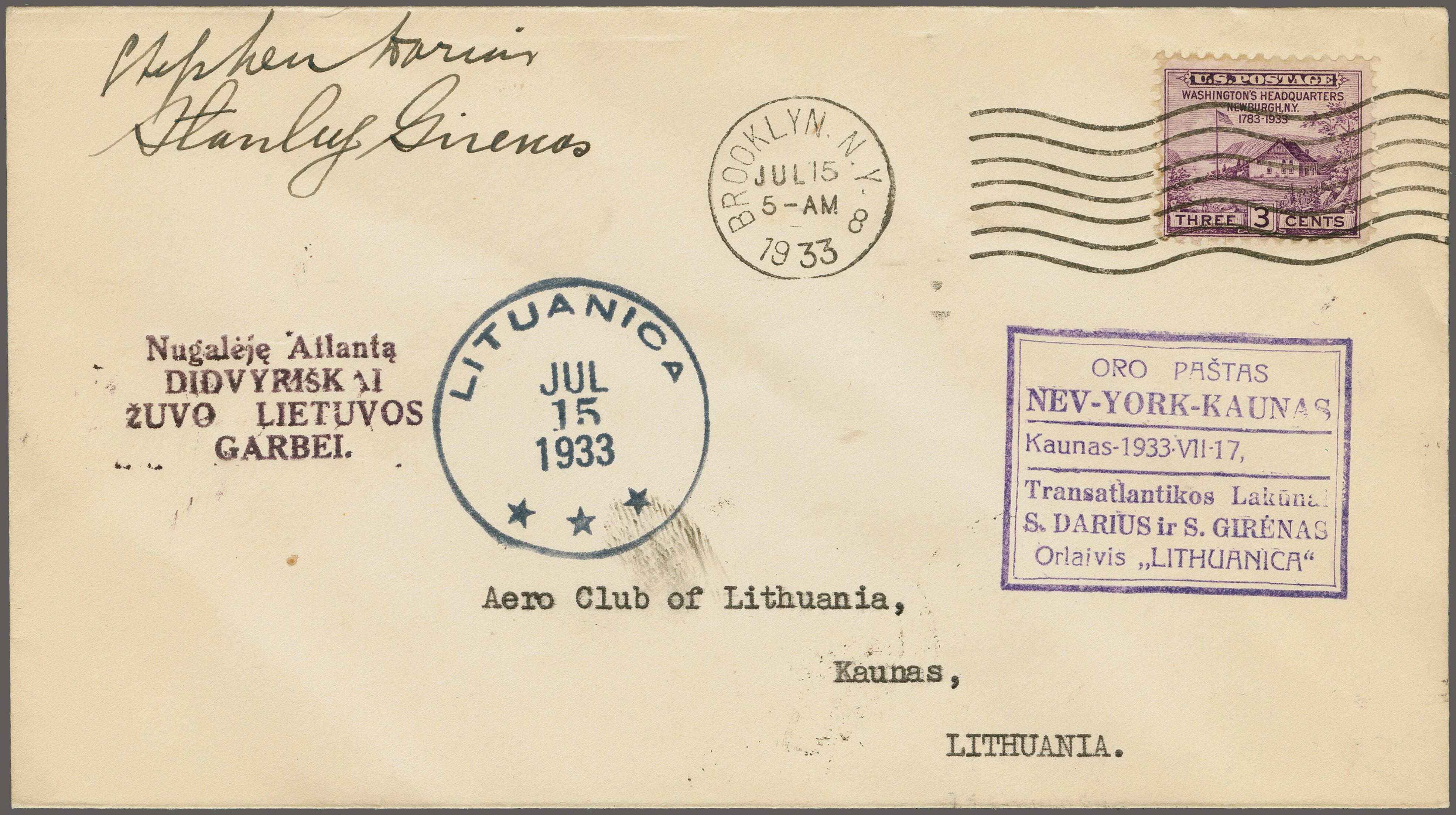 1757 cover imageAttempted Ocean Flight New York - Lithuania by Capt. Stefan Darius and Stanley Girenas 1933 (July 15): Flight cover from New York to Kaunas, Lithuania, bearing "Lituanica" and violet boxed 'Oro Pastas Nev-York-Kaunas" special cachets, franked with 3c violet tied by "Booklyn N.Y. Jul 15" machine cancel, Signed by both pilots and backstamped on arrival by "KAUANAS18.VII.33" on reverse. Both fliers died when their plane was wrecked at Soldin, Germany, about 400 miles short of their goal. (Image 1) (Image 2)