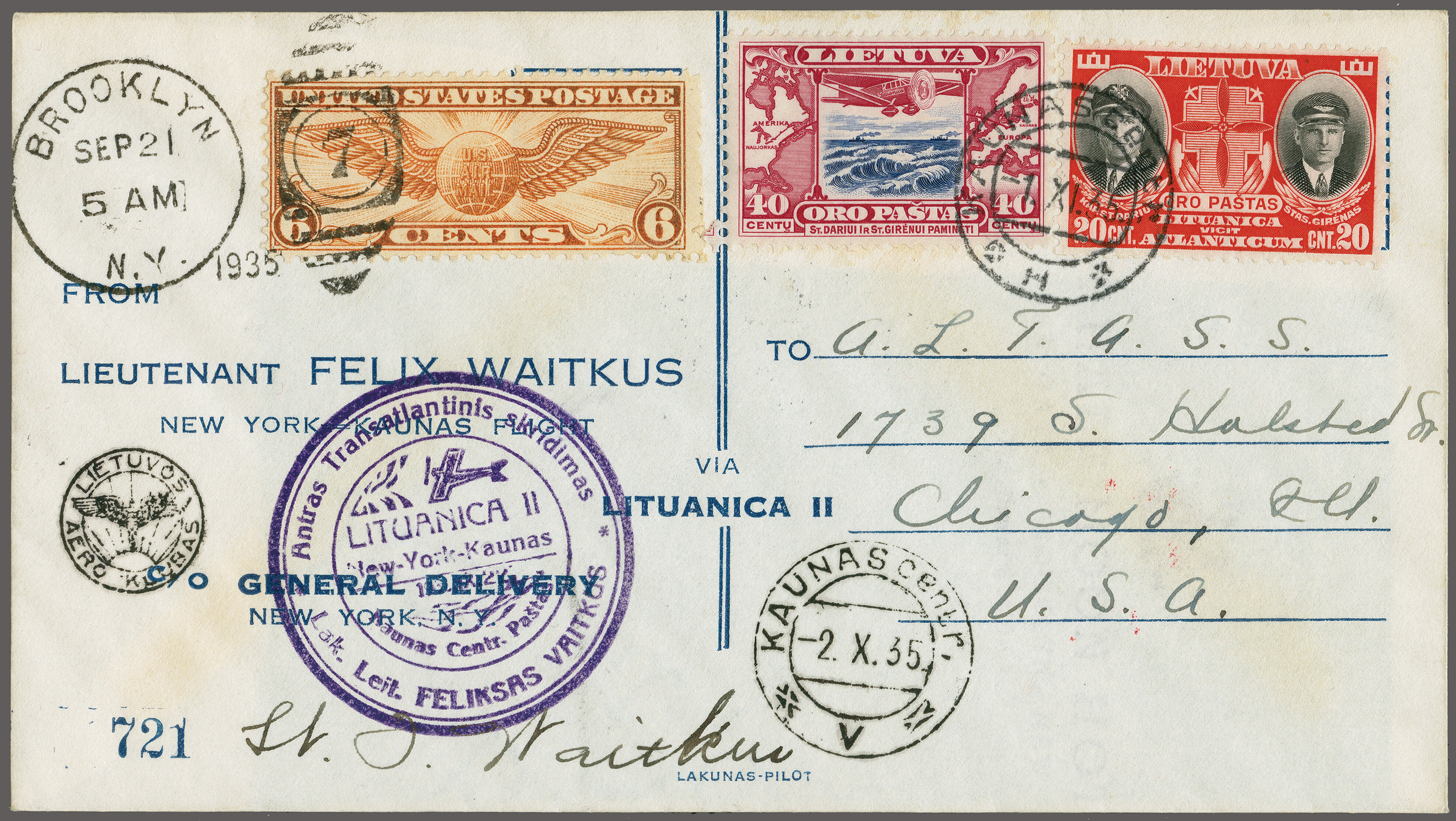 1765 cover imageWaitkus Attempted Non-Stop Flight New York to Lithuania 1935 (Sep. 24): Combination franking with US 6c. tied by "Brooklyn Sep.21" duplex and Lithuania 1935 40c. and 20c. cancelled on arrival "Kaunas 2.X.35" on flown cover, numbered '461' on reverse, addressed by Lt. Felix Waitkus to himself and signed. Fine AAMC 1241. (Image 1) (Image 2)