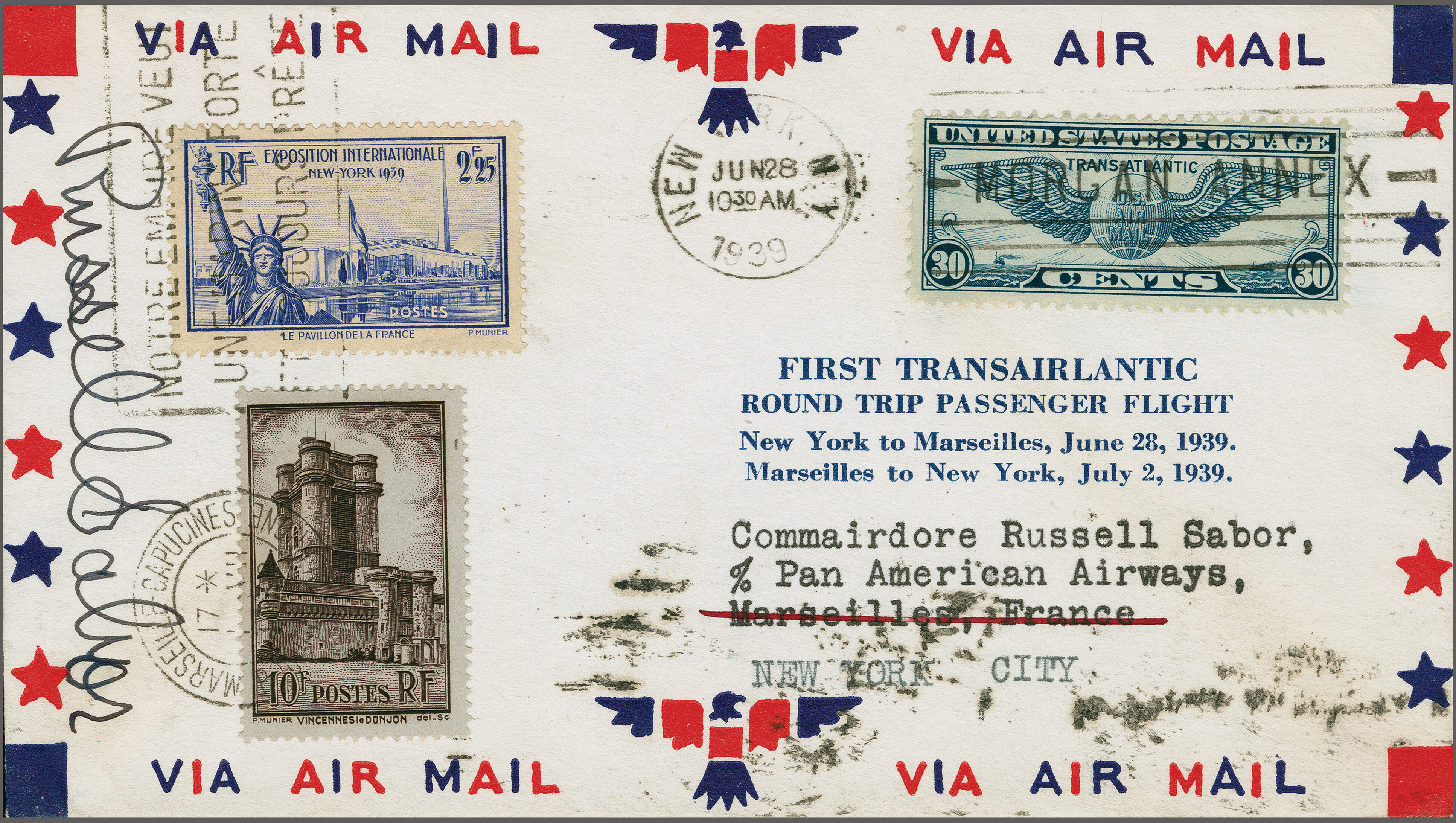 1769 cover image1st Passenger Round Trip Flight by Russel Sabor NY-Marseille-NY 1939 (June 28): Printed 'FIRST TRANSAIRLANTITC Round Trip Passengerflight' airmail envelope from "New York Jun 28 1939" franked with 30c from US and with 12.25F from France representing the 2.25F foreign basic rate and 10F the airmail surtax from France to USA. A fine example signed by Russel Sabor. The first flight of “Dixie Clipper”, pilot Capt. R.D. Sullivan, with passengers on board. Cover signed by a wealthy air travel enthusiast "CommAIRdore" Russell Sabor, who had the distinction to fly on the inaugural PanAm flights over both Atlantic and Pacific. (Image 1) (Image 2)