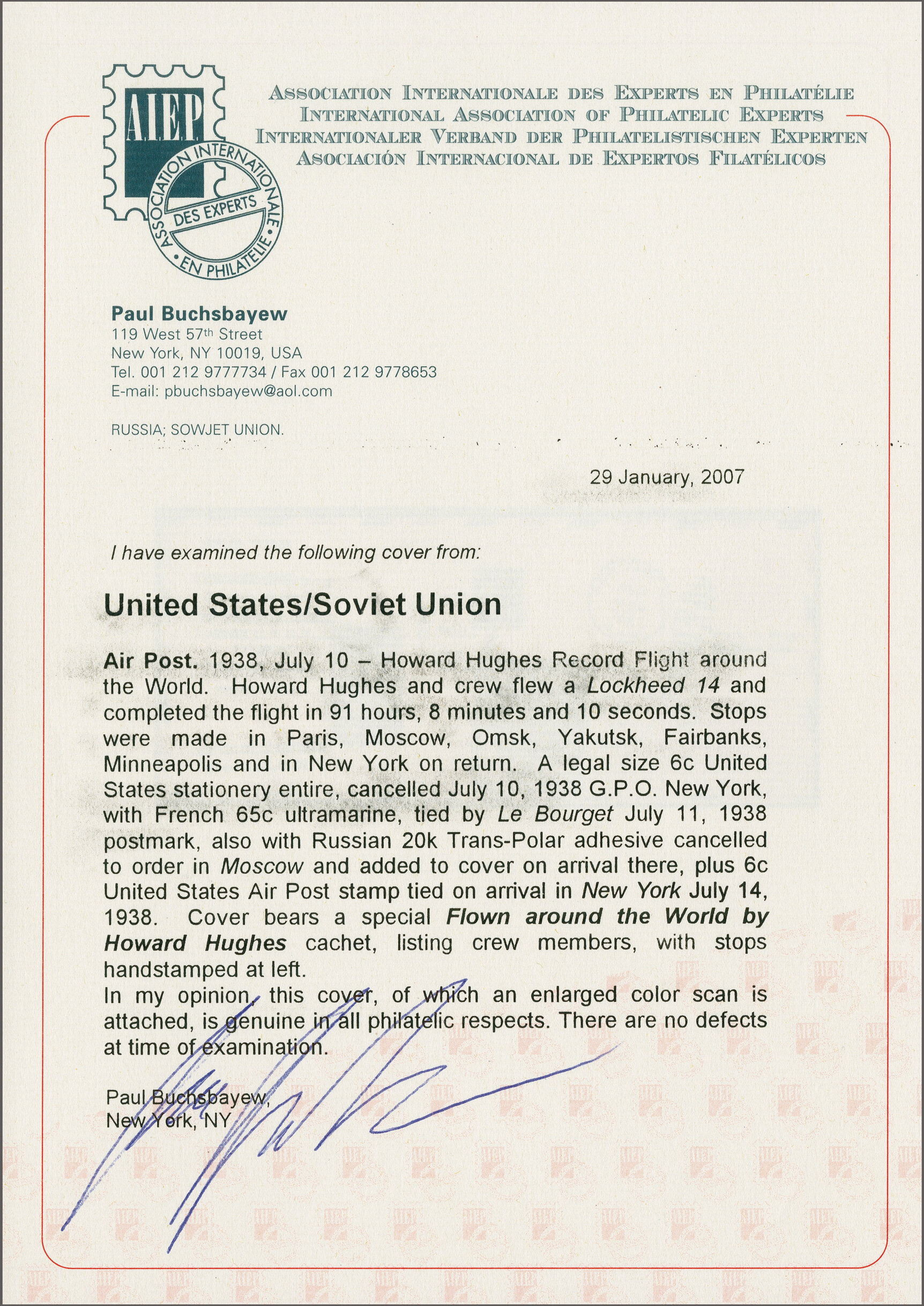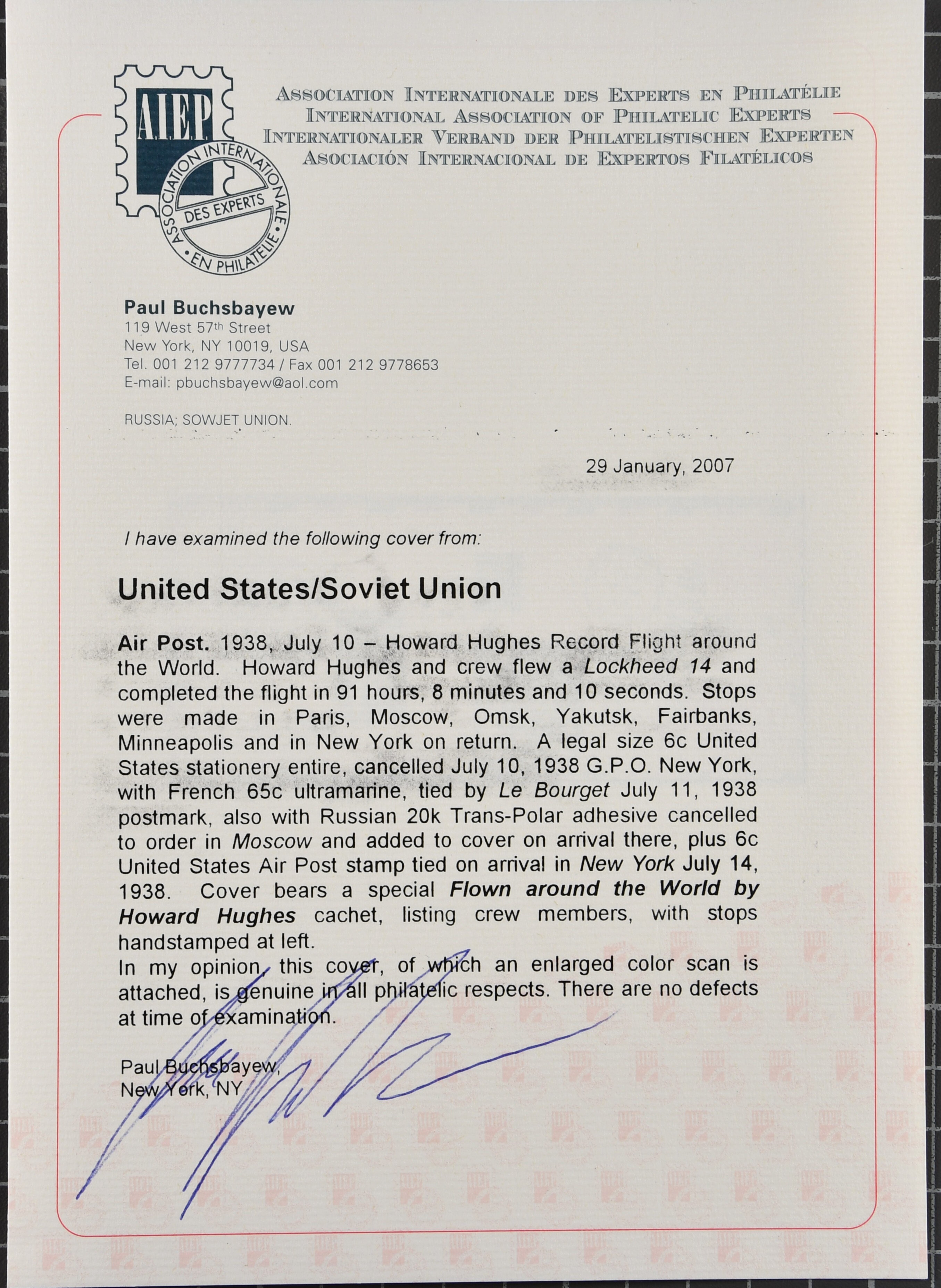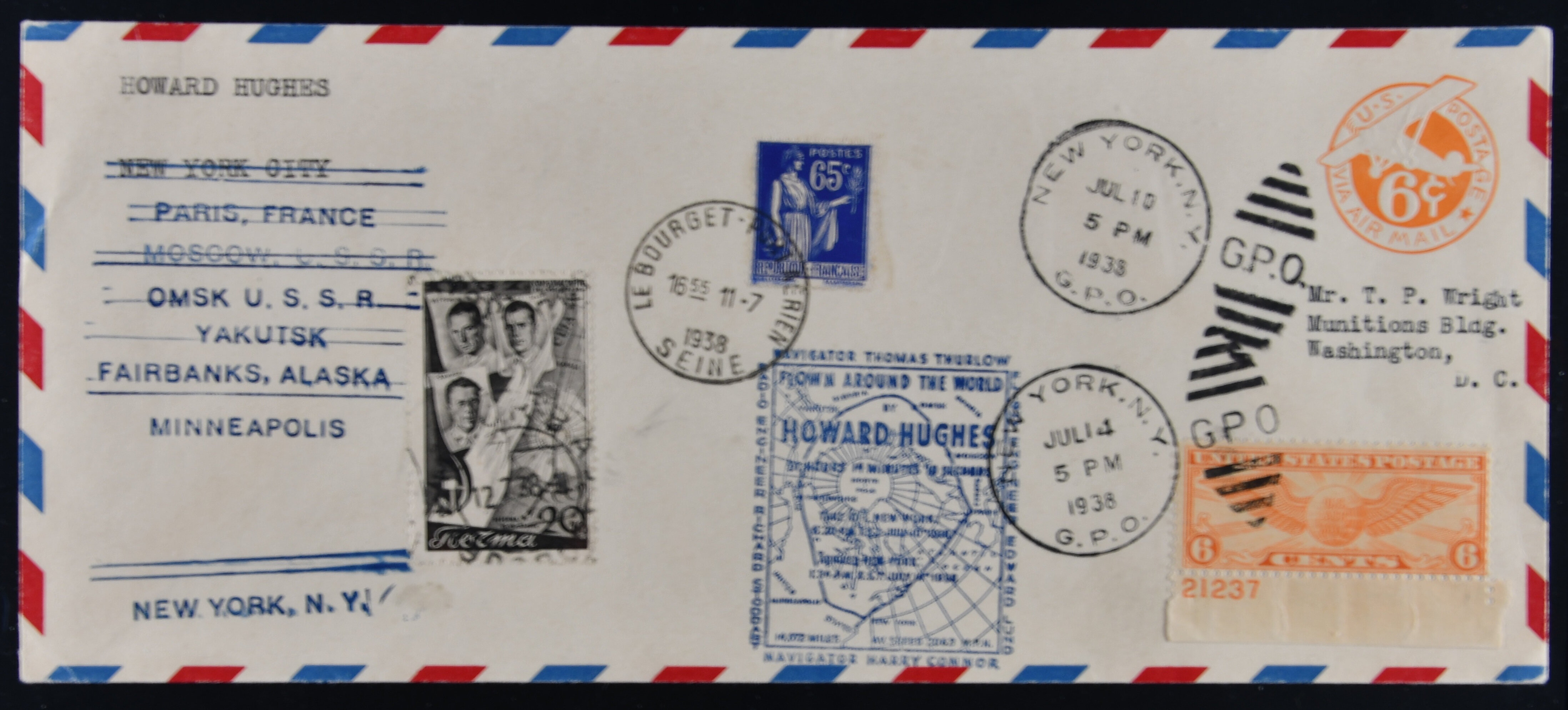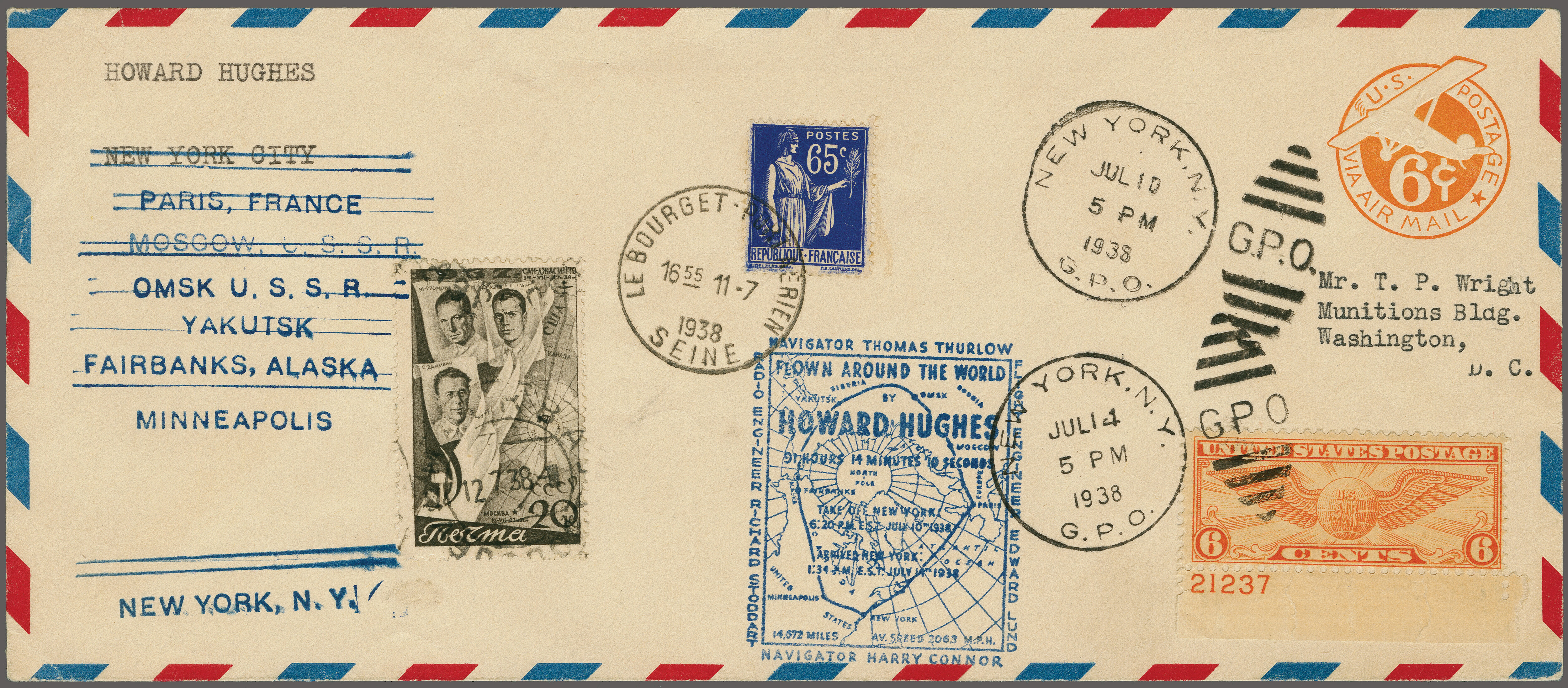 1768 cover imageHoward Hughes Round the World Flight 1938 (10 July): 6c. airpost stationery envelope from New York, franked with U.S., French and Russian adhesives, with appropriate cancels and cachets. Howard Hughes made stops at Paris, Omsk, Yakutsk, Fairbanks, Minneapolis and returned to New York. After the flight, a special cachet, showing the route, was applied. The flown covers were not sold to the public and only given to persons connected with the flight. Cert. Buchsbayev 2007 AAMC TO1307, PP183a. (Image 1) (Image 2) (Image 3) (Image 4) (Image 5)