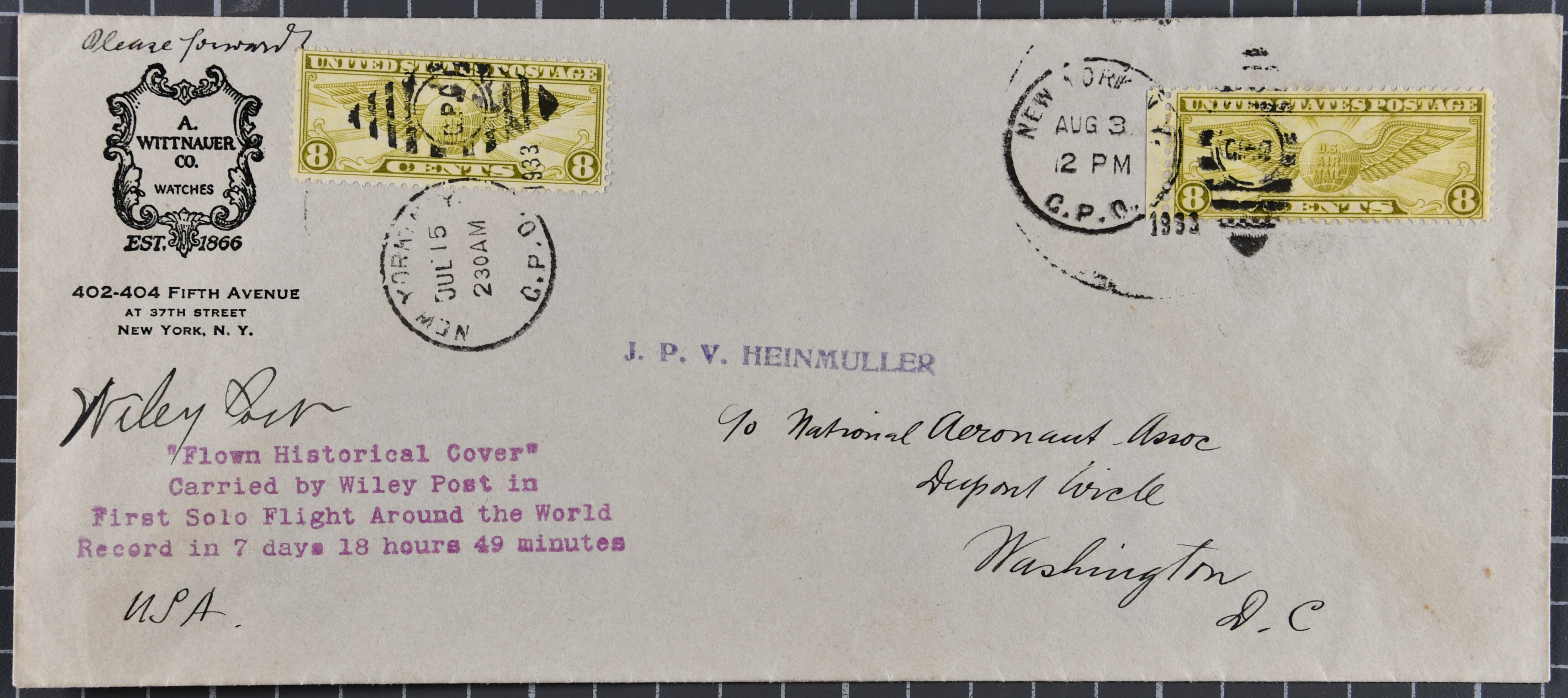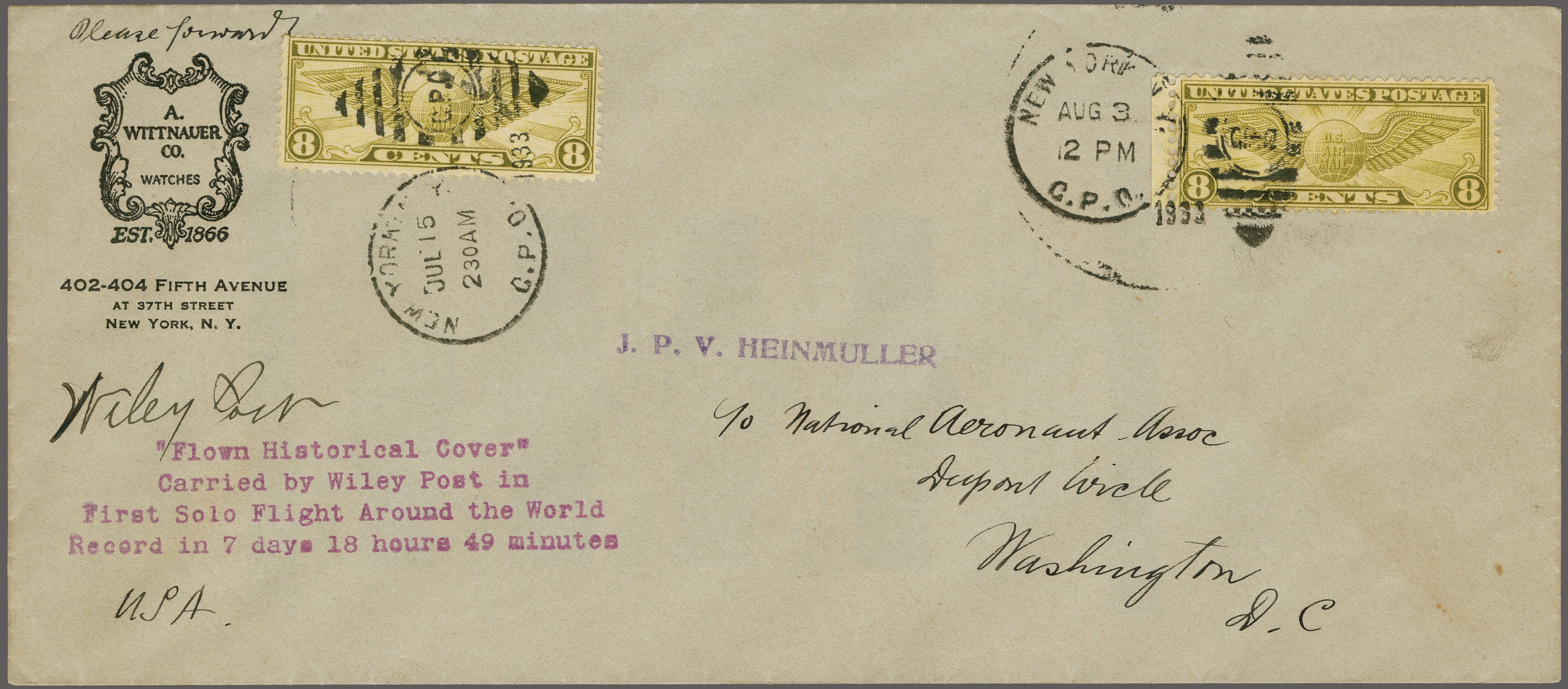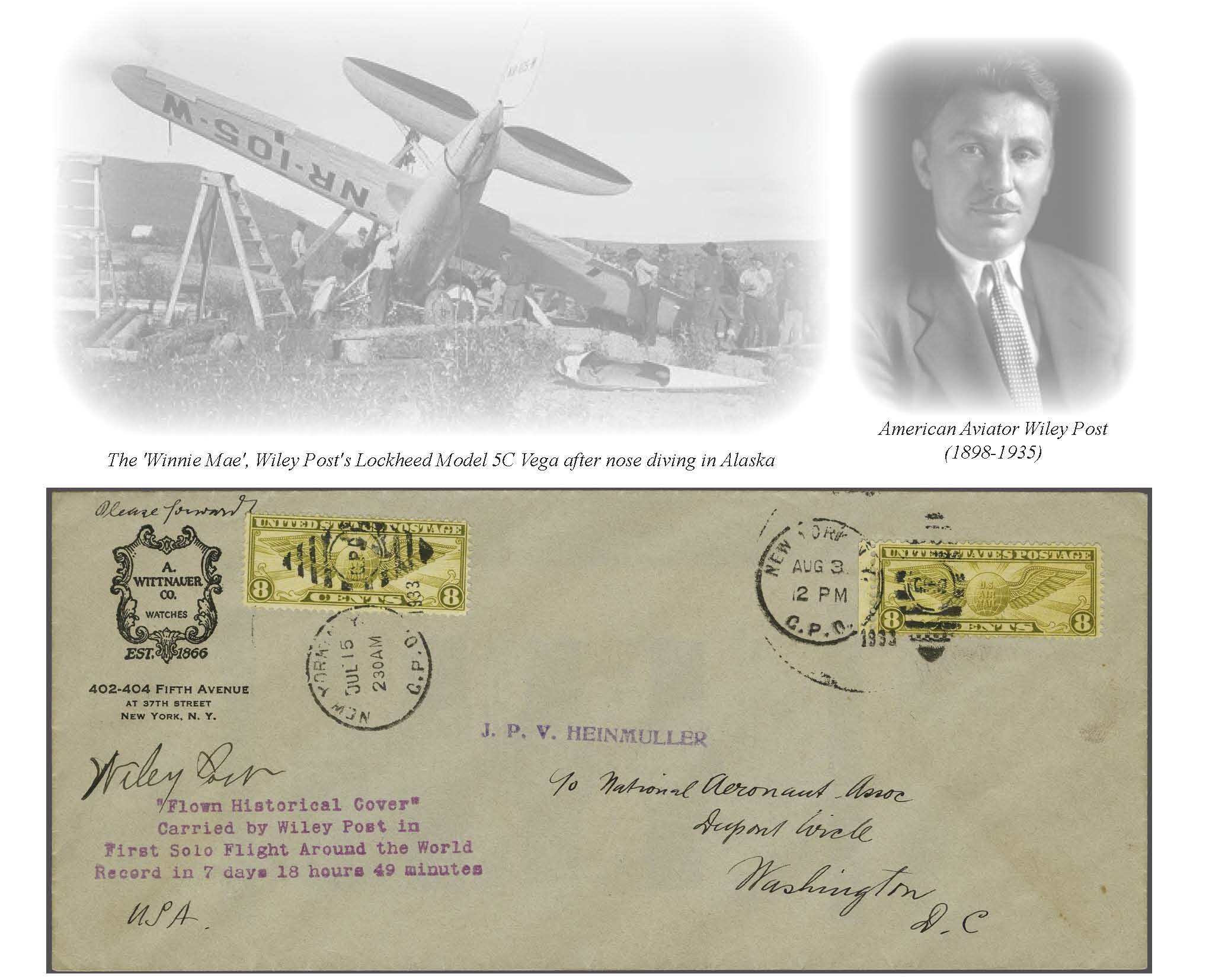 1756 cover imageWiley Post Round the World Flight from US to the East 1933 (July 15): Legal sized cover franked with 8c Airmail stamp, addressed to J. P. V. Heinmuller c/o National Aeronaut Association in Washington D.C., with an additional 8c added on arrival (Aug. 3) to mark the arrival despite of fact that the real date of arrival was July 22nd. The cover is signed by Wiley Post and is one of only 5 covers carried. The American pilot in his plane "Winnie Mae" succeeded the first solo flight around the world in his Lockheed Vega 5B “Winnie Mae” airplane and became the first person to circumnavigate Earth twice. He flew solo around the world, a distance of 15,596 miles in seven days, breaking the, Speed record of 15,596 miles in 186h and 49.5’ (115h and 36.5’ in the air). The record was unsurpassed for the next 5 years. The route was: New York - Berlin - Moscow - Irkutsk - Rukhlova Khabarovsk - Flat, Alaska (where he was forced down) - Fairbanks - Edmonton - New York. AAMC TO1183. (Image 1) (Image 2) (Image 3) (Image 4)