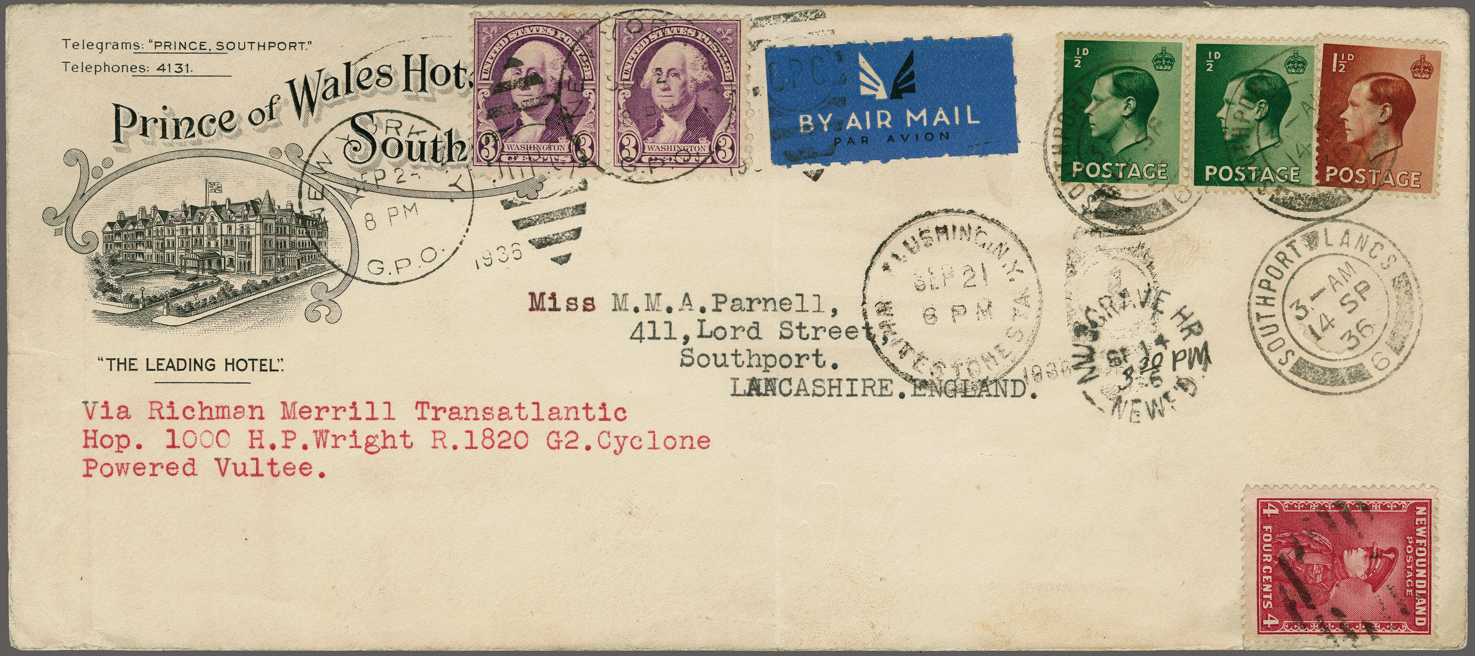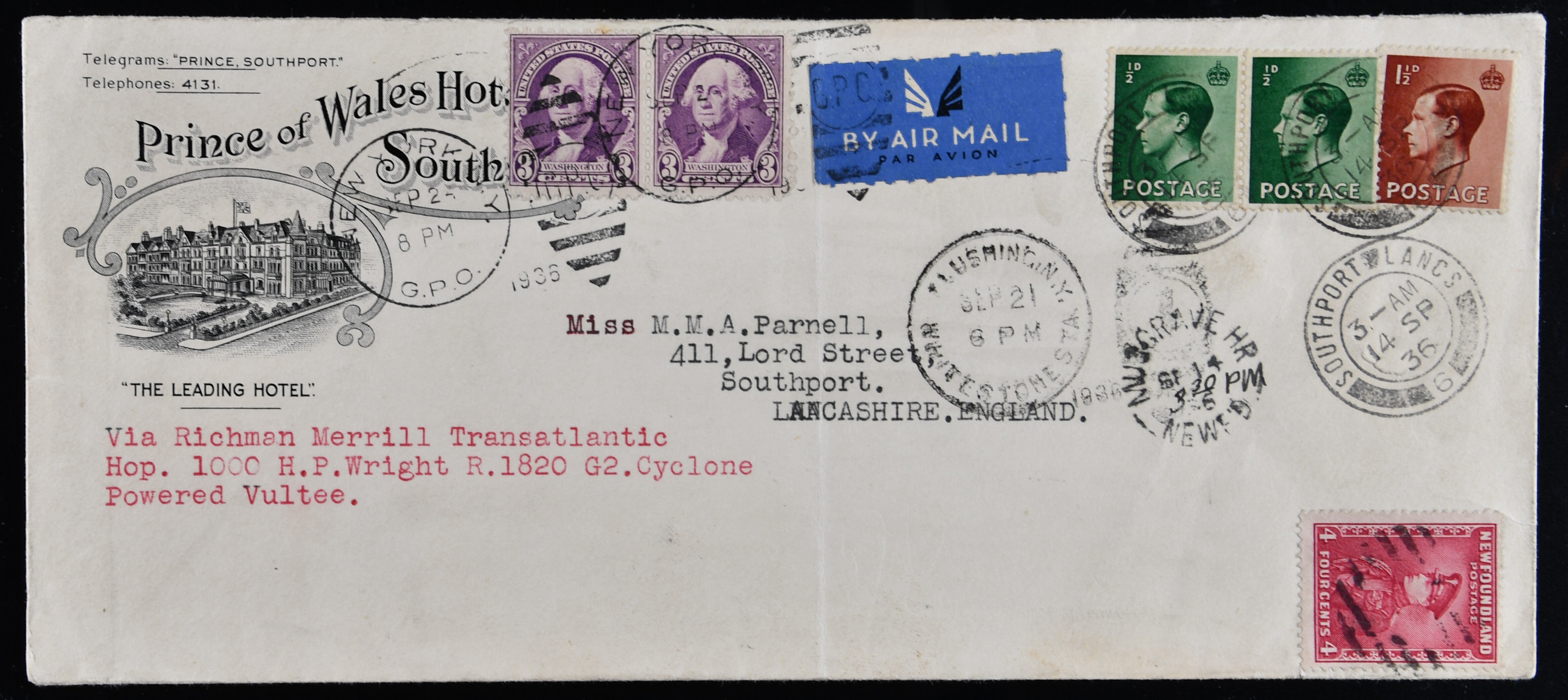 1766 cover imageHenry T.(Dick) Merrill and Harry Richman Transatlantic Flight New York - London 1936 (Sept. 2): 'Prince of Wales Hotel Southport' legal sized cover franked with UK 2 ½ d stamped in Southport, England September 14th, postmarked and franked with 4c the same date in Musgrave Harbour, Newfoundland and finally franked with 6c and backstamped on September 21st in New York. Envelope with filing fold, not affecting adhesives. A fine and rare item as there were only few covers privately distributed AAMC TO1266. (Image 1) (Image 2)
