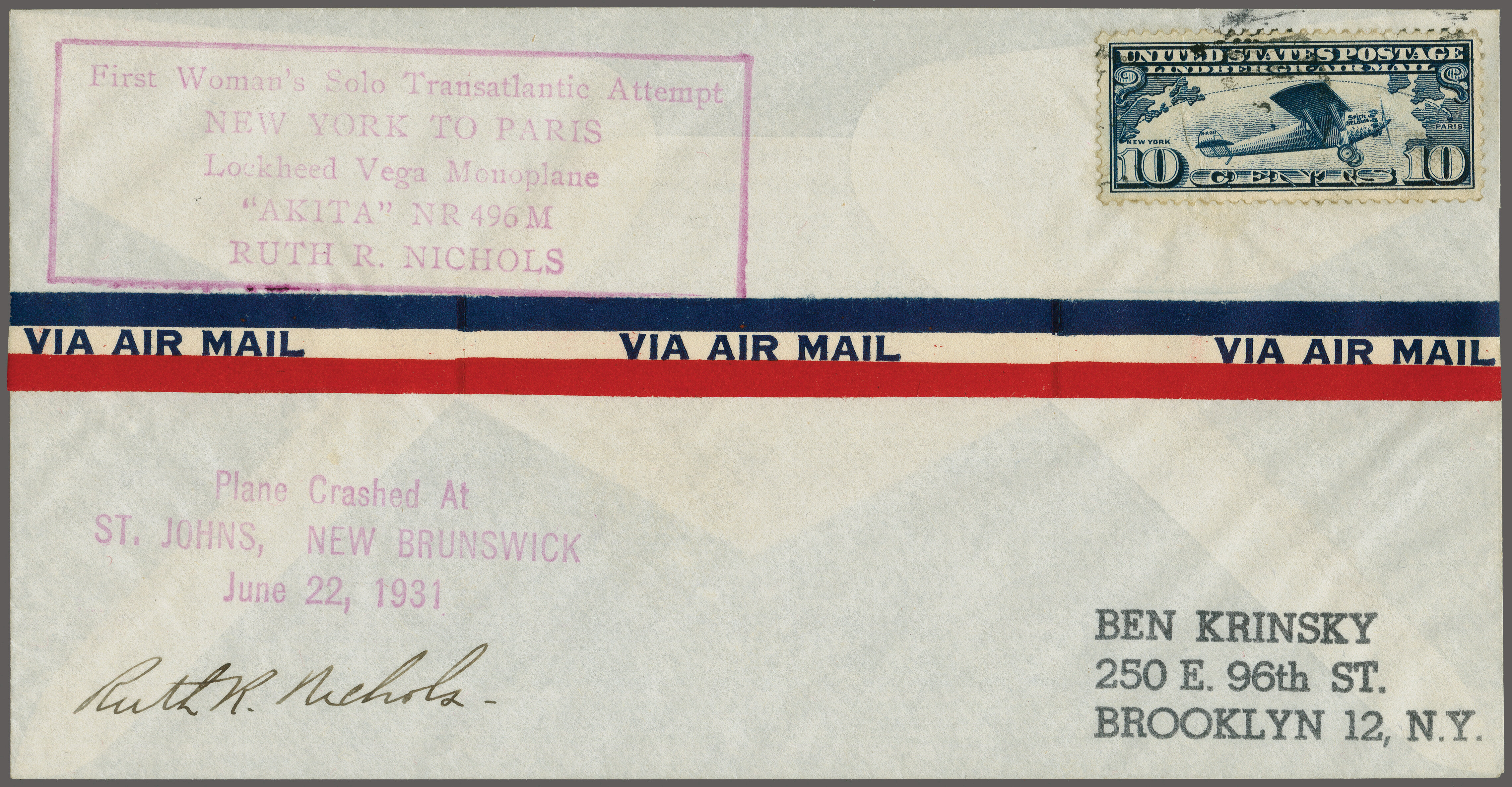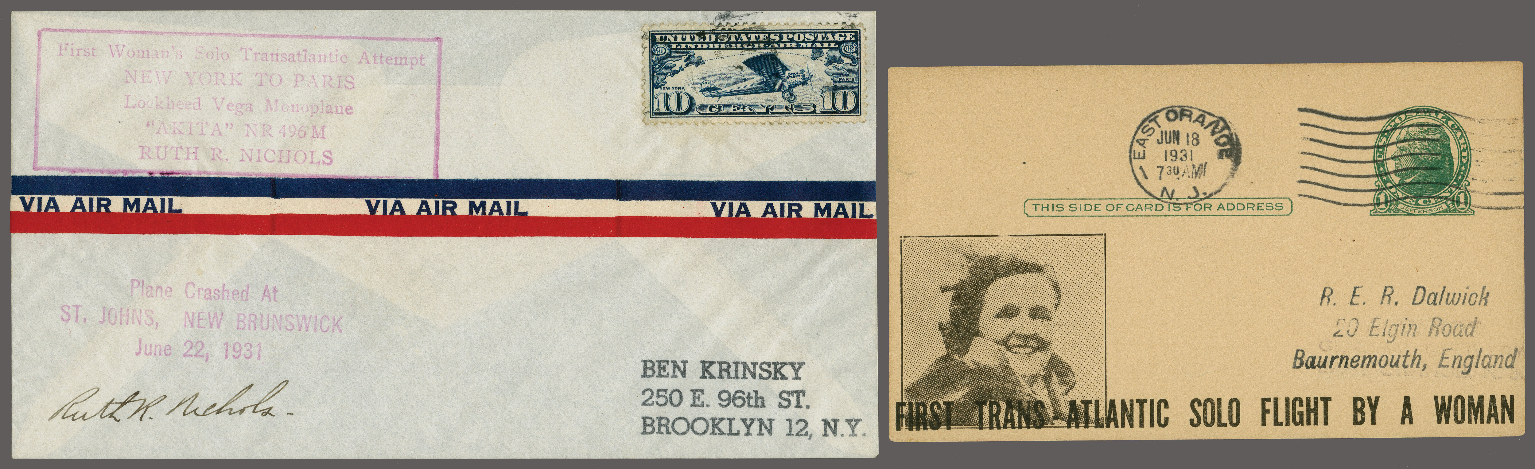 1752 cover imageAttempted Solo Flight by Ruth R. Nichols 1931 (June 22): Cover with the two violet cachets "First Woman's Solo Transatlantic Attempt New York to Paris" and "Plane crashed at St.John's, New Brunswick", signed by the aviatrix, and was severely injured at take-off, further 1c. card ovpted. FIRST TRANS-ATLANTIC SOLO FLIGHT BY A WOMAN' cancelled "East Orange N.J. Jun 18 1931" to England. (Image 1) (Image 2)