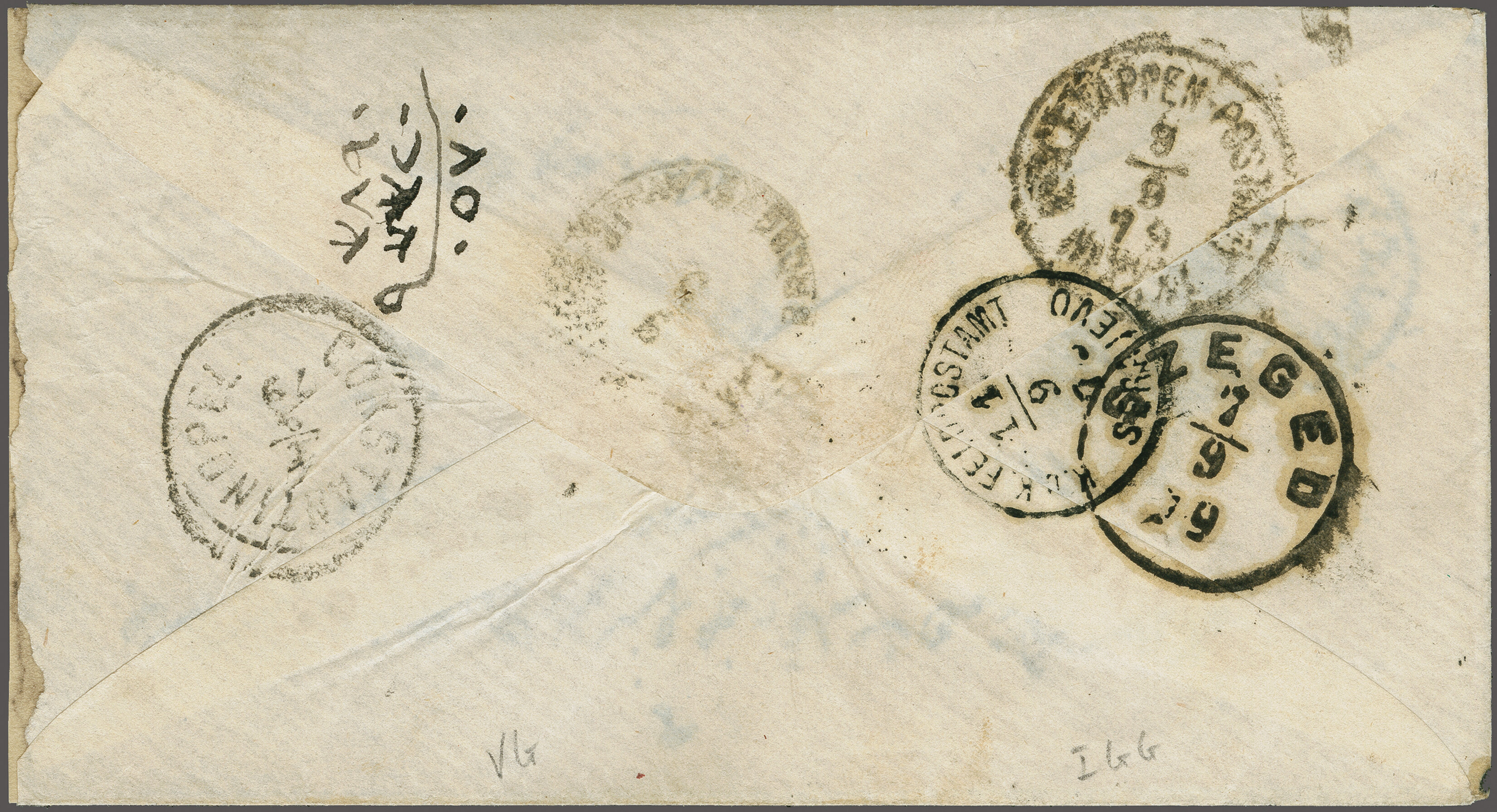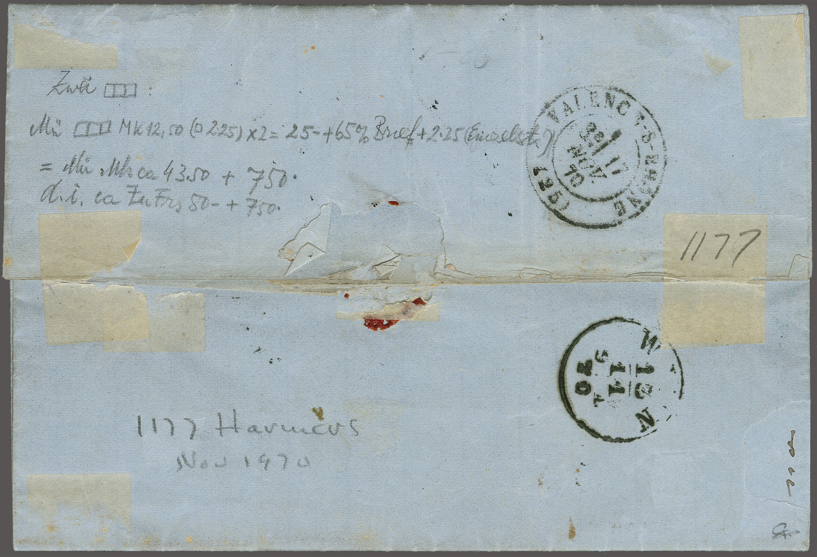 (Tchilinghirian fig. 864) with italic "P.D." in black. Vienna transit (Nov 12), thence presumably sent via Geneva and Marseille rather than the usual Strassbourg exchange being closed due to the Franco-Prussian War with Valence arrival cds (June 17).