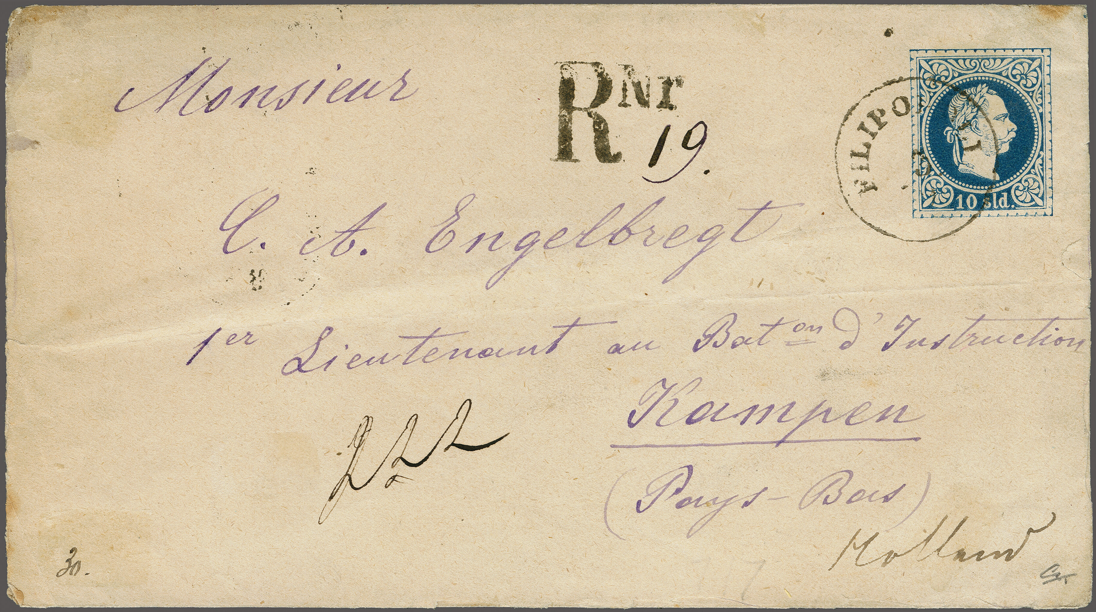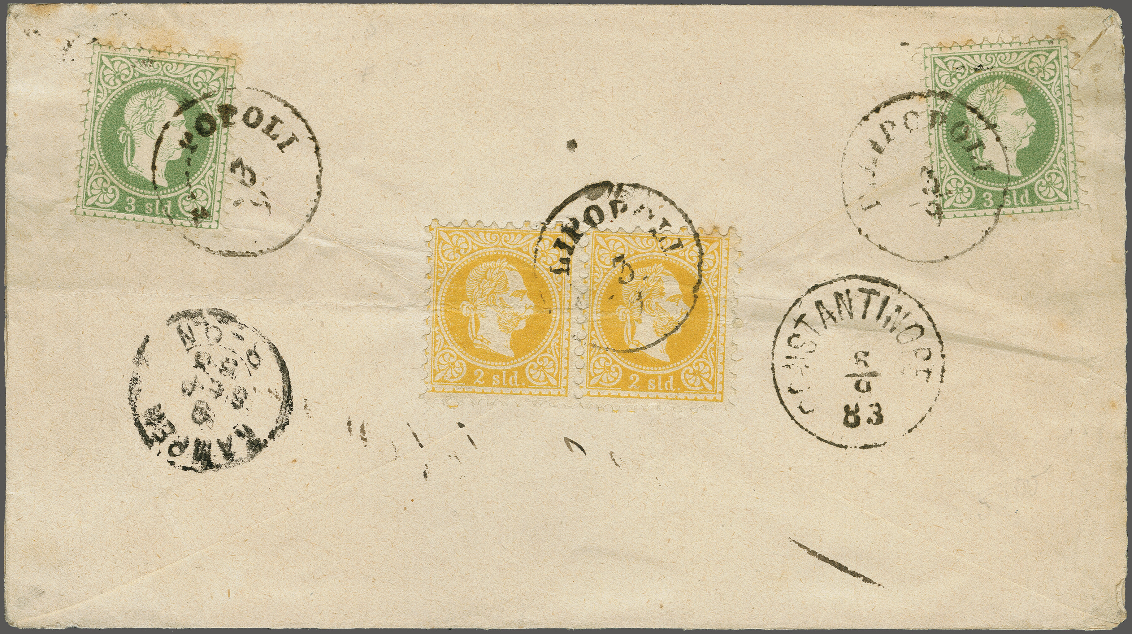 Austrian P.O. 1867: 2 s. yellow in a horizontal pair and two single 3 s. green used on reverse of 10 soldi blue postal stationery envelope sent registered to Kampen, Netherlands tied by "FILIPOPOLI" circular datestamps (Sept