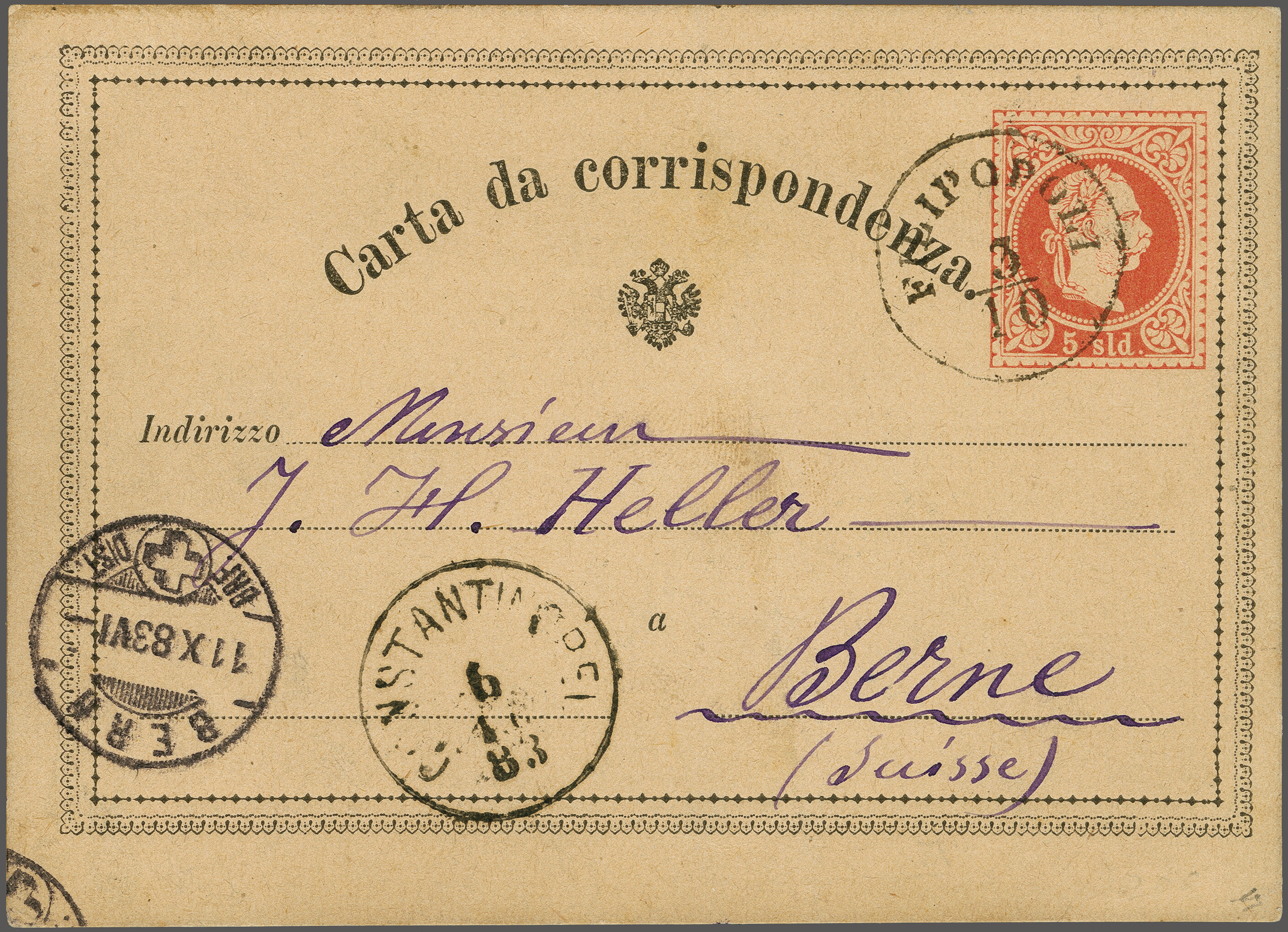 Austrian P.O. 1867: 5 s. red postal stationery card, a used example to Berne, Switzerland cancelled by "FILIPOPOLI" circular datestamp (Oct 3) in black (Tchilinghirian fig. 868). Constantinople transit (Oct 6) and Berne