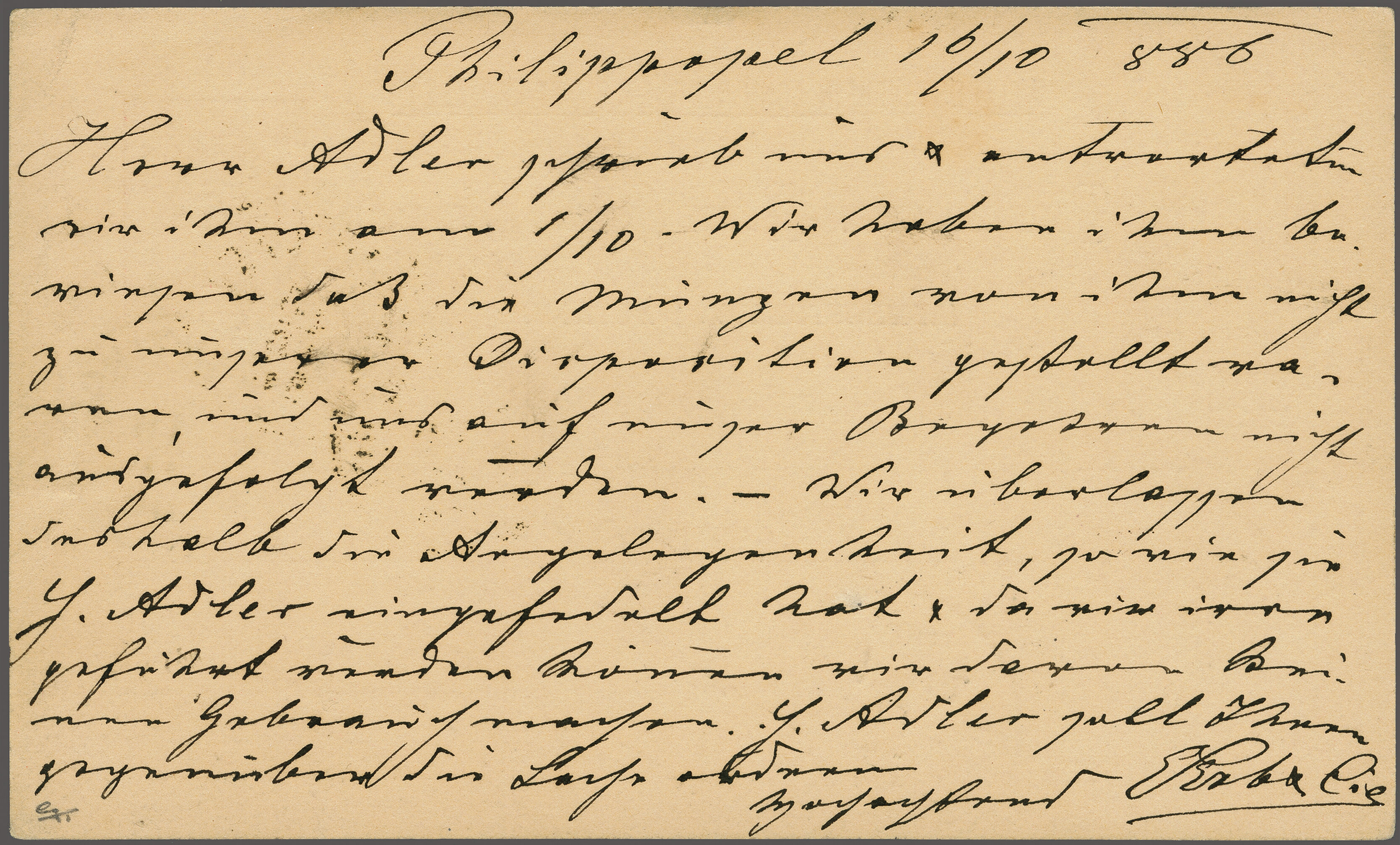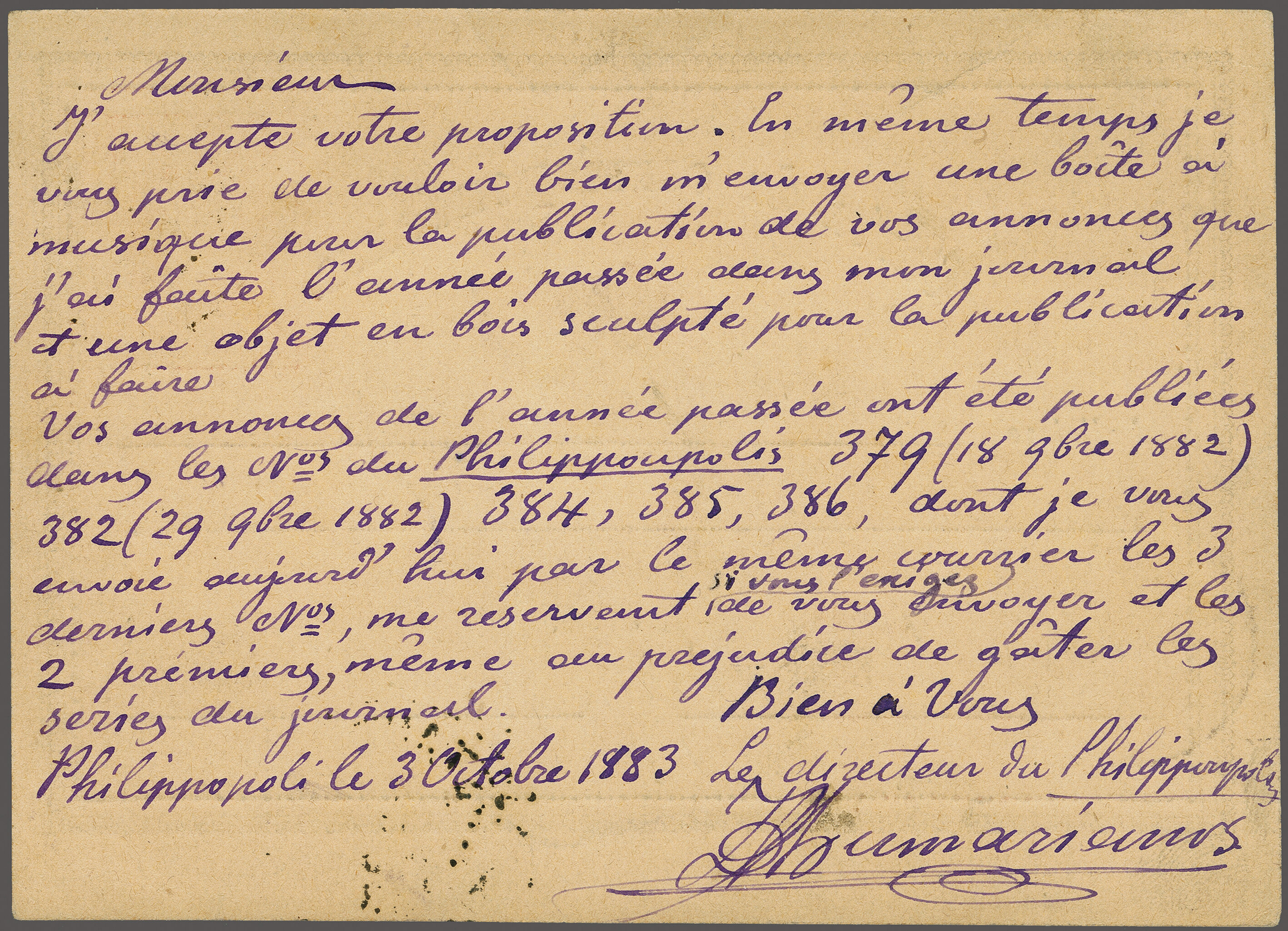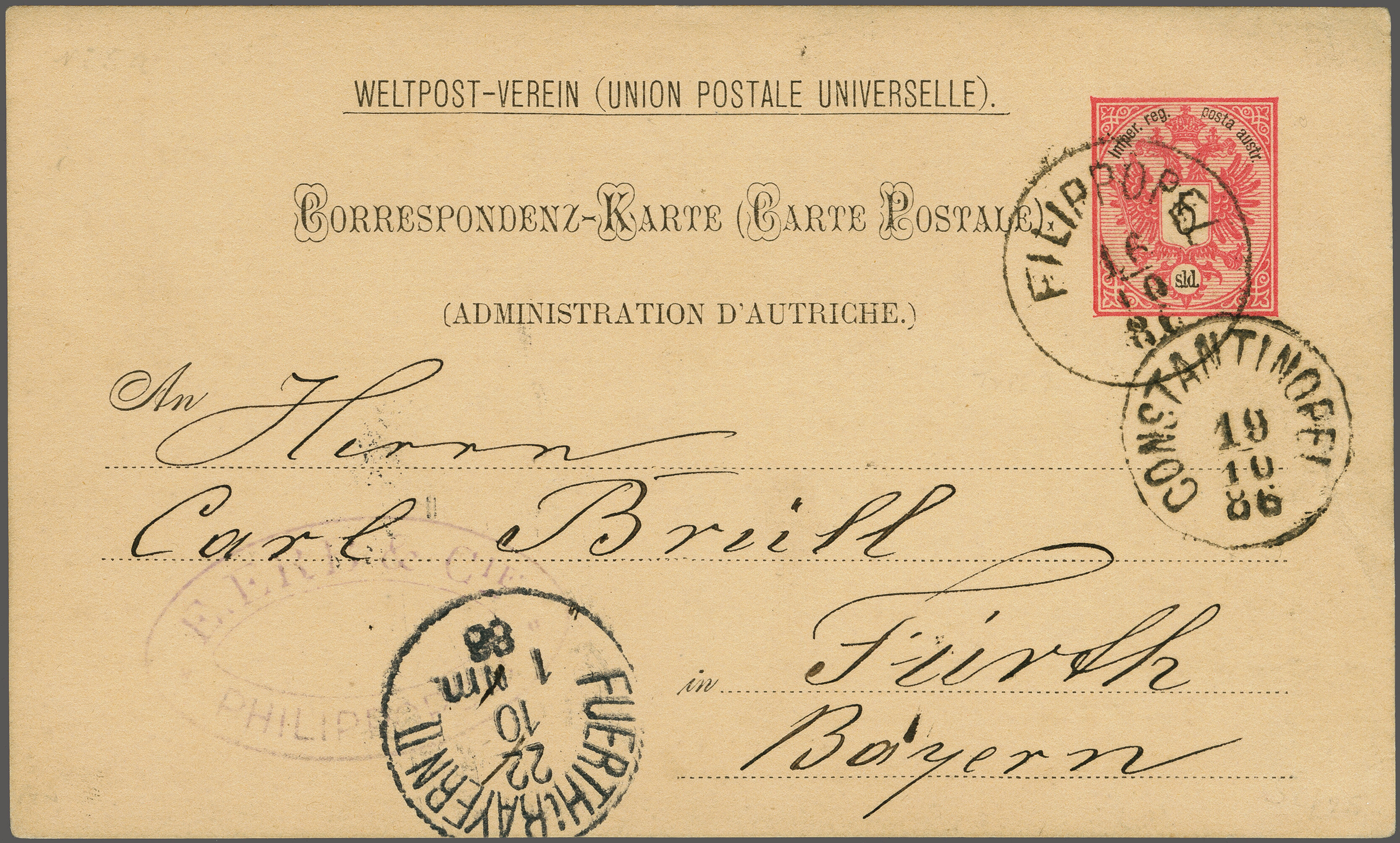 Austrian P.O. 1883: 5 s. red & black postal stationery card, used to Bavaria cancelled by fine strike of three line "FILIPPOPEL" circular datestamp (Oct 16) in black (Tchilinghirian fig. 869). Austrian P.O. Constantinople