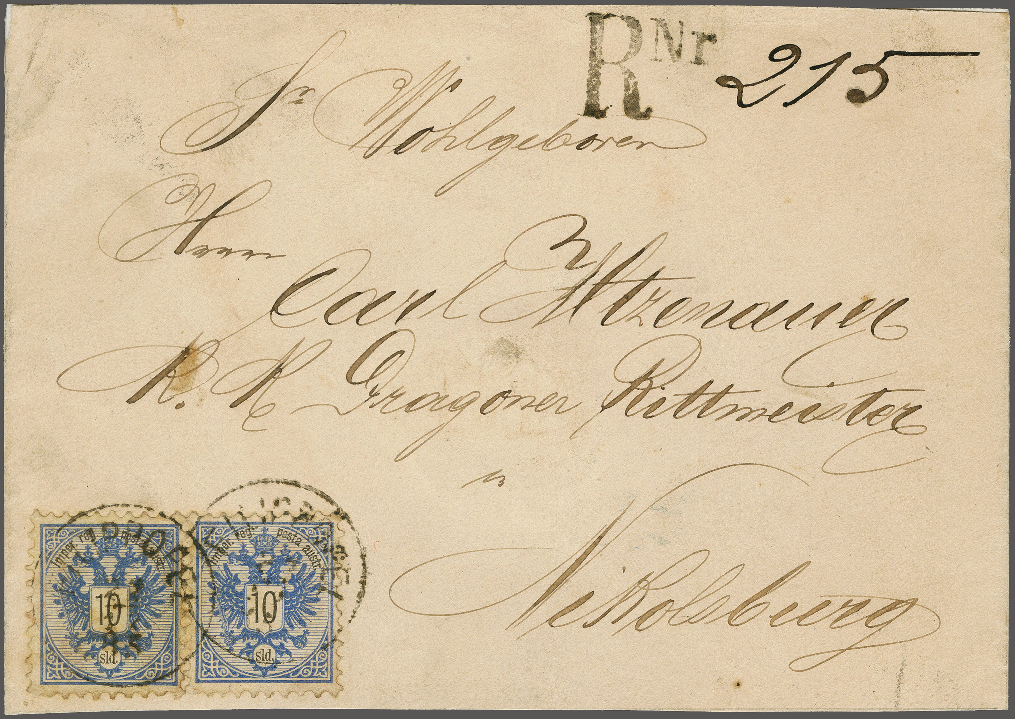Austrian P.O. 1883: 10 s. blue & black, two examples used on 1885 registered cover to Nikolsberg tied fine strikes of three line "FILIPPOPEL" circular datestamps (Dec 22) in black (Tchilinghirian fig. 869) with "RNr."
