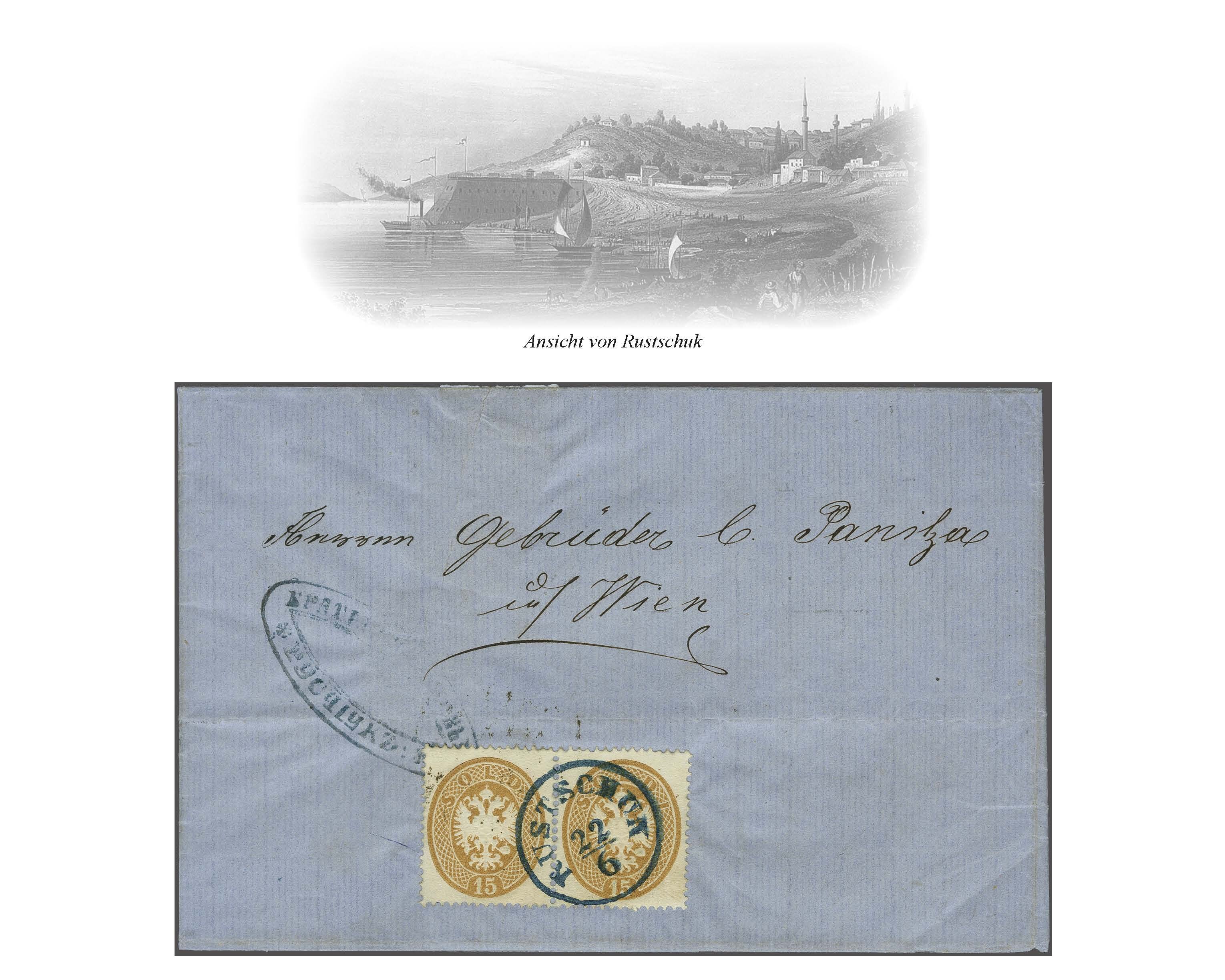 Rustchuk, Austrian P.O. 1863: Arms 15 s. brown in a horizontal pair, perf. 14, used on 1864 entire letter to Vienna, cancelled by bold strike "RUSTSCHUK" circular datestamp (June 22) struck in blue (Tchilinghirian fig. 876).