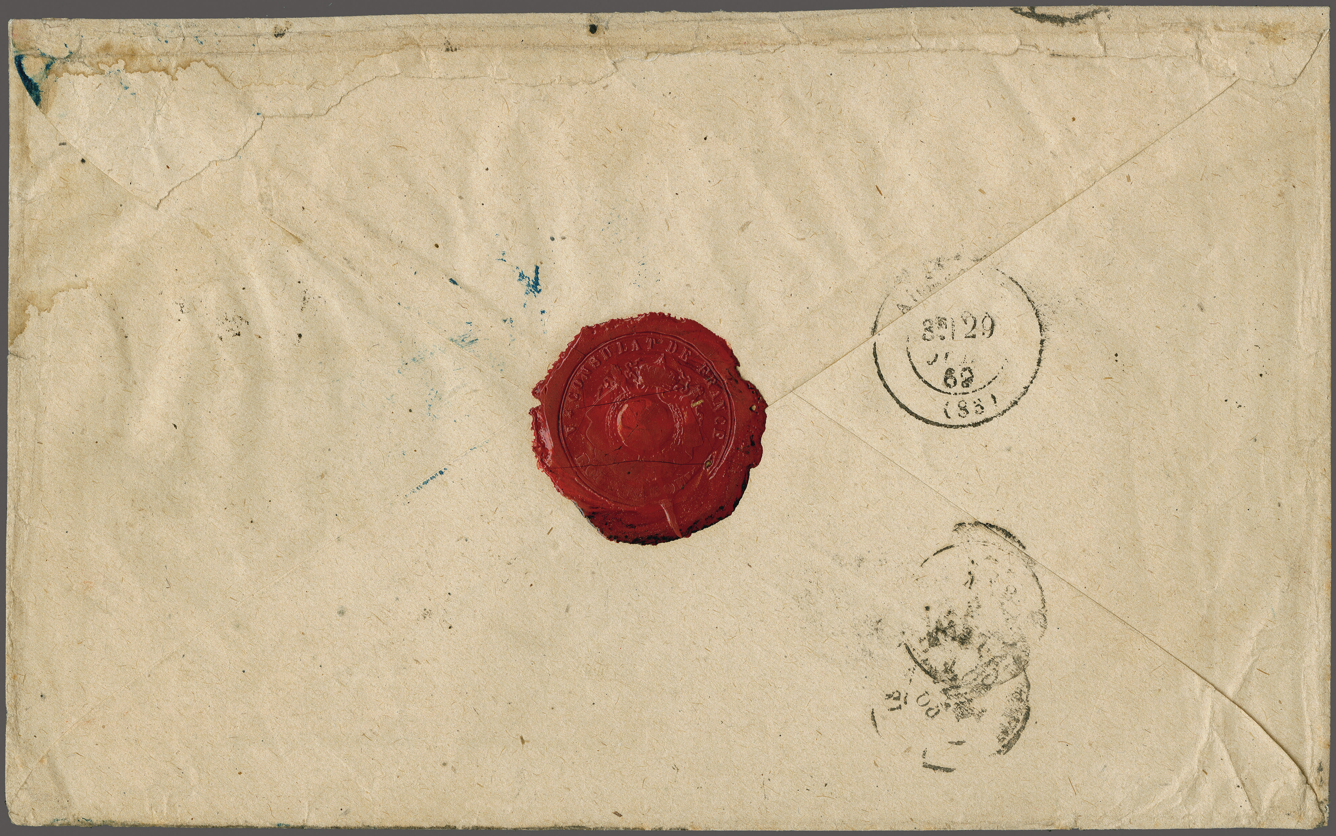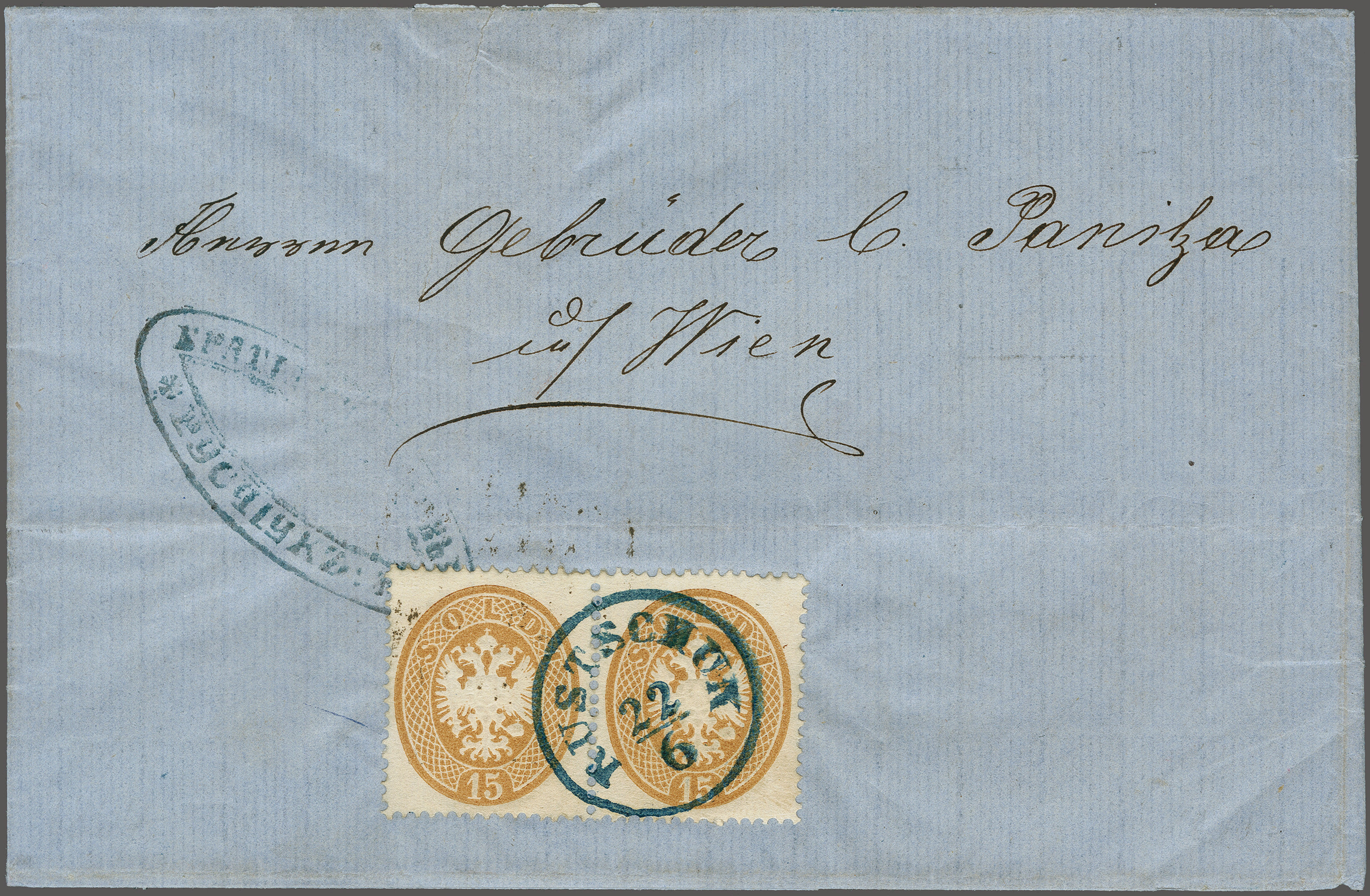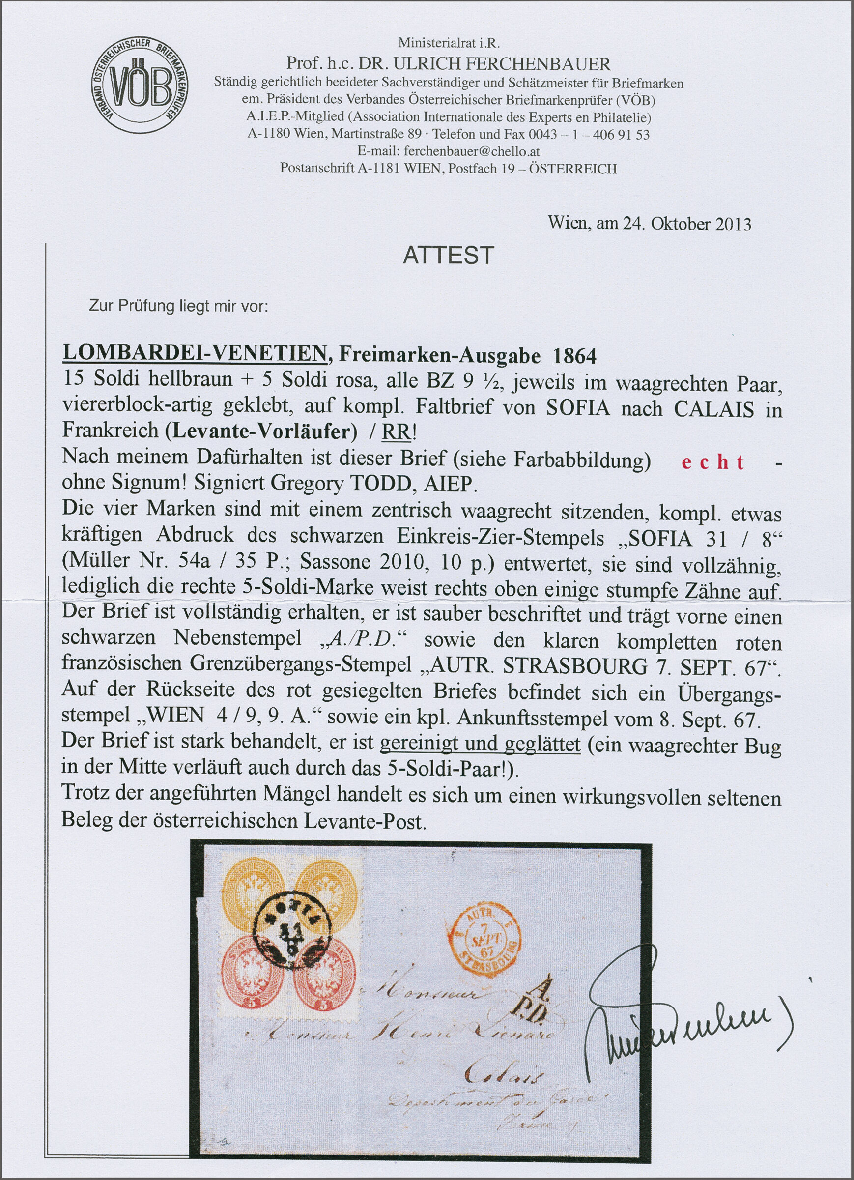 one of just two known covers utilising the 1864 5 soldi and the sole cover known bearing the 1864 15 soldi from Sofia. Exceptional and rare. Cert. Ferchenbauer (2013). Provenance: Collection Hans Smith, Corinphila, Zurich, 31 Oct 2013, lot 1421.