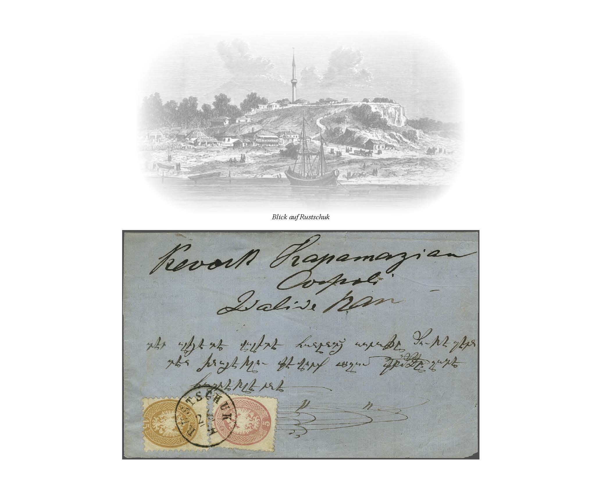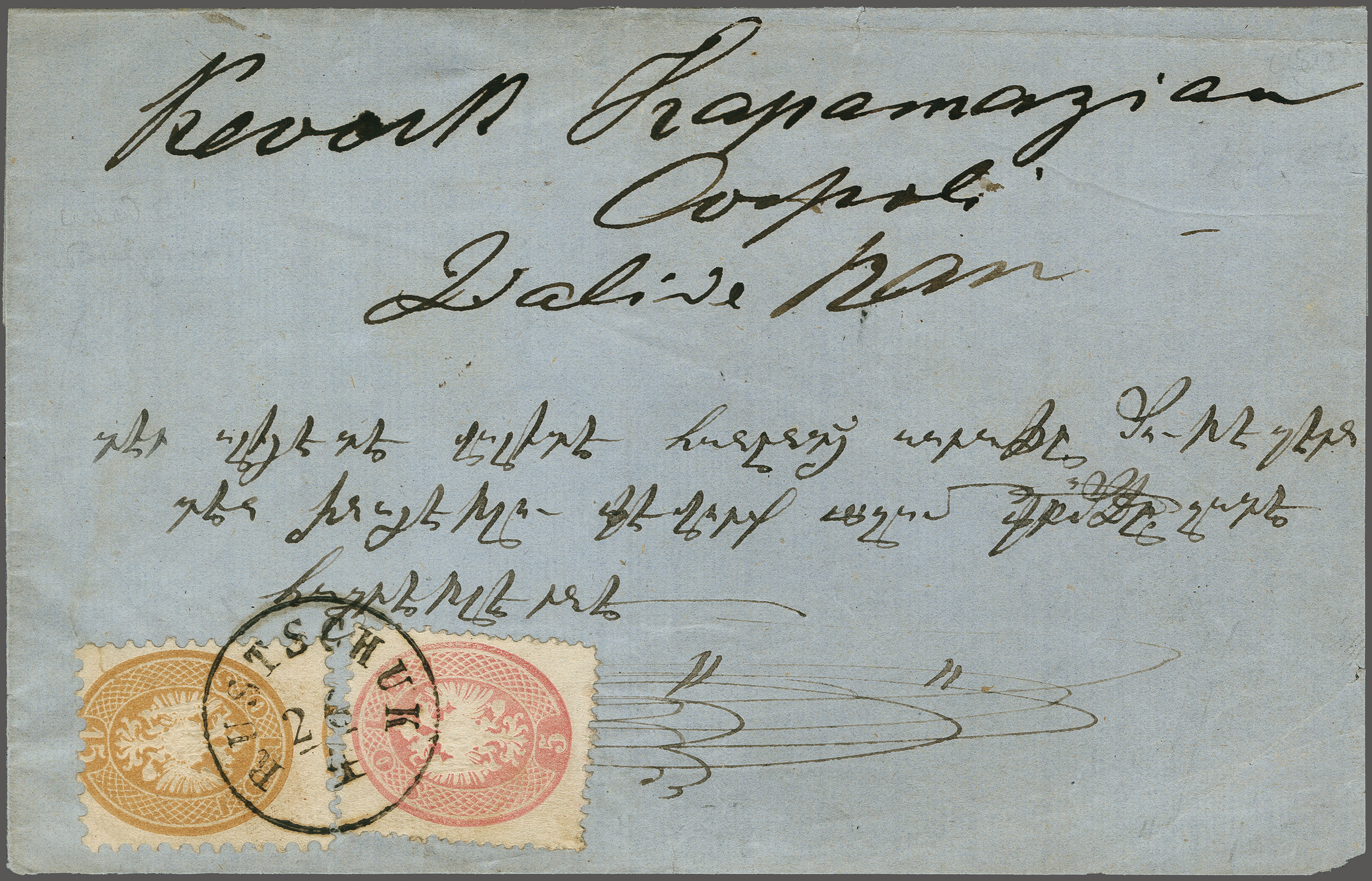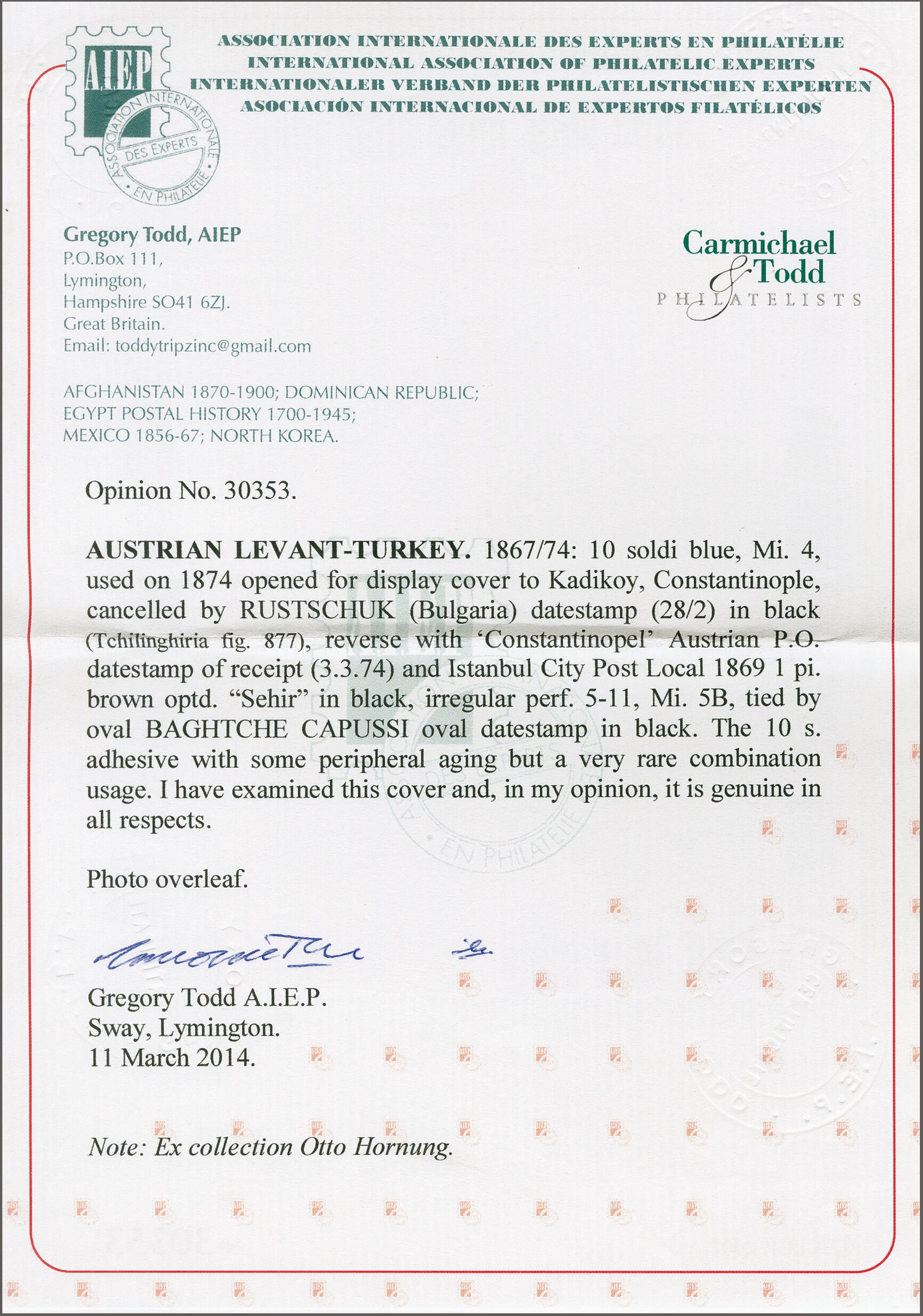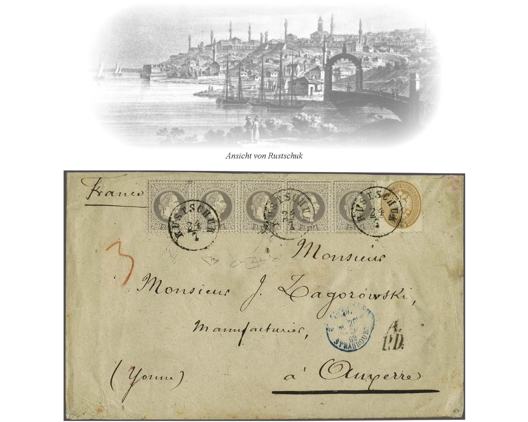 Austrian P.O. 1867: 10 s. blue, a single example with some aging, used on 1874 cover to Kadikoy, Constantinople tied by "RUSTSCHUK" circular datestamp (Feb 28) in black (Tchilinghirian fig. 876). Austrian P.O. arrival cds