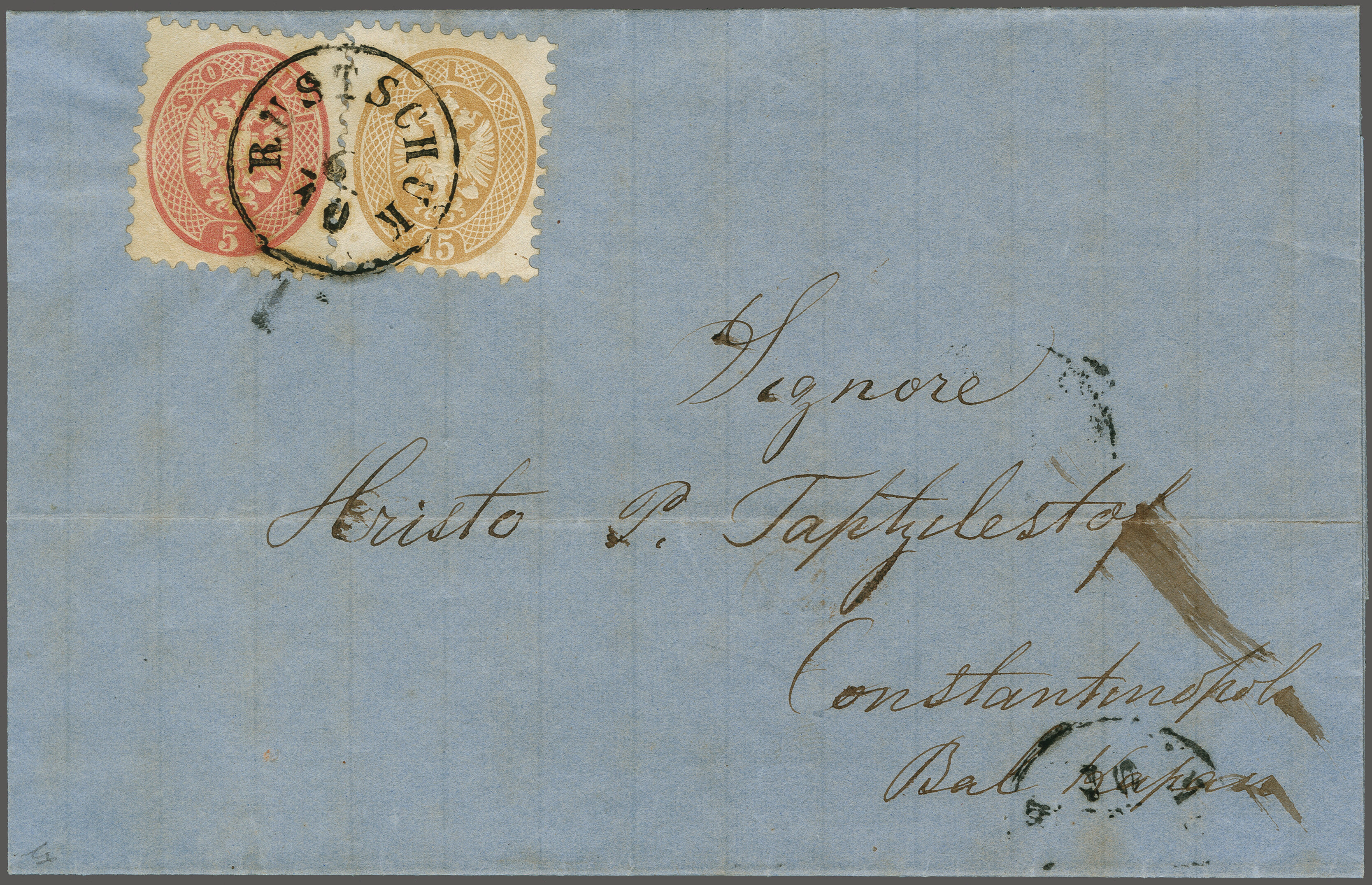 Austrian P.O. 1863: Arms 5 s. rose, perf. 14 and 1864 15 s. brown, perf. 9½ used on bilingually addressed circa 1865 cover to Constantinople tied by "RUSTSCHUK" circular datestamp (April 26) in black (Tchilinghirian fig. 877).