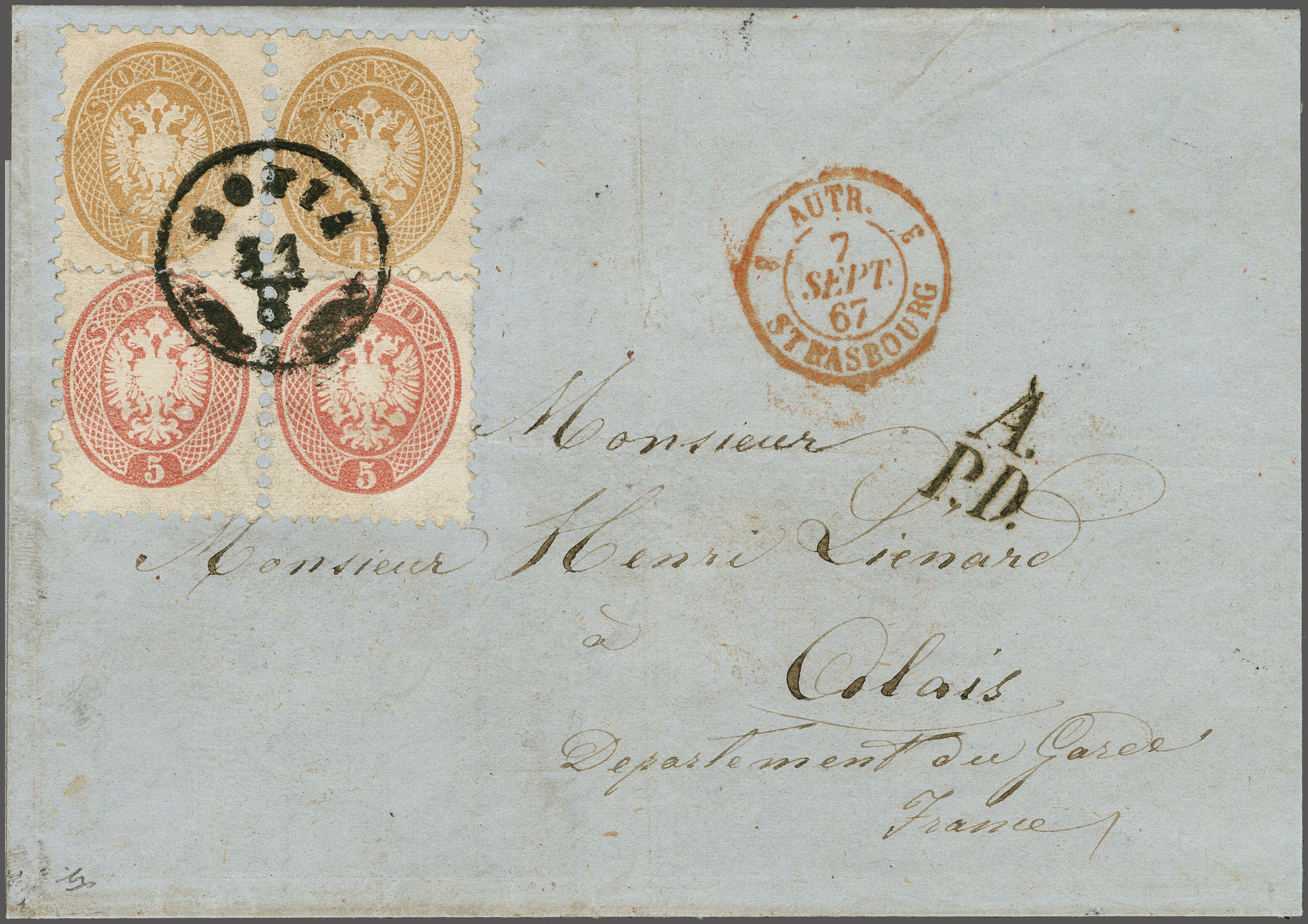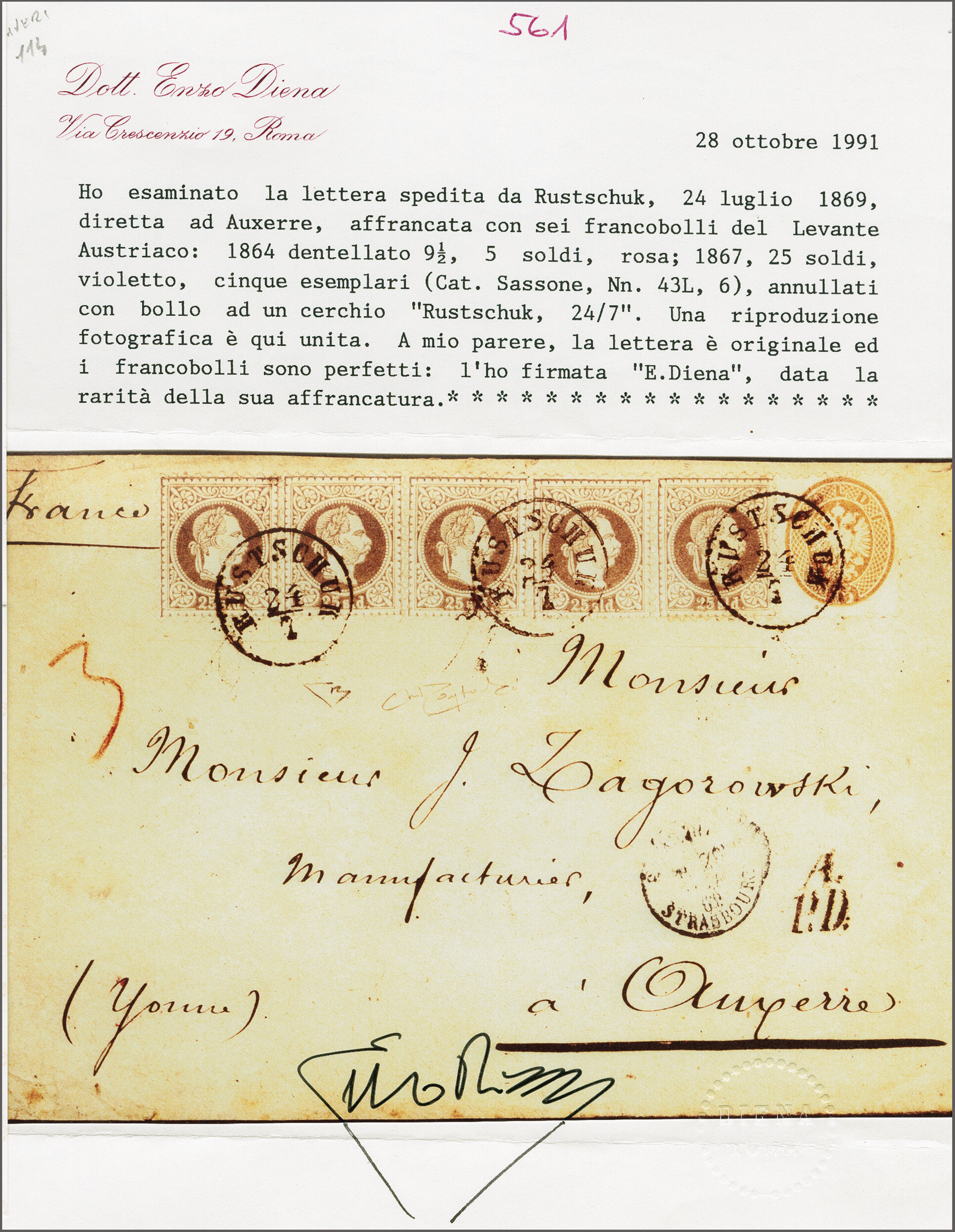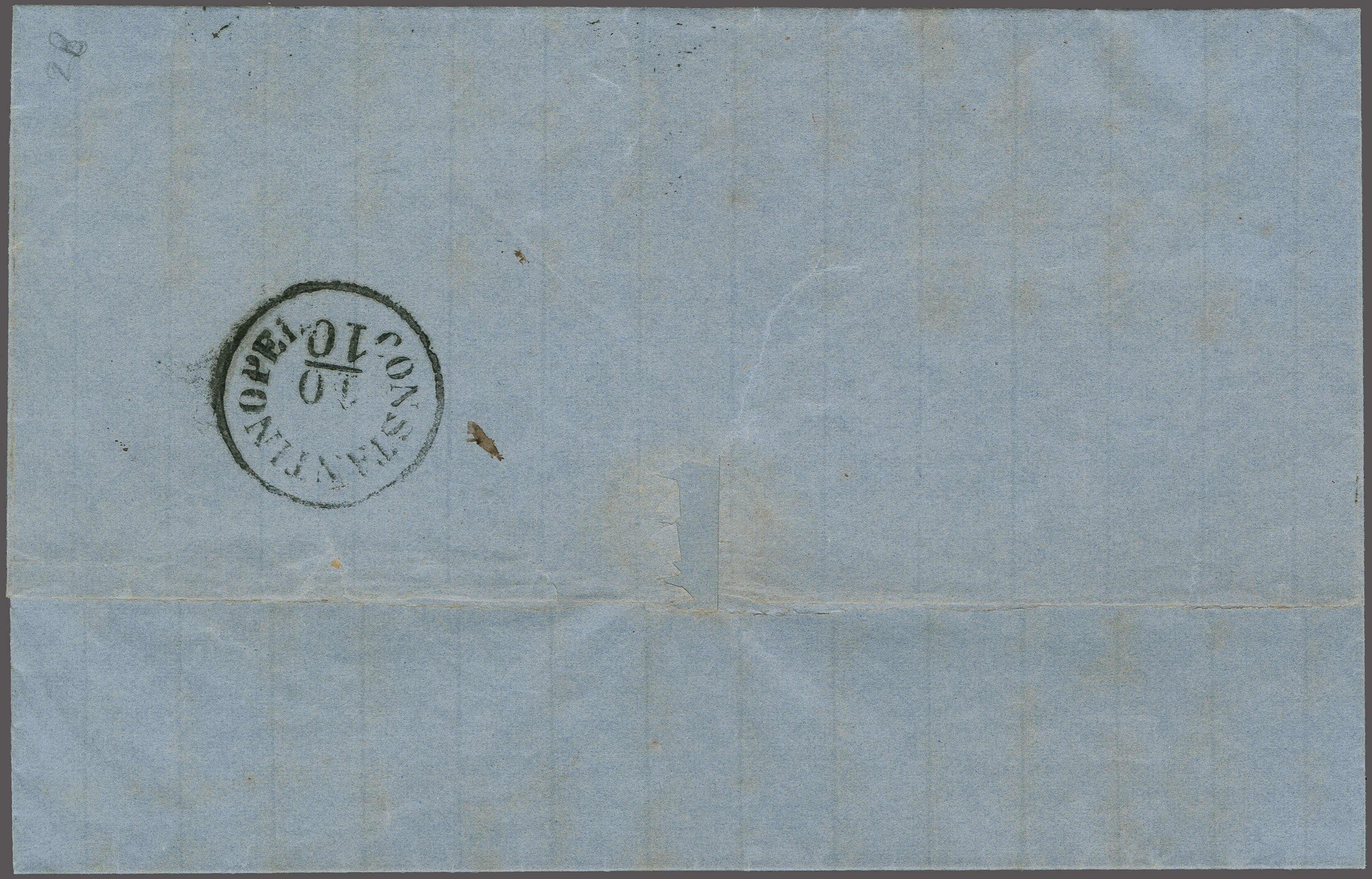 (Tchilinghirian fig. 864). "A/PD" handstamp in black below and Strassbourg entry datestamp (Sept 7) in red on obverse, reverse with Vienna (Sept 4) transit. Illustrated in "Austrian Post Offices in the Levant" by Hans Smith on page 160. Faults but