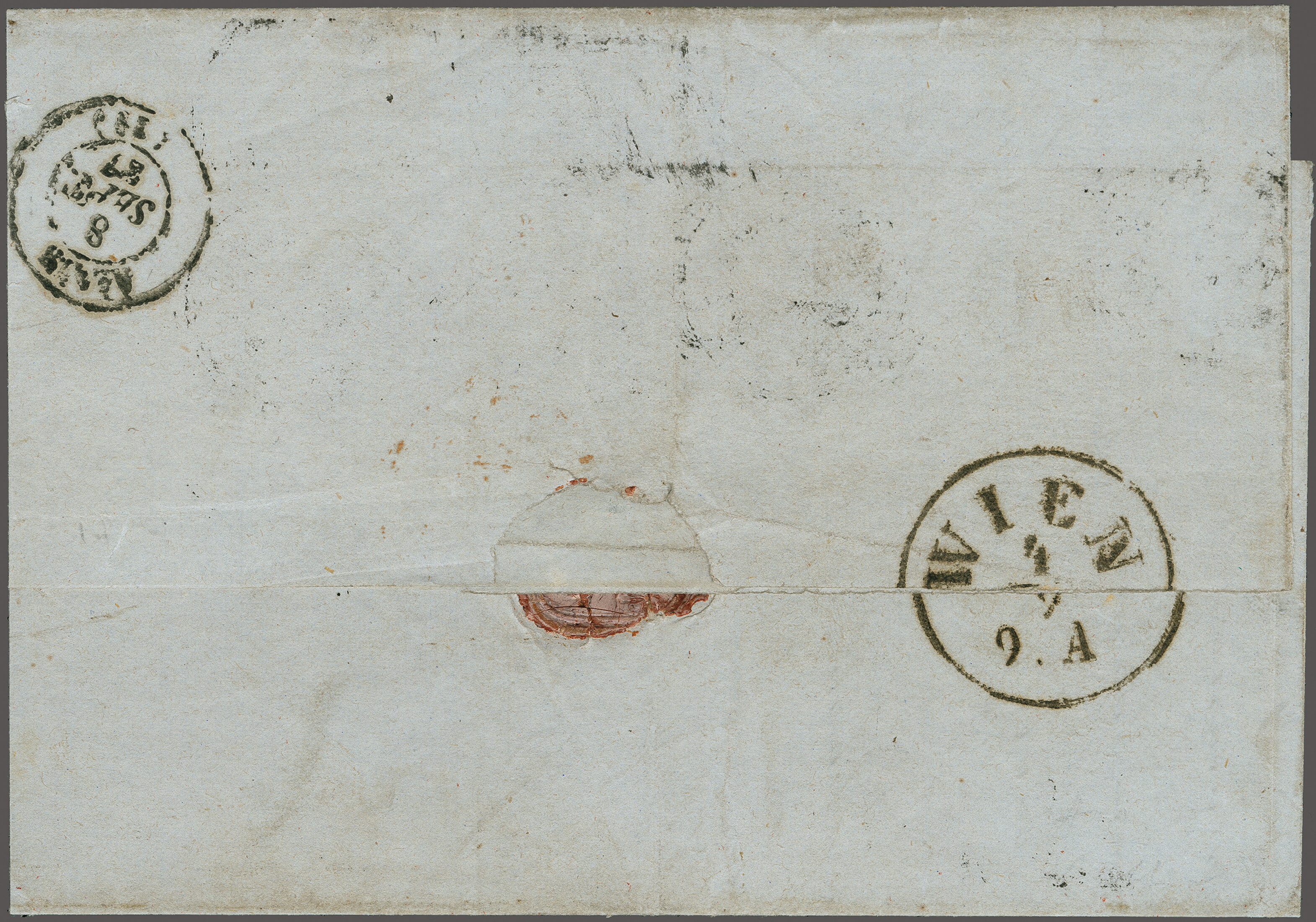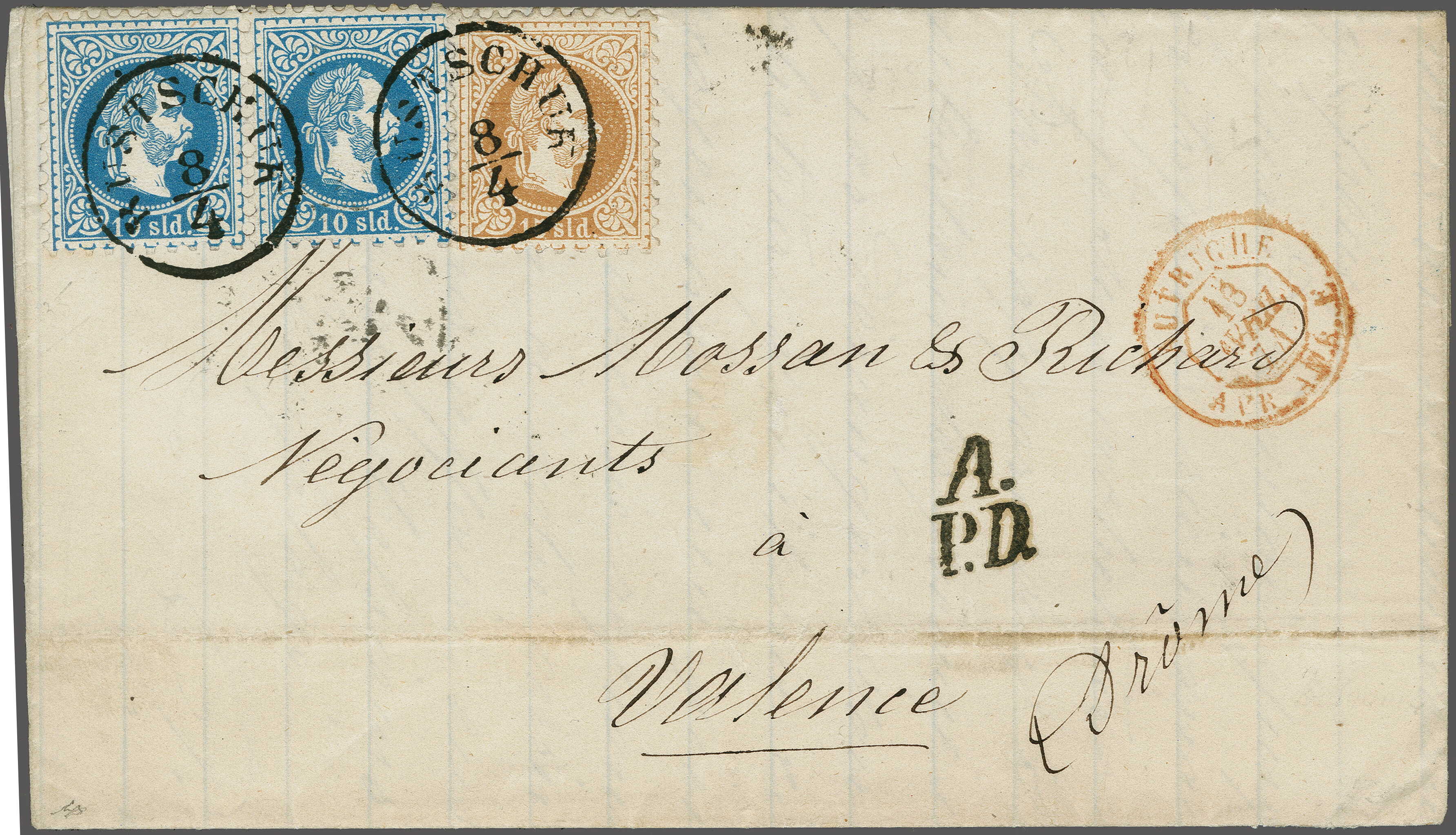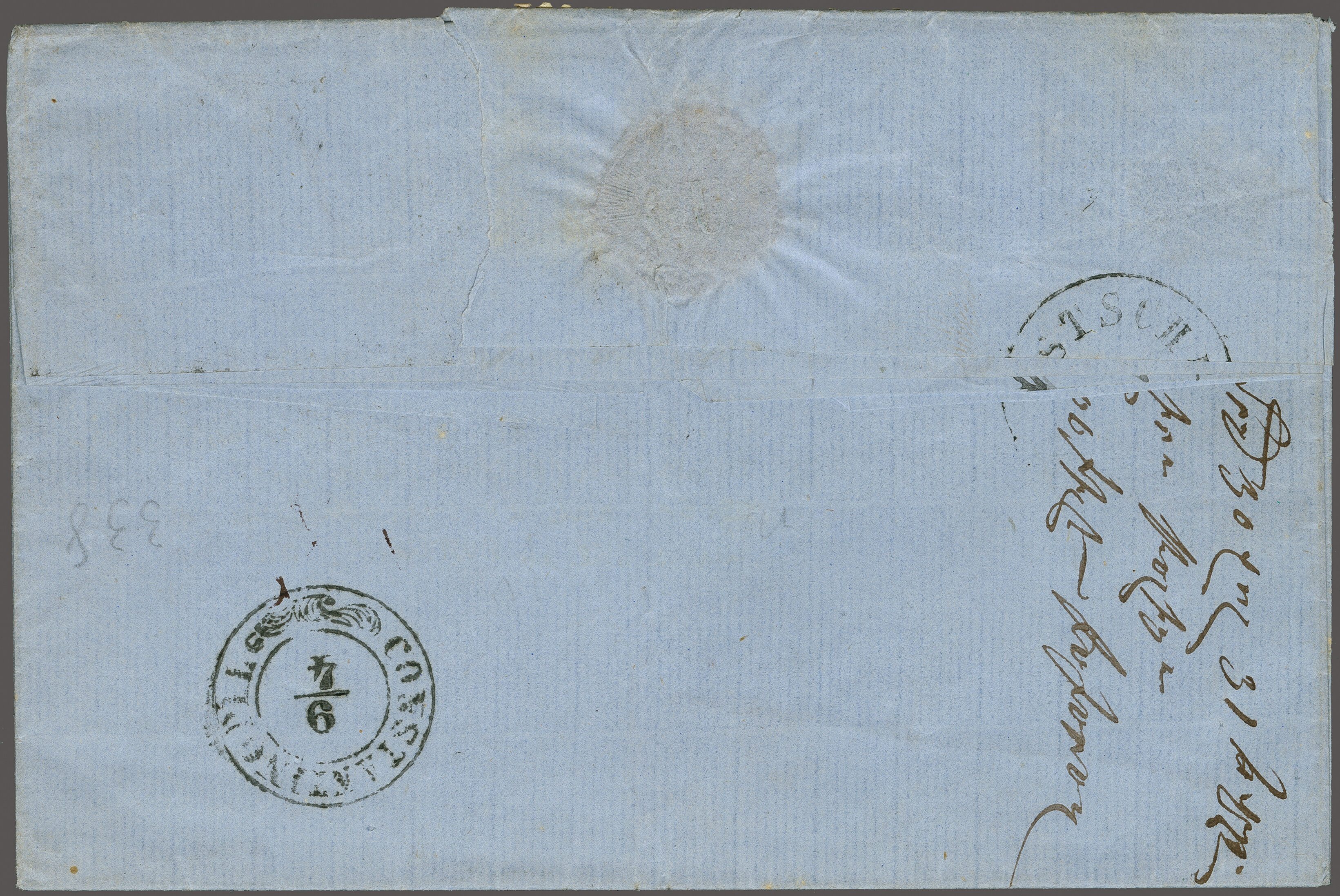(Tchilinghirian fig. 864). "A/PD" handstamp in black below and Strassbourg entry datestamp (Sept 7) in red on obverse, reverse with Vienna (Sept 4) transit. Illustrated in "Austrian Post Offices in the Levant" by Hans Smith on page 160. Faults but