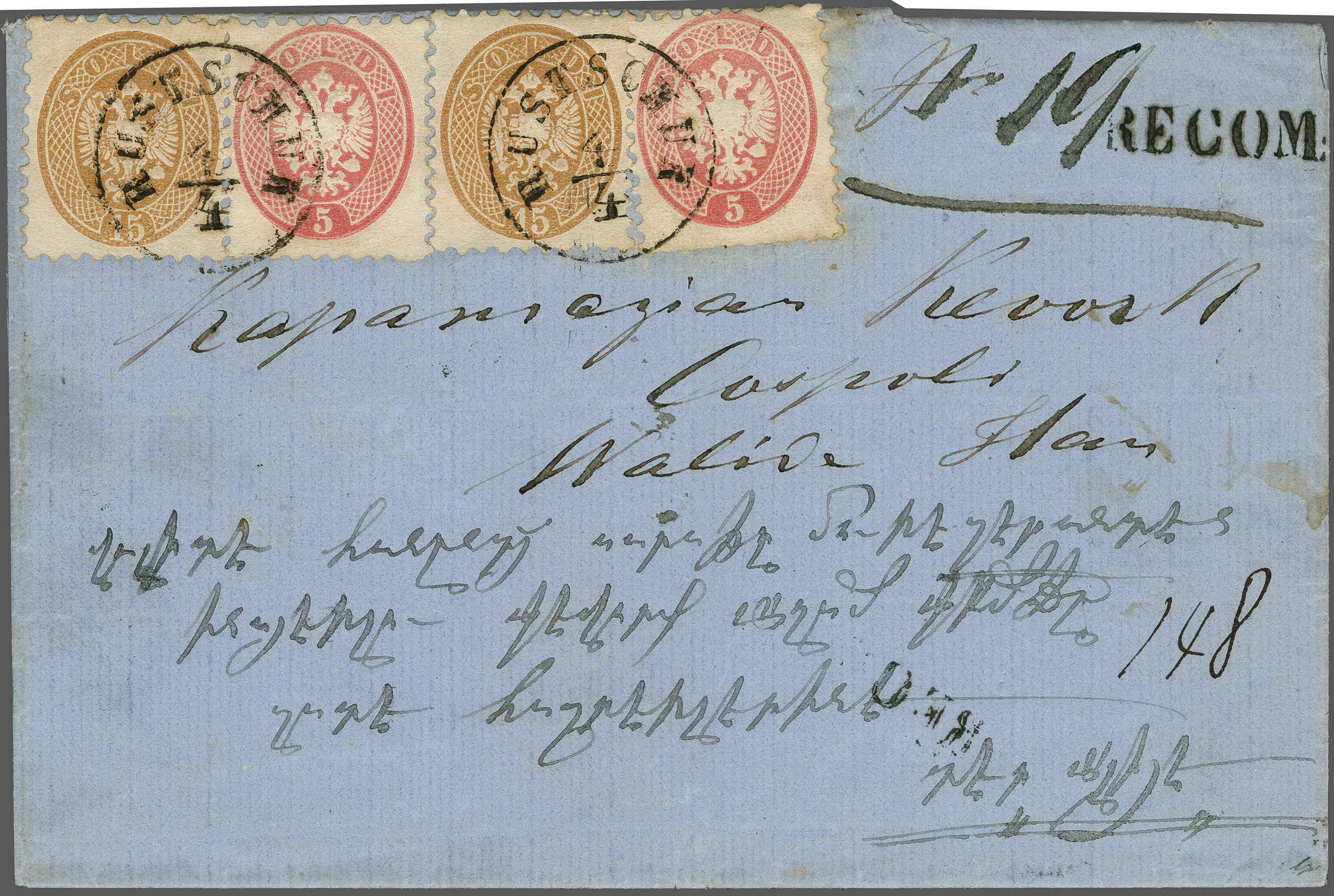 Austrian P.O. 1864: Arms 5 s. rose and 15 s. brown, perf. 9½, two examples of each value used on bilingually addressed 1866 entire letter sent registered to Constantinople tied by "RUSTSCHUK" circular datestamps (April 4) in